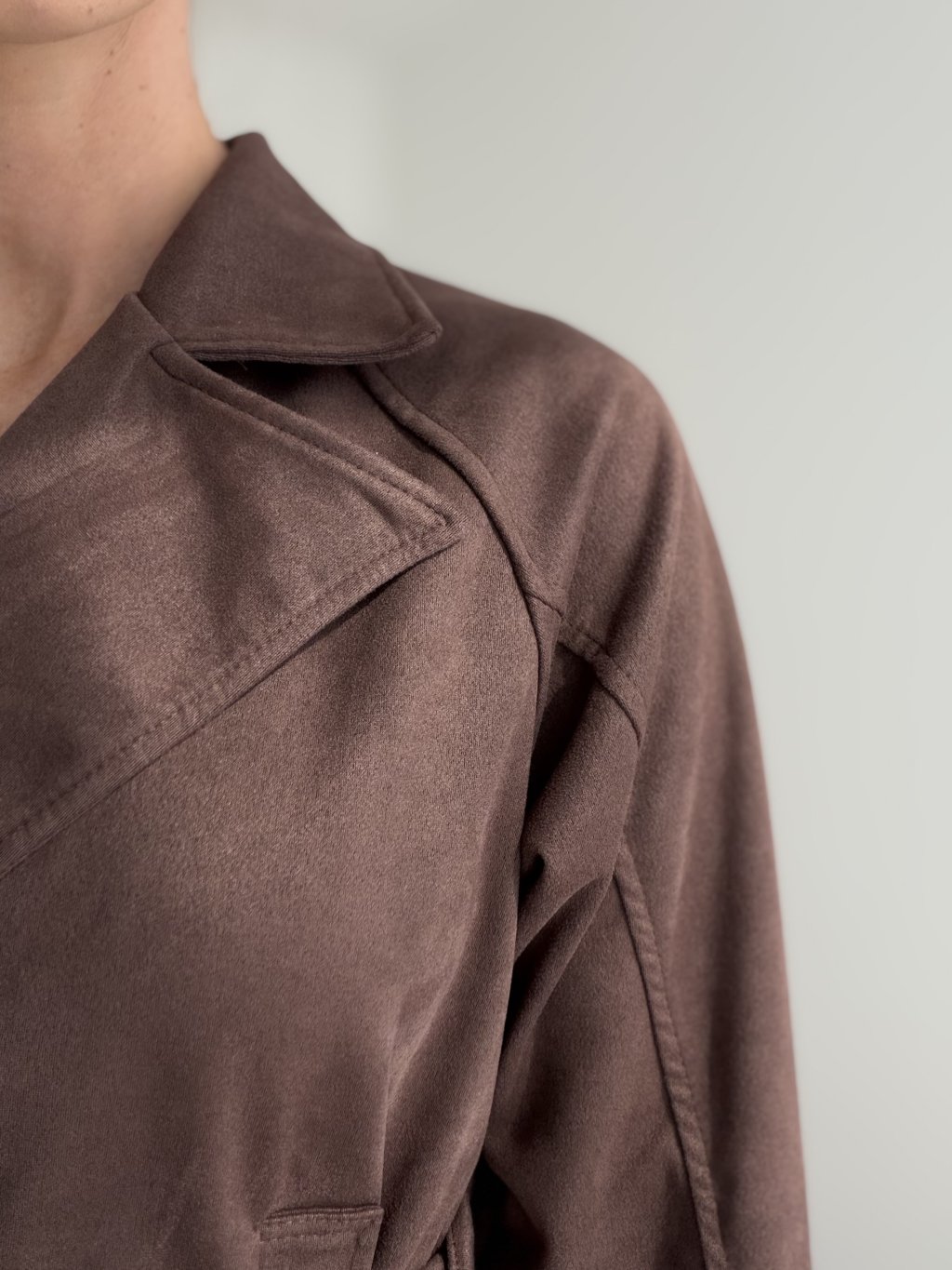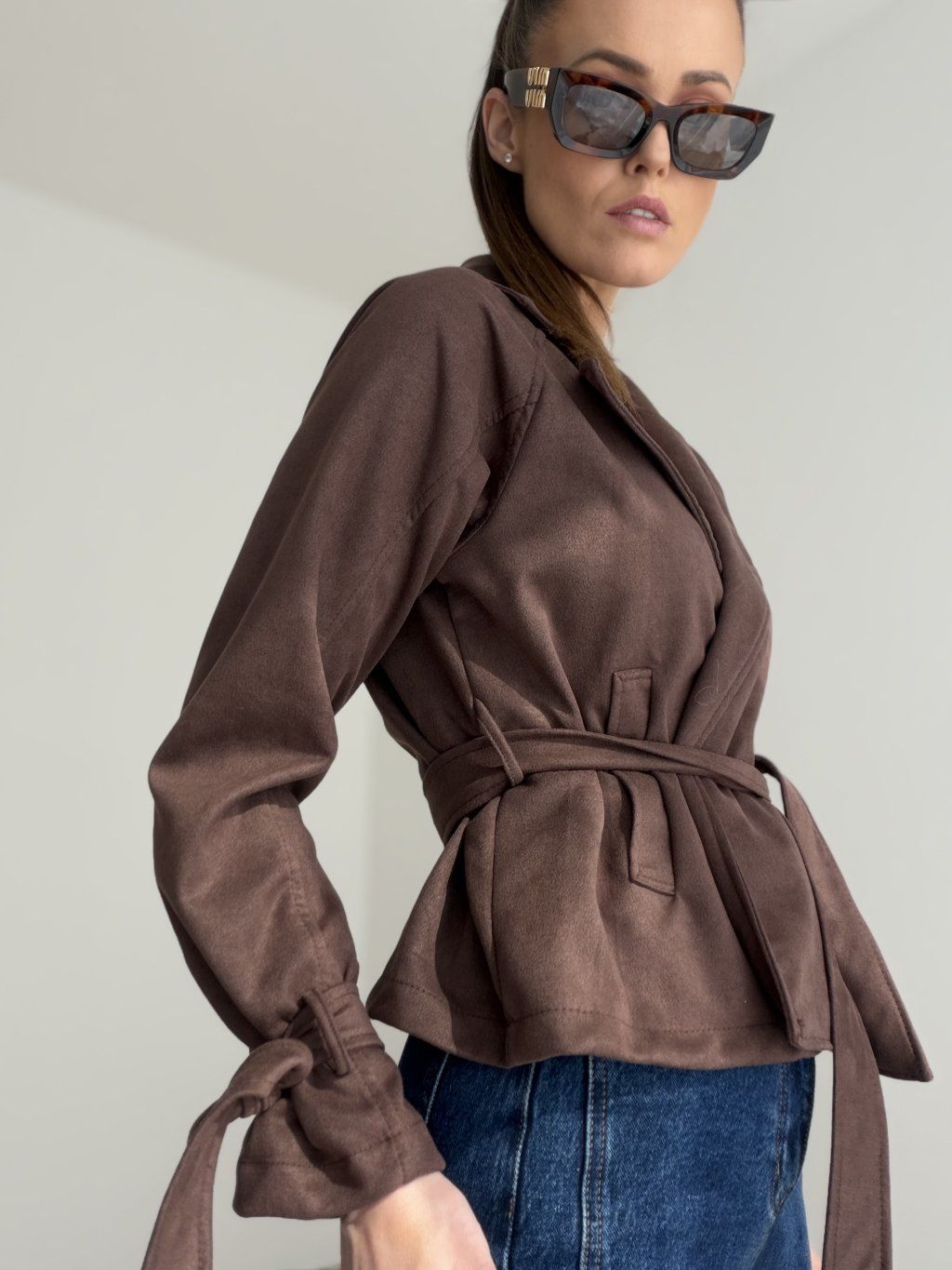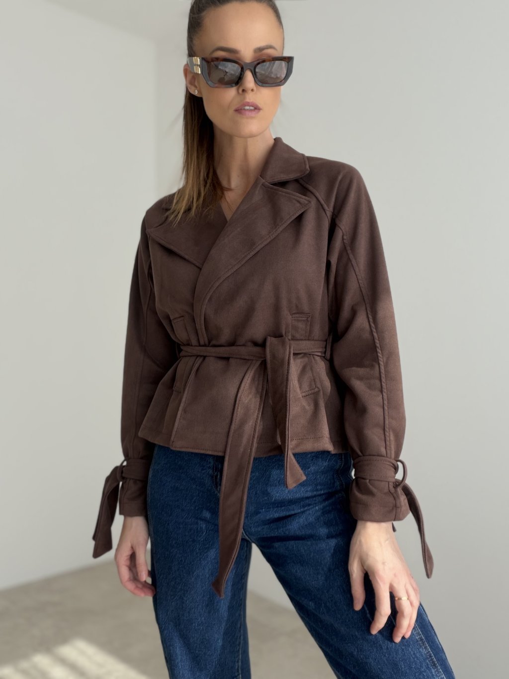 Zamszowa marynarka z wiązaniem w talii to elegancki i stylowy model do codziennych oraz kobiecych stylizacji. Nie ma podszewki, dzięki czemu jest lekka, miękka i bardzo wygodna w noszeniu.