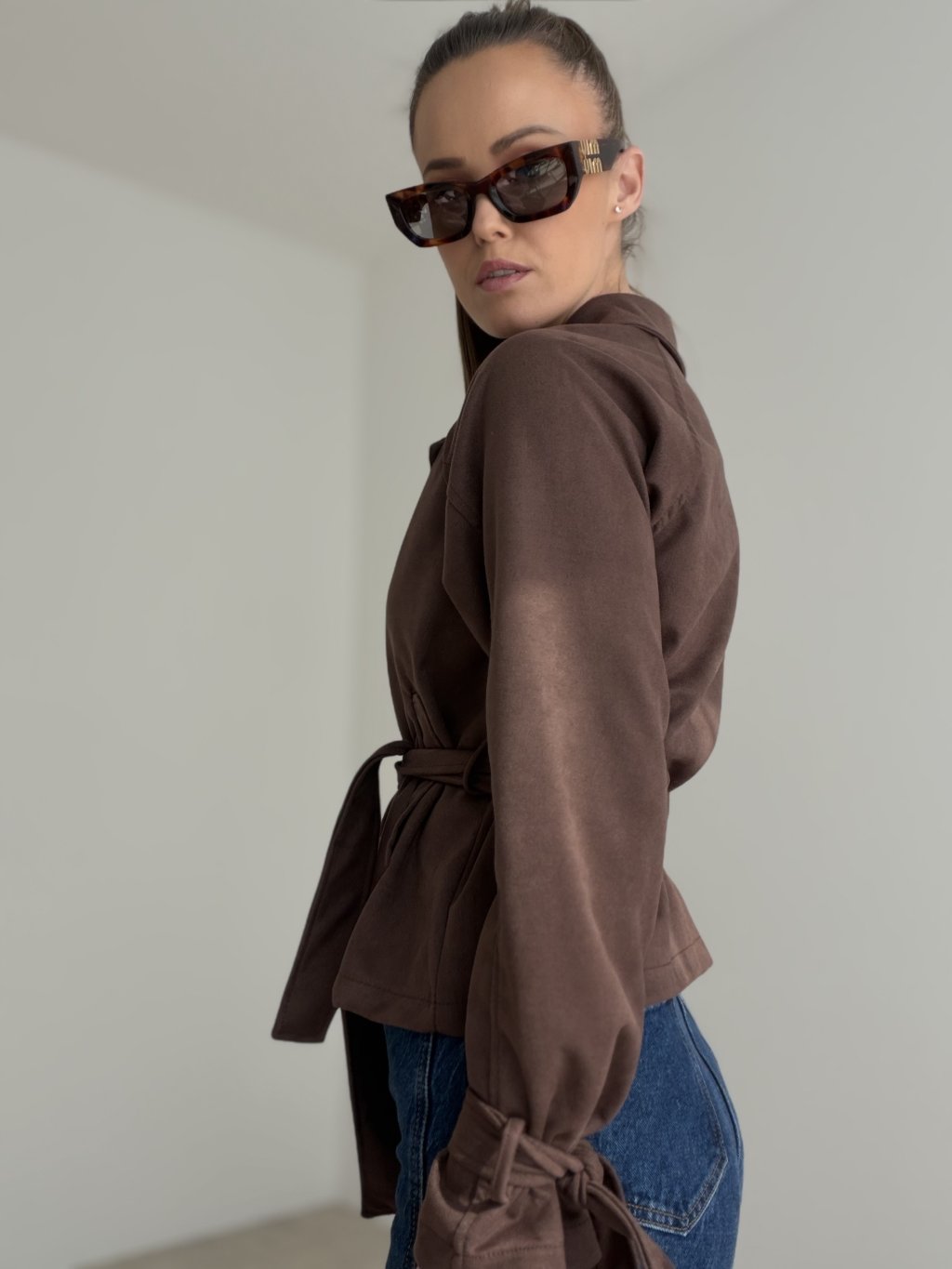 Zamszowa marynarka to elegancki i kobiecy model, który dodaje stylizacji subtelności oraz wyrafinowanego charakteru. Miękka w dotyku powierzchnia, nowoczesny krój i wiązanie w talii sprawiają, że fason pięknie dopasowuje się do sylwetki. Wyraziste klapy oraz wiązania przy rękawach nadają całości oryginalnego i stylowego wyglądu. Marynarka nie ma podszewki, dzięki czemu jest lżejsza, bardziej miękka i wygodna w noszeniu.