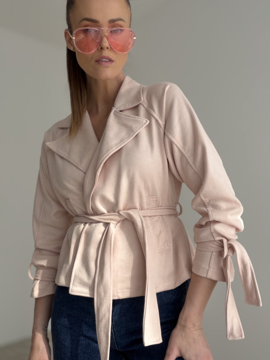 Zamszowa marynarka to elegancki i kobiecy model, który dodaje stylizacji subtelności oraz wyrafinowanego charakteru. Miękka w dotyku powierzchnia, nowoczesny krój i wiązanie w talii sprawiają, że fason pięknie dopasowuje się do sylwetki. Wyraziste klapy oraz wiązania przy rękawach nadają całości oryginalnego i stylowego wyglądu. Marynarka nie ma podszewki, dzięki czemu jest lżejsza, bardziej miękka i wygodna w noszeniu.