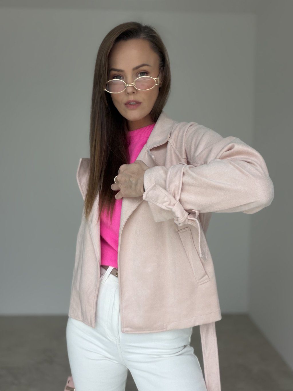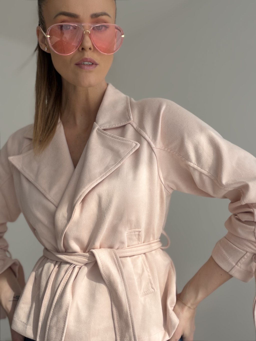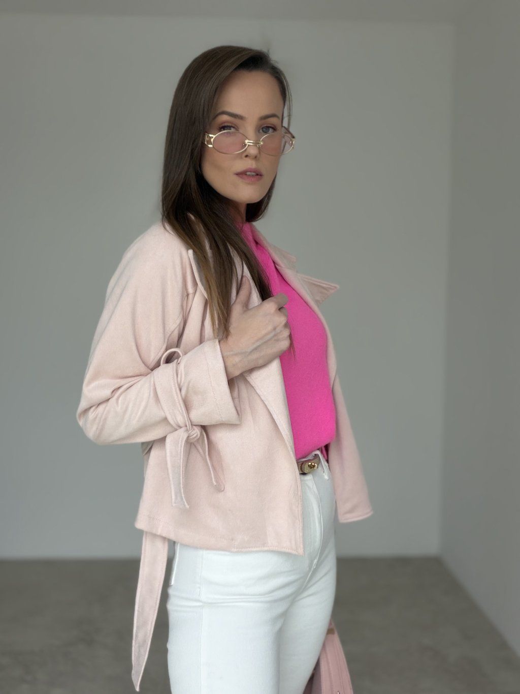 Zamszowa marynarka z wiązaniem w talii to elegancki i stylowy model do codziennych oraz kobiecych stylizacji. Nie ma podszewki, dzięki czemu jest lekka, miękka i bardzo wygodna w noszeniu.