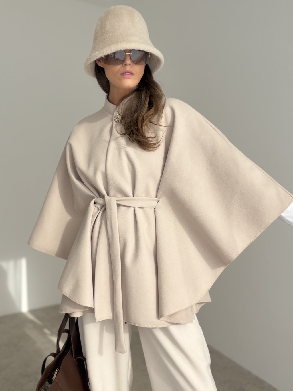 Elegantné pončo v čistom, nadčasovom strihu, ktoré pôsobí luxusne a zároveň sa nosí veľmi pohodlne. Voľnejší „cape“ strih krásne splýva, vytvára jemný pohyb a dodáva outfitu výrazný, no stále minimalistický efekt. Pončo má stojatý golier a zapínanie pri krku, takže pôsobí upravene aj bez ďalších vrstiev. V páse je doplnené viazaním, vďaka ktorému si vieš siluetu prispôsobiť – môžeš ho nosiť voľne pre ležérny look alebo stiahnuť v páse pre elegantné zvýraznenie postavy. Je to ideálny kúsok na prechodné obdobie, do mesta, na stretnutia aj na večer, keď chceš vyzerať šik bez námahy.