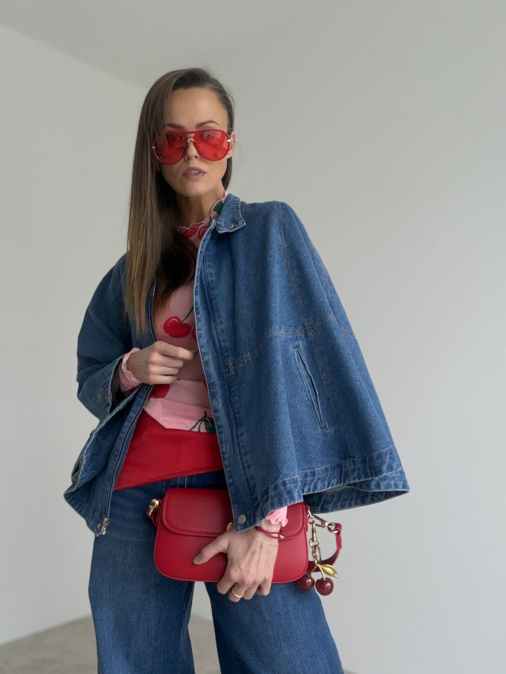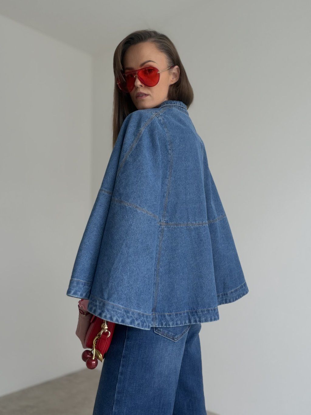 Denimová pelerína so širokými rukávmi pre moderný a štýlový vzhľad.
