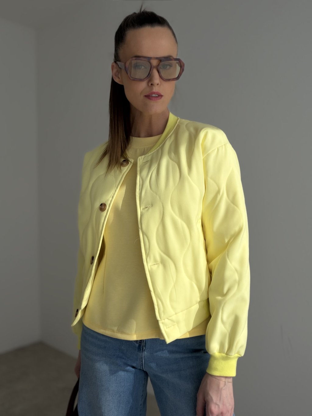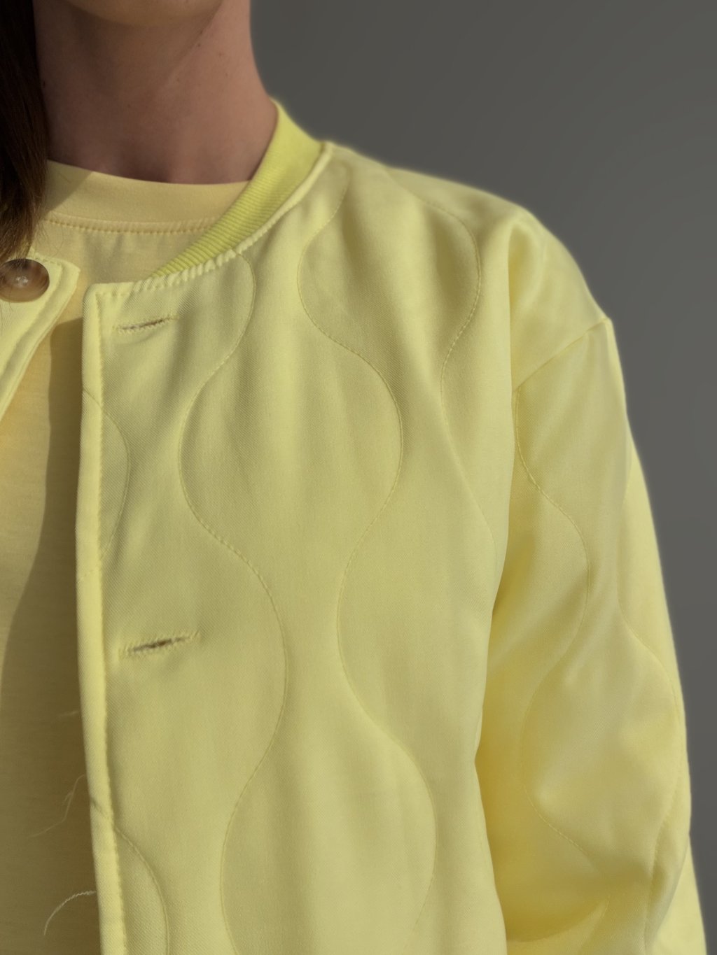Zaujímavým detailom je jemné prešívanie, ktoré dodáva bunde originálny vzhľad a zároveň vytvára elegantnú štruktúru. Kratší strih pôsobí moderne a skvelo zvýrazňuje siluetu. Praktické vrecká a zapínanie na gombíky dopĺňajú celkový dizajn a robia z bundy univerzálny kúsok vhodný na každodenné nosenie.
