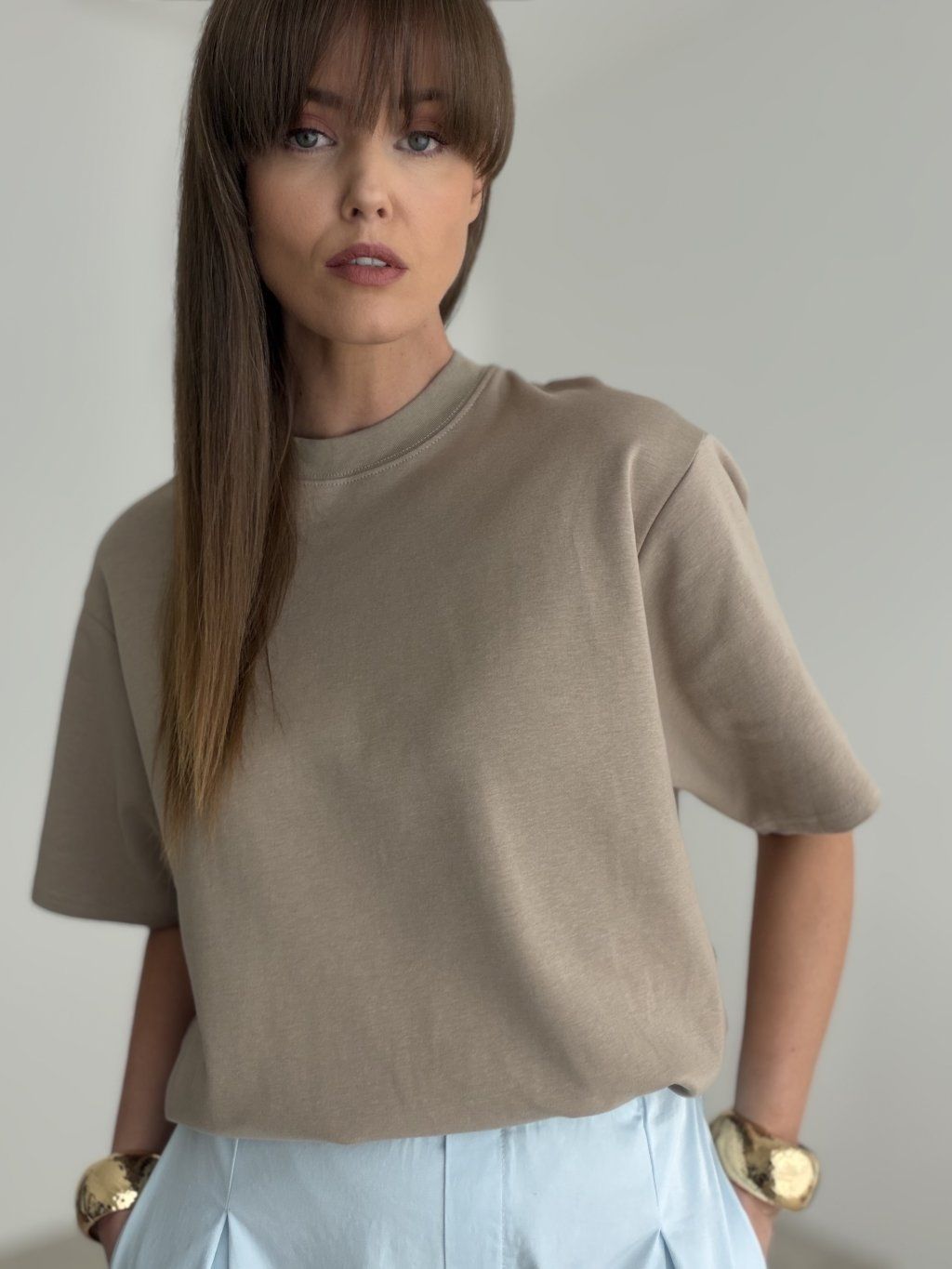 Premium bavlnené tričko je nadčasový základ šatníka, ktorý spája maximálne pohodlie, kvalitný materiál a čistý, moderný vzhľad. Má jednoduchý strih s krátkym rukávom a príjemne uvoľnenú siluetu, vďaka čomu sa veľmi dobre nosí a ľahko kombinuje s rôznymi kúskami. Bavlnený materiál je príjemný na dotyk, pohodlný počas celého dňa a ideálny na každodenné nosenie.