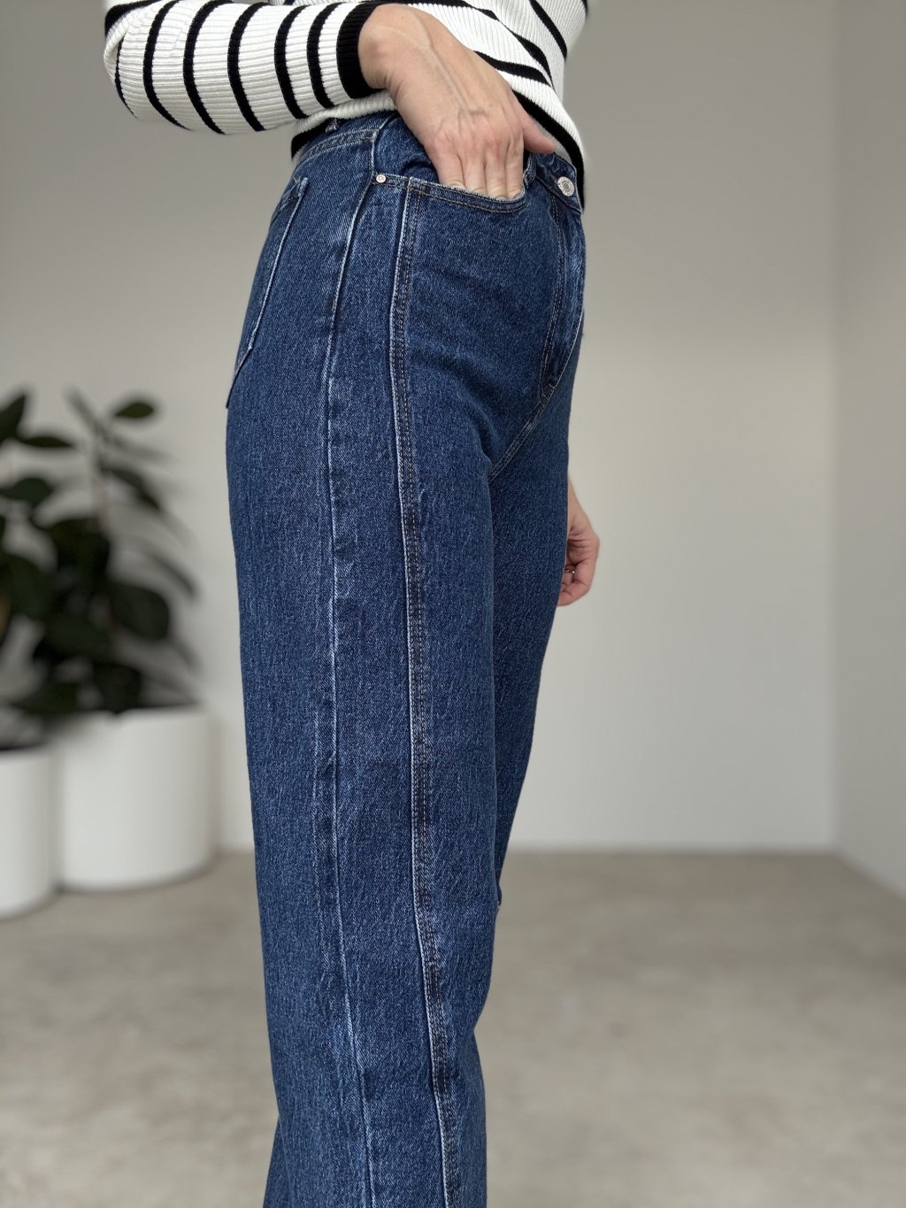 Džínsy s pohodlným stredným až vyšším sedom a rovnejším, mierne zúženým strihom nohavíc. Dekoratívne prešitie po dĺžke nôh opticky predlžuje siluetu a dodáva minimalistický, čistý vzhľad. Pevný denim s miernou pružnosťou sa pekne prispôsobí postave a drží tvar počas celého dňa. Klasické zapínanie na zips a gombík, predné vrecká a nakladané vrecká vzadu. Univerzálna dĺžka sa hodí k teniskám aj členkovým čižmám. Odporúčame prať naruby na jemnom programe.