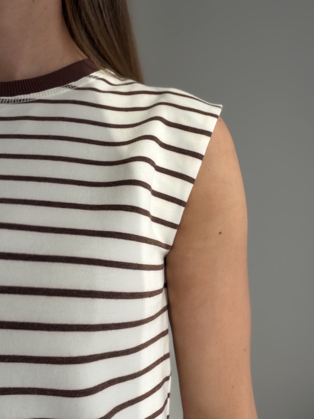 Pohodlné prúžkované tričko bez rukávov s okrúhlym výstrihom. Nadčasový a univerzálny kúsok, ktorý ľahko doplní každodenné outfity.