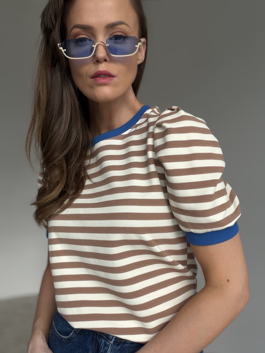 Prúžkovaný top s okrúhlym výstrihom a rebrovanými lemami. Krátke rukávy s jemným naberaním v ramenách vytvárajú ženský, moderný tvar a top sa ľahko kombinuje na každý deň.