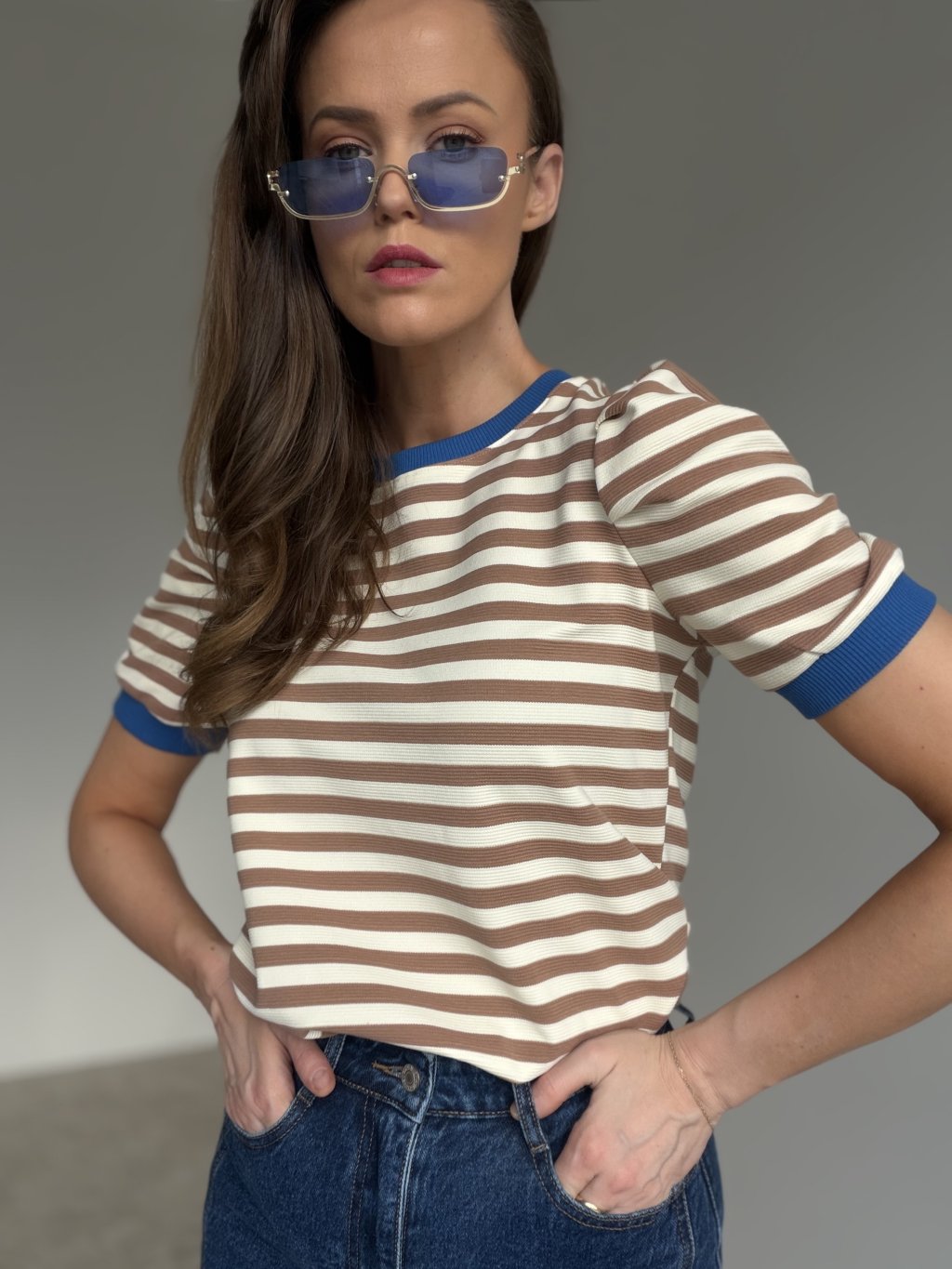 Prúžkovaný top s jemne plastickou štruktúrou je ideálny kúsok, keď chceš vyzerať upravene bez námahy. Má klasický okrúhly výstrih s rebrovaným lemom a krátke rukávy s miernym naberaním v ramenách, ktoré pekne vytvoria ženskú siluetu. Rebrované zakončenia držia tvar a dodávajú topu čistý, „premium“ vzhľad. Strih je pohodlný a ľahko sa kombinuje do ležérnych aj mestských outfitov, krásne sadne k džínsom, nohaviciam s vyšším pásom aj k sukni.