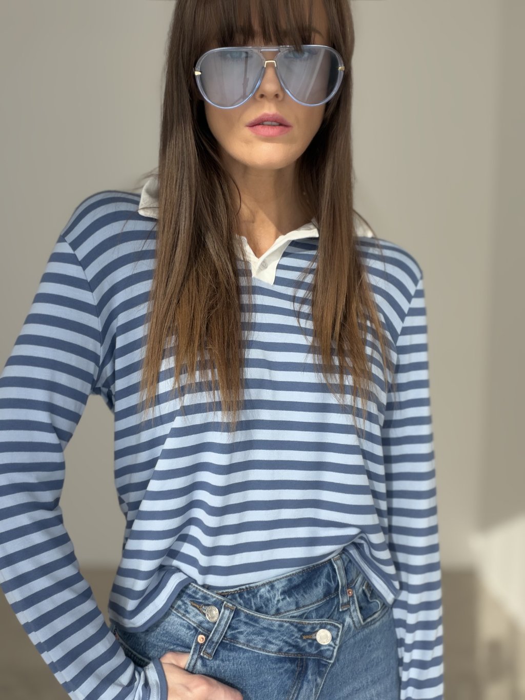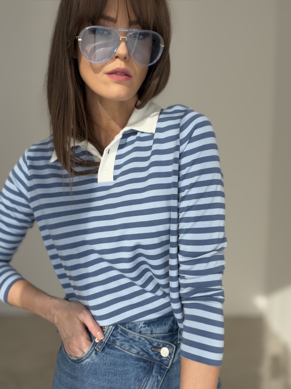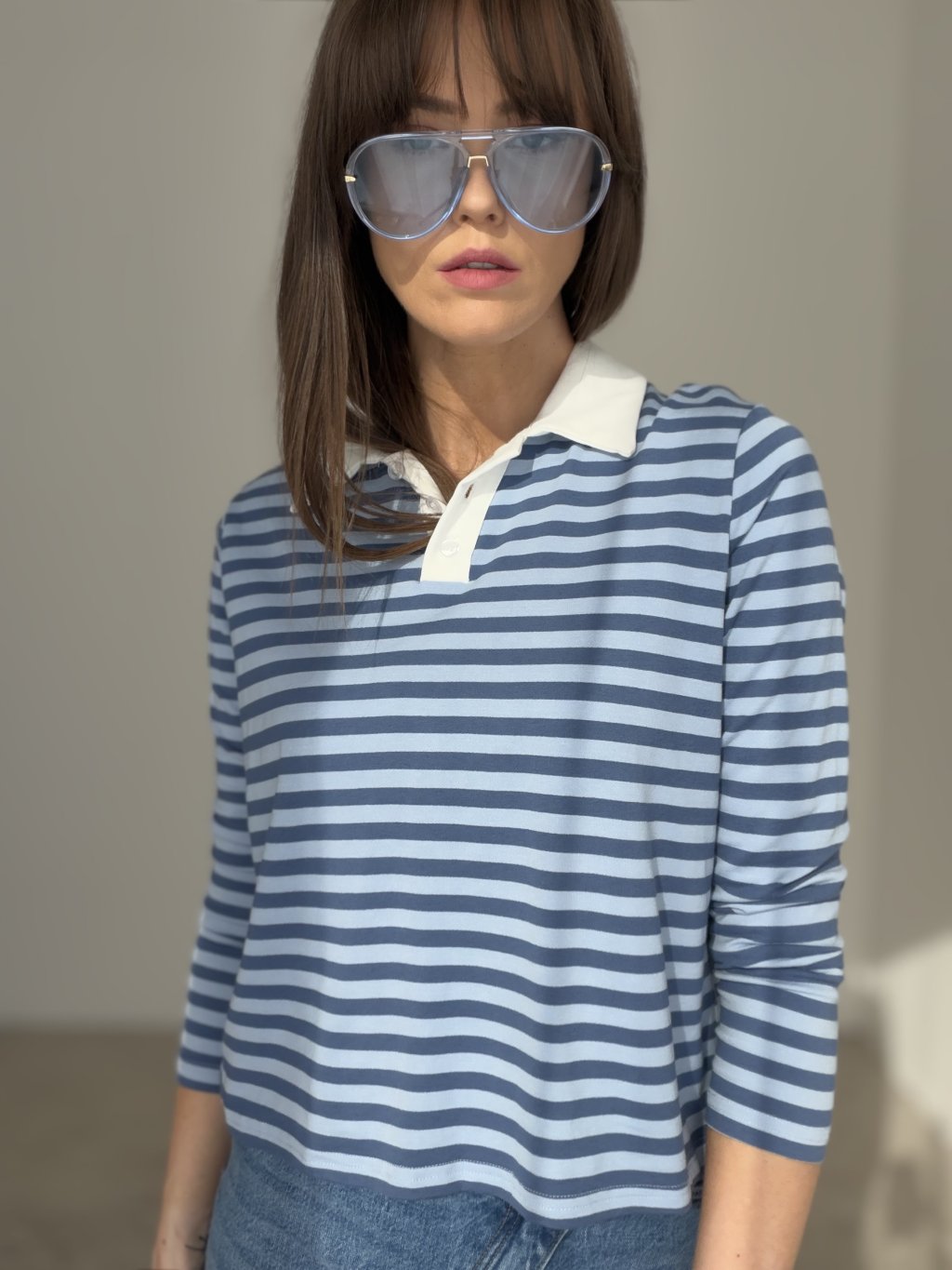 Elegantný top s dlhým rukávom a golierikom je pohodlný a štýlový kúsok na každý deň. Vďaka nadčasovému strihu a jemnému vzoru sa ľahko kombinuje s nohavicami, rifľami aj sukňou.