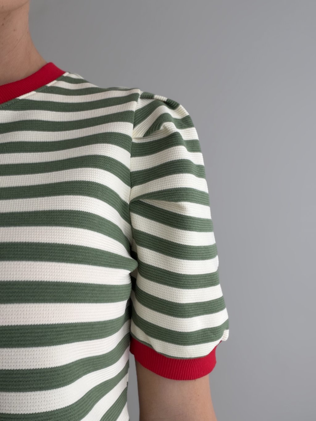 Prúžkovaný top s okrúhlym výstrihom a rebrovanými lemami. Krátke rukávy s jemným naberaním v ramenách vytvárajú ženský, moderný tvar a top sa ľahko kombinuje na každý deň.