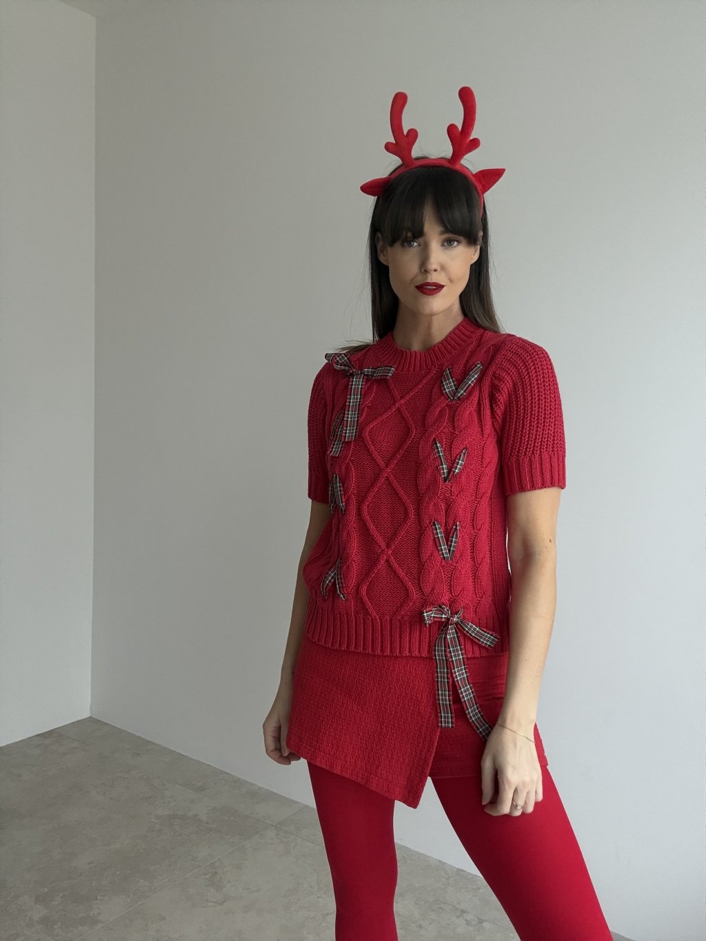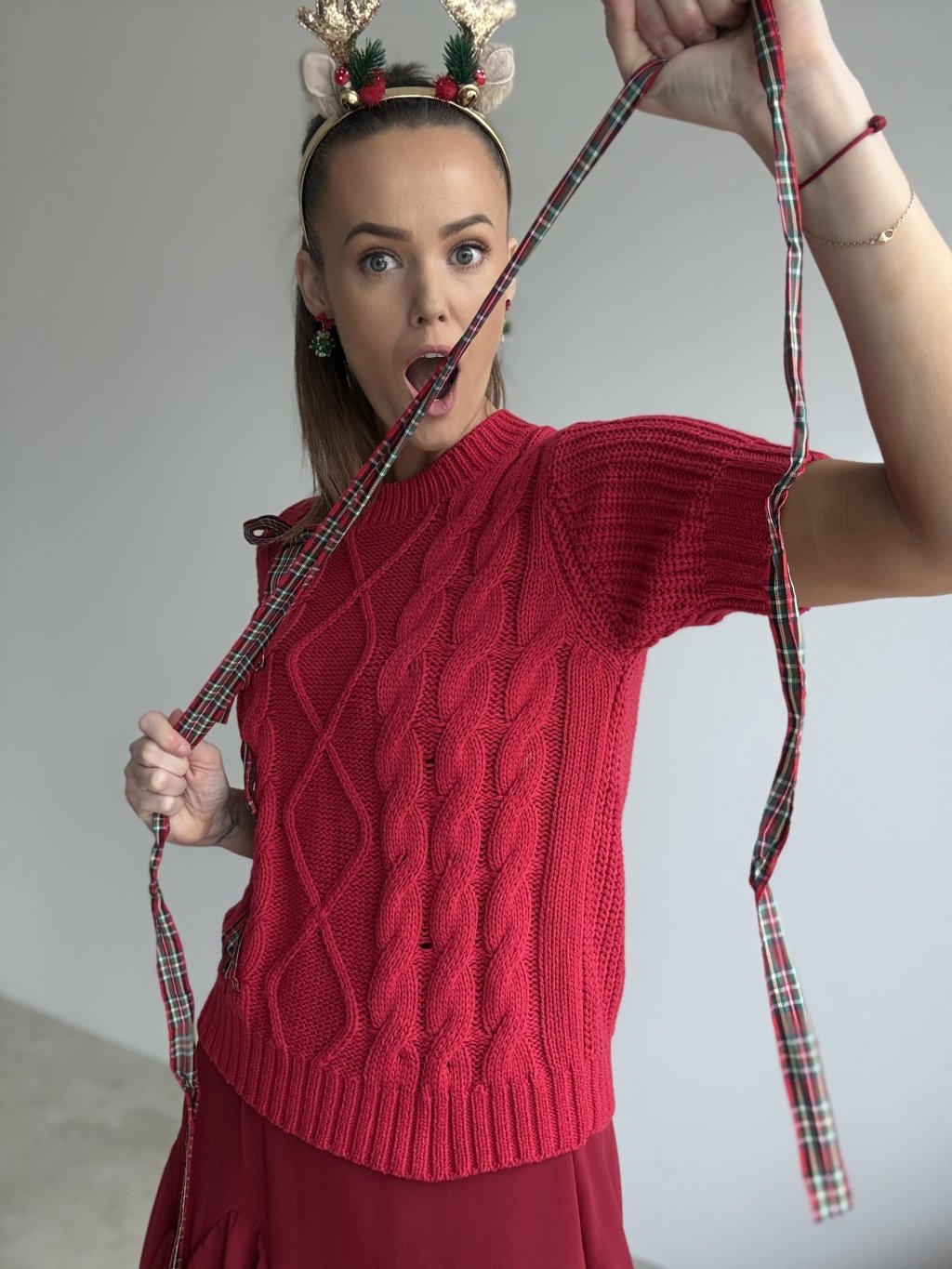 Originálny pletený pulóver s kratším rukávom, ktorý spája hravý detail s elegantným vzhľadom. Predný diel zdobí výrazný vrkočový vzor doplnený o niekoľko mašlí z kockovanej stuhy, čo vytvára efekt „zabaleného darčeka“ a dodáva outfitu sviatočný nádych. Mäkký úplet je príjemný na pokožke, neškriabe a pohodlne sa prispôsobí postave. Rebrované zakončenie pri krku, v páse a na rukávoch pomáha, aby pulóver pekne držal tvar a zvýraznil siluetu. Je to kúsok, ktorý vynikne na fotkách, ale zároveň je dostatočne pohodlný na celodenné nosenie.