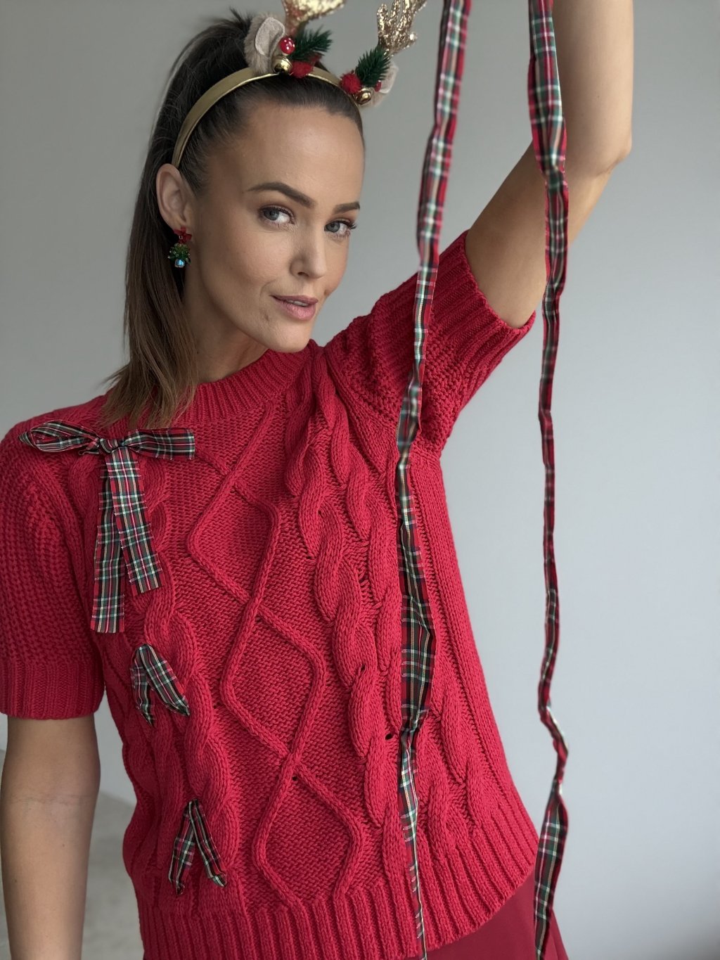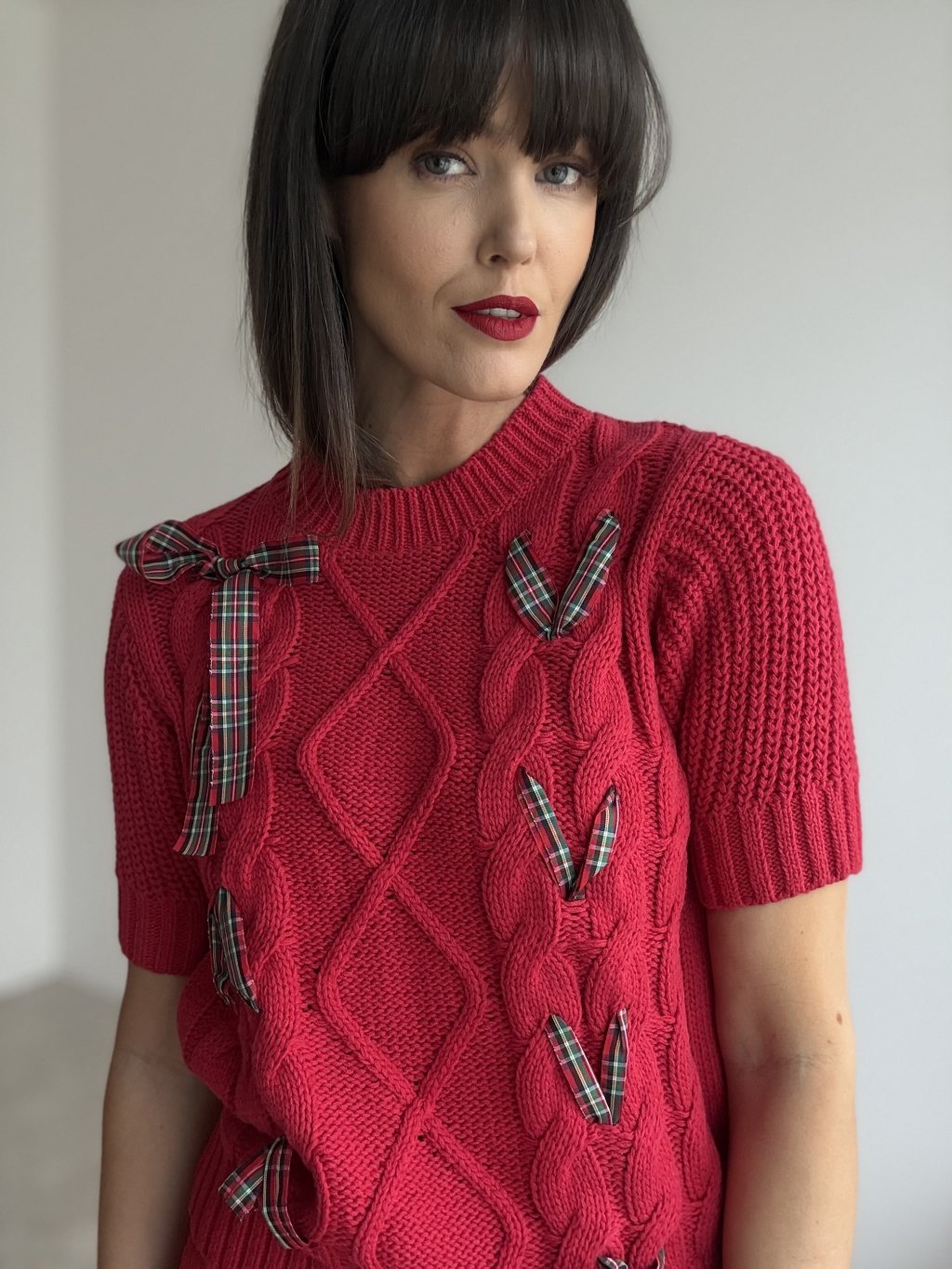 Pletený pulóver s kratším rukávom, vrkočovým vzorom a dekoratívnymi mašľami z kockovanej stuhy, ktorý dodá outfitu hravý, sviatočný a pritom stále elegantný vzhľad.