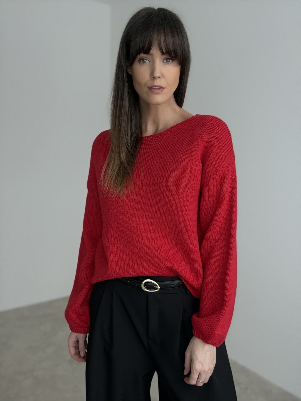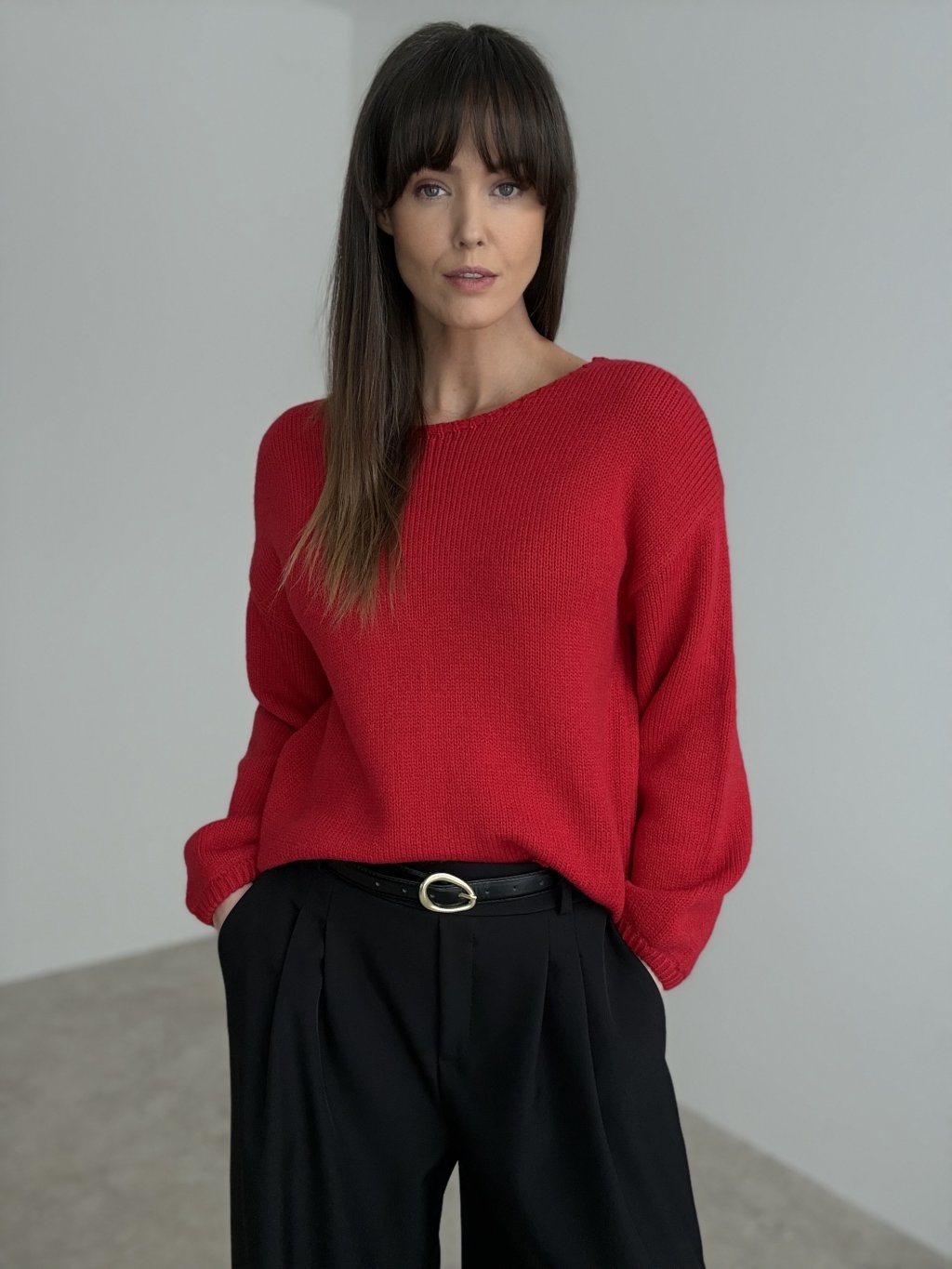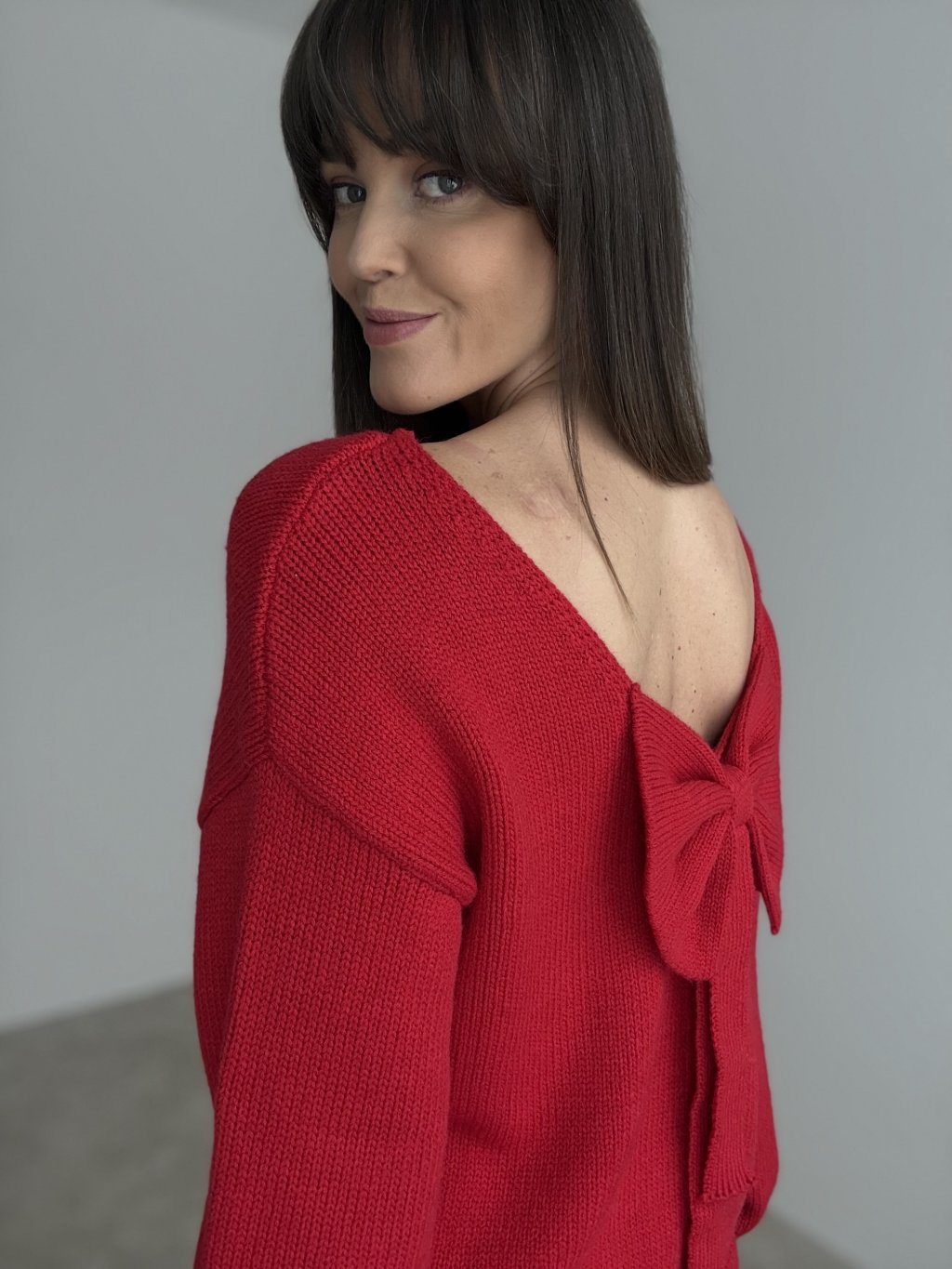 Romantický pulóver s efektným prekvapením na chrbte – hlbším výstrihom do „V“ a výraznou mašľou, ktorá pôsobí žensky a hravo. Predná časť je jednoduchá, s voľnejším spadnutým strihom a dlhými rukávmi, takže pôsobí nenútene a ľahko sa kombinuje s rôznymi spodnými dielmi. Mäkký úplet je príjemný na dotyk a pohodlný na celodenné nosenie, či už do práce, do mesta alebo na večerné stretnutia. Mašľa na chrbte dodáva pulóvru jedinečný charakter a vytvára krásny detail, ktorý vynikne pri každom otočení.