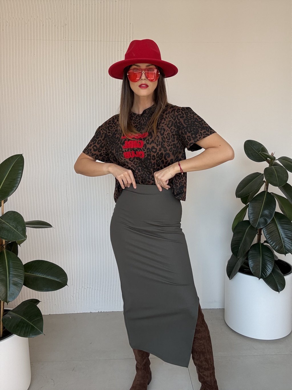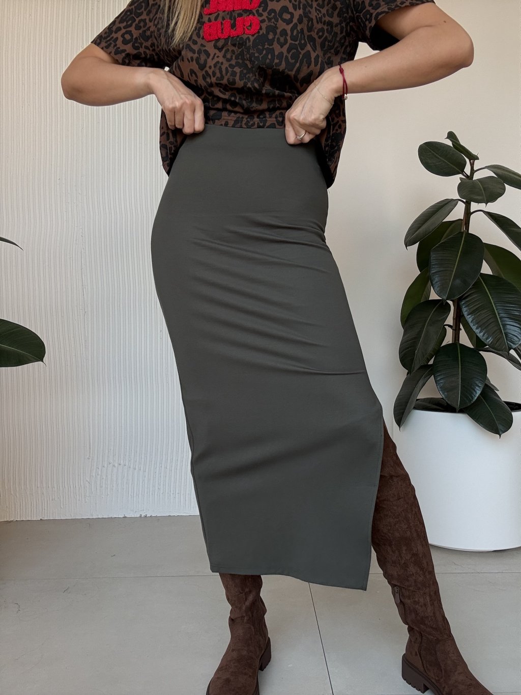 Elegantná púzdrová sukňa s vysokým pásom a priliehavým strihom, ktorý krásne zvýrazní ženskú postavu. Dĺžka pod kolená a rozparok na boku dodávajú modelu rafinovaný a zároveň pohodlný vzhľad. Skvele sa kombinuje s jednoduchým tričkom aj elegantnou blúzkou – ideálna na bežný deň aj večerné príležitosti.