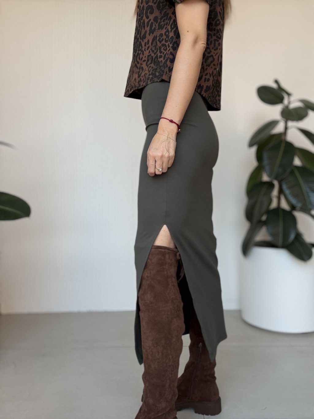 Púzdrová sukňa s vysokým pásom a bočným rozparkom.