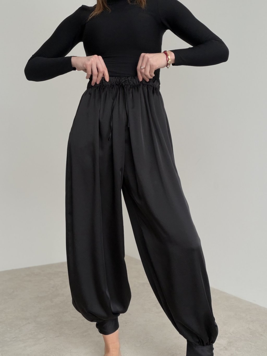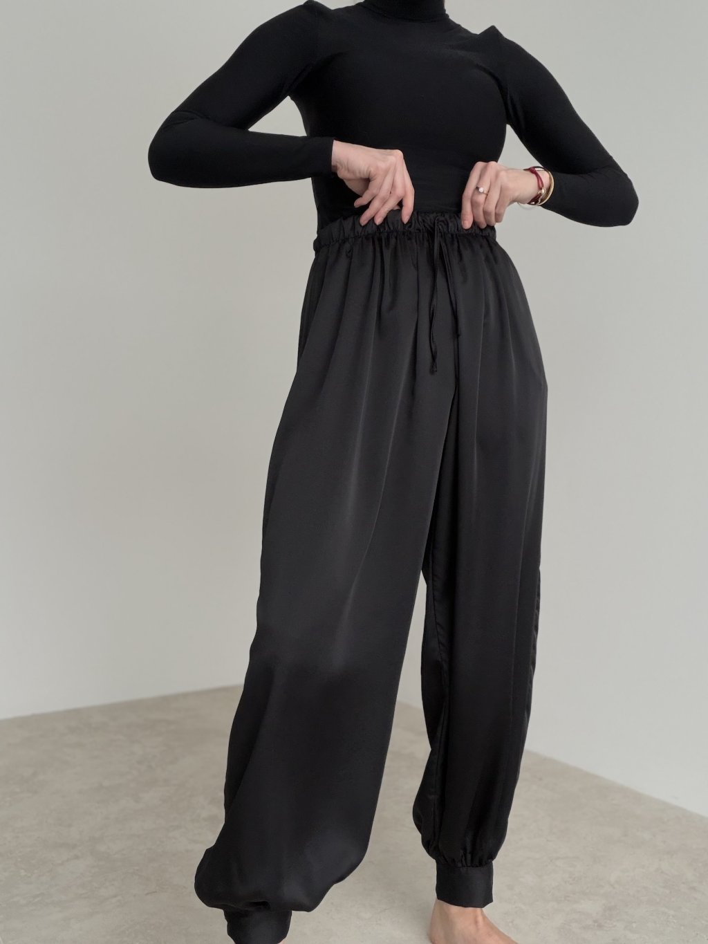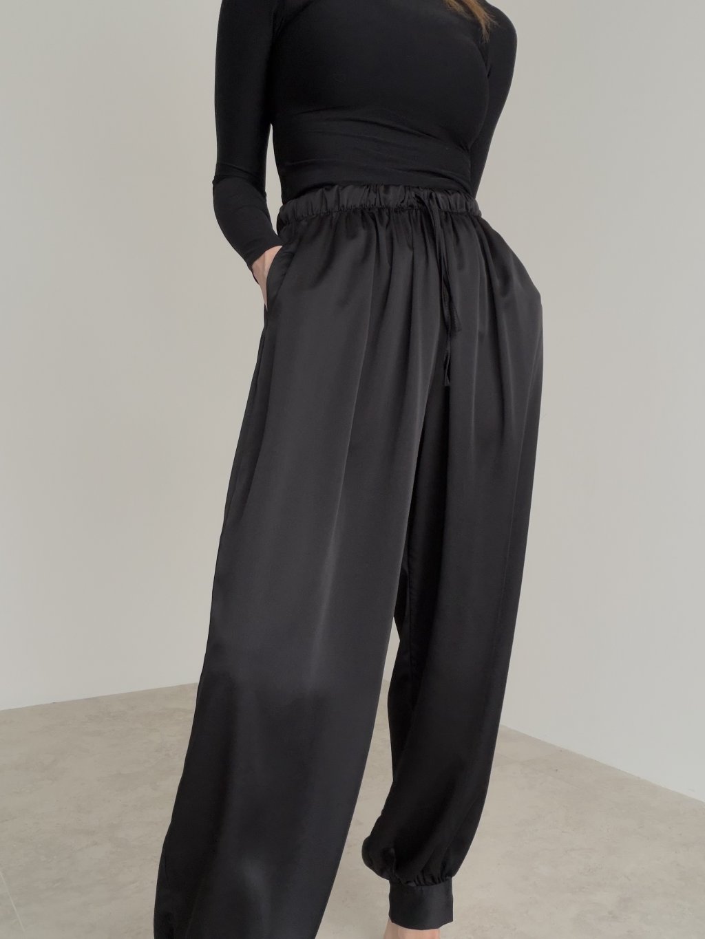 Saténové nohavice s vyšším elastickým pásom a šnúrkou. Voľnejší strih so zakončením pri členkoch pôsobí moderne a elegantne zároveň.