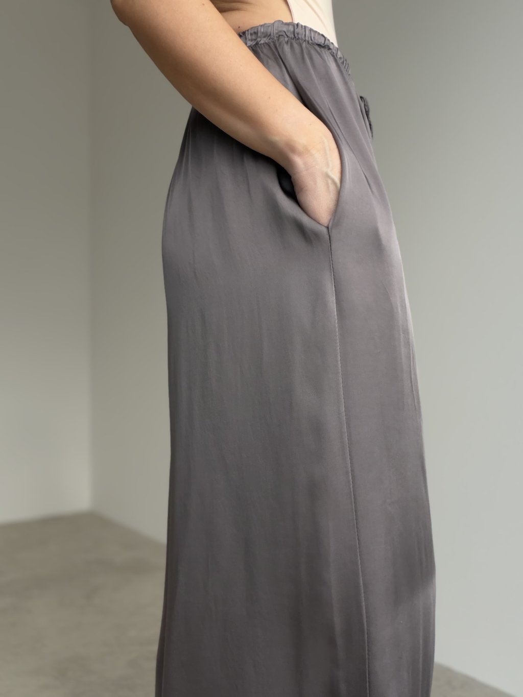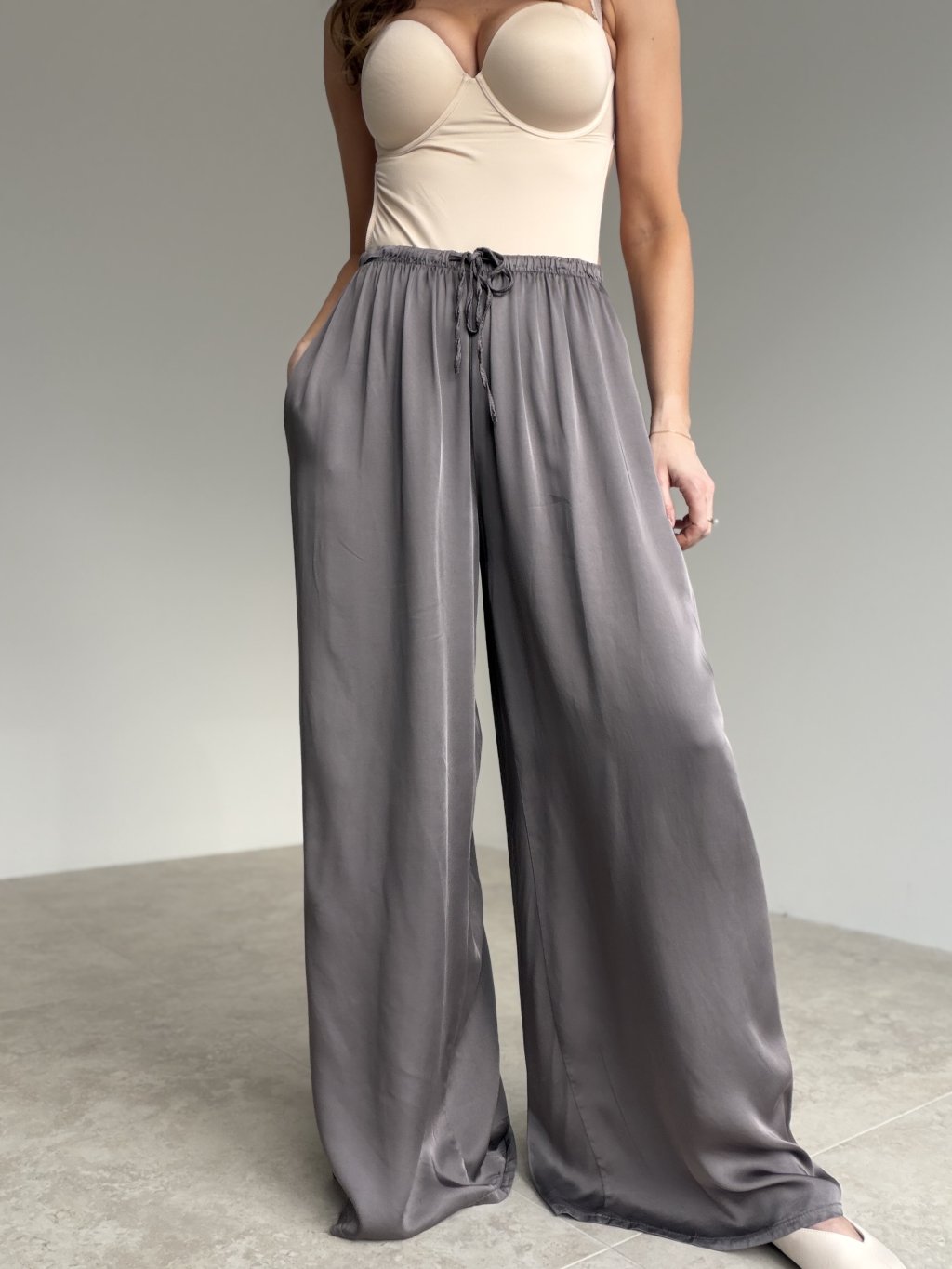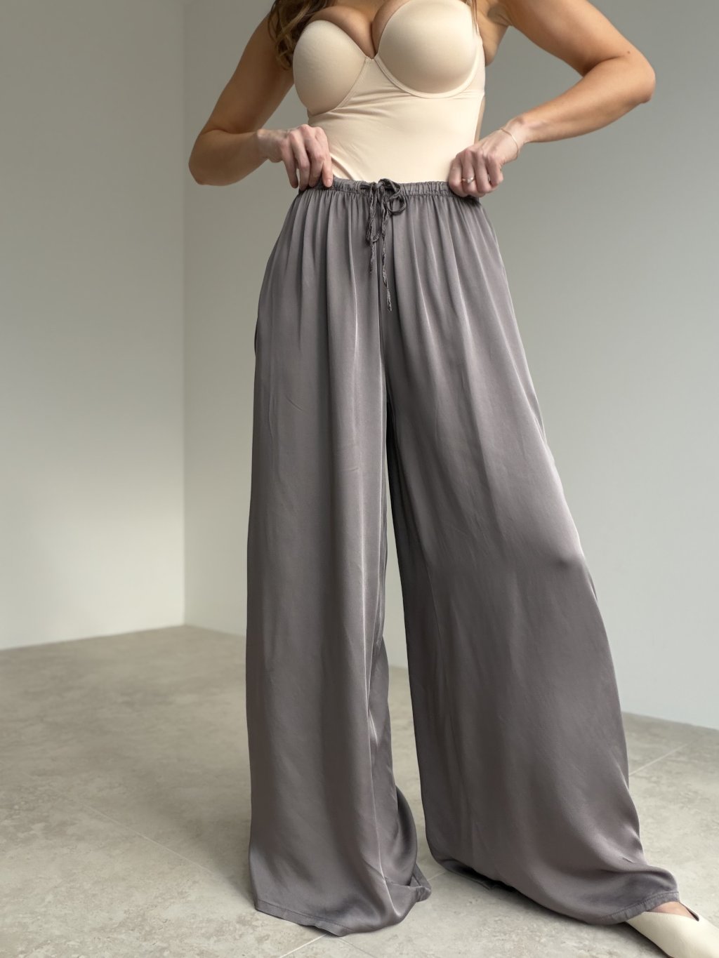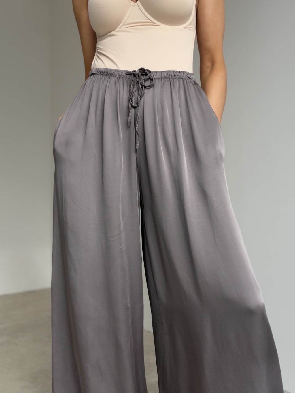 Splývavé saténové nohavice so širokými nohavicami, elastickým pásom so šnúrkou a vreckami. Elegantné, pohodlné a ľahko kombinovateľné.