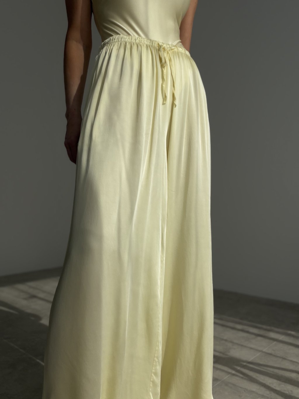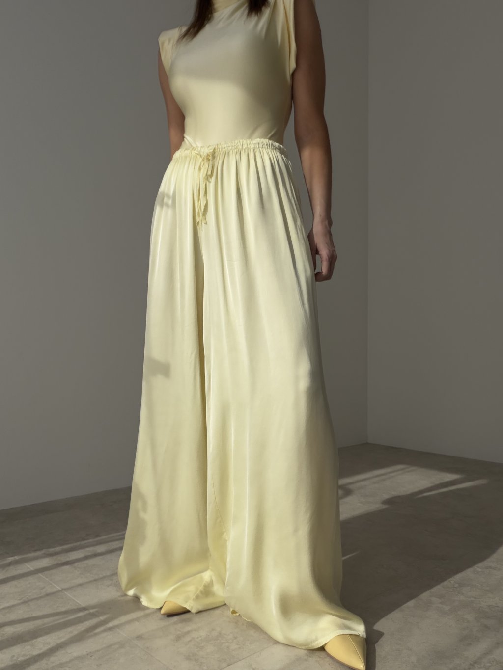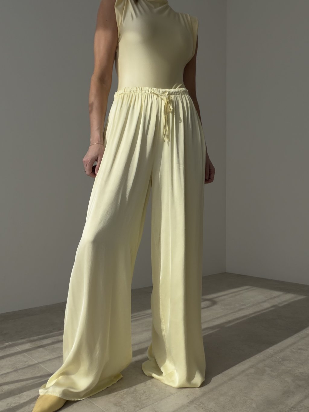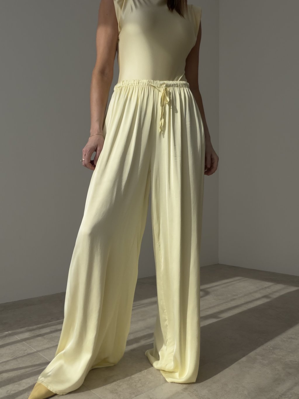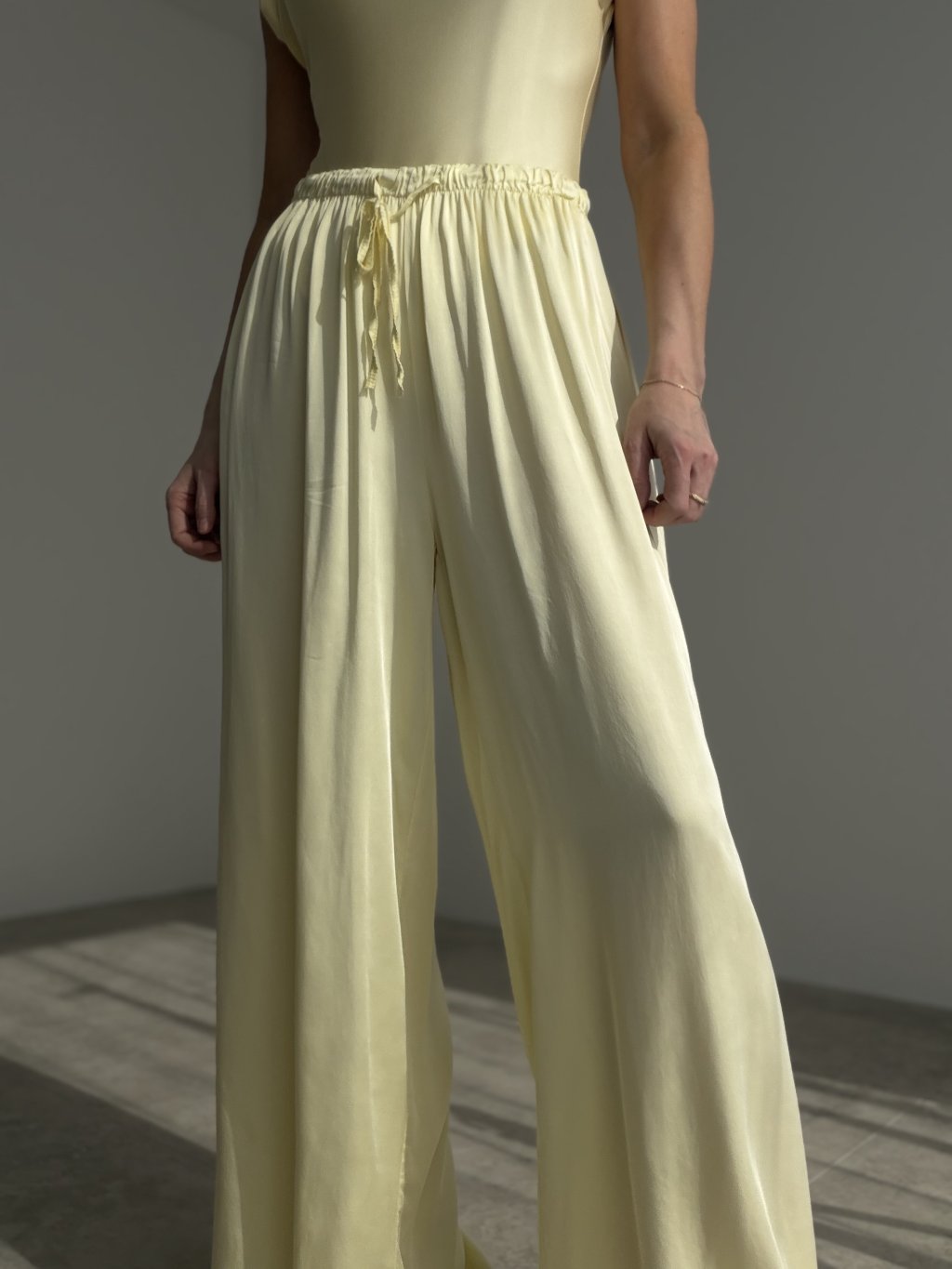 Splývavé saténové nohavice so širokými nohavicami, elastickým pásom so šnúrkou a vreckami. Elegantné, pohodlné a ľahko kombinovateľné.