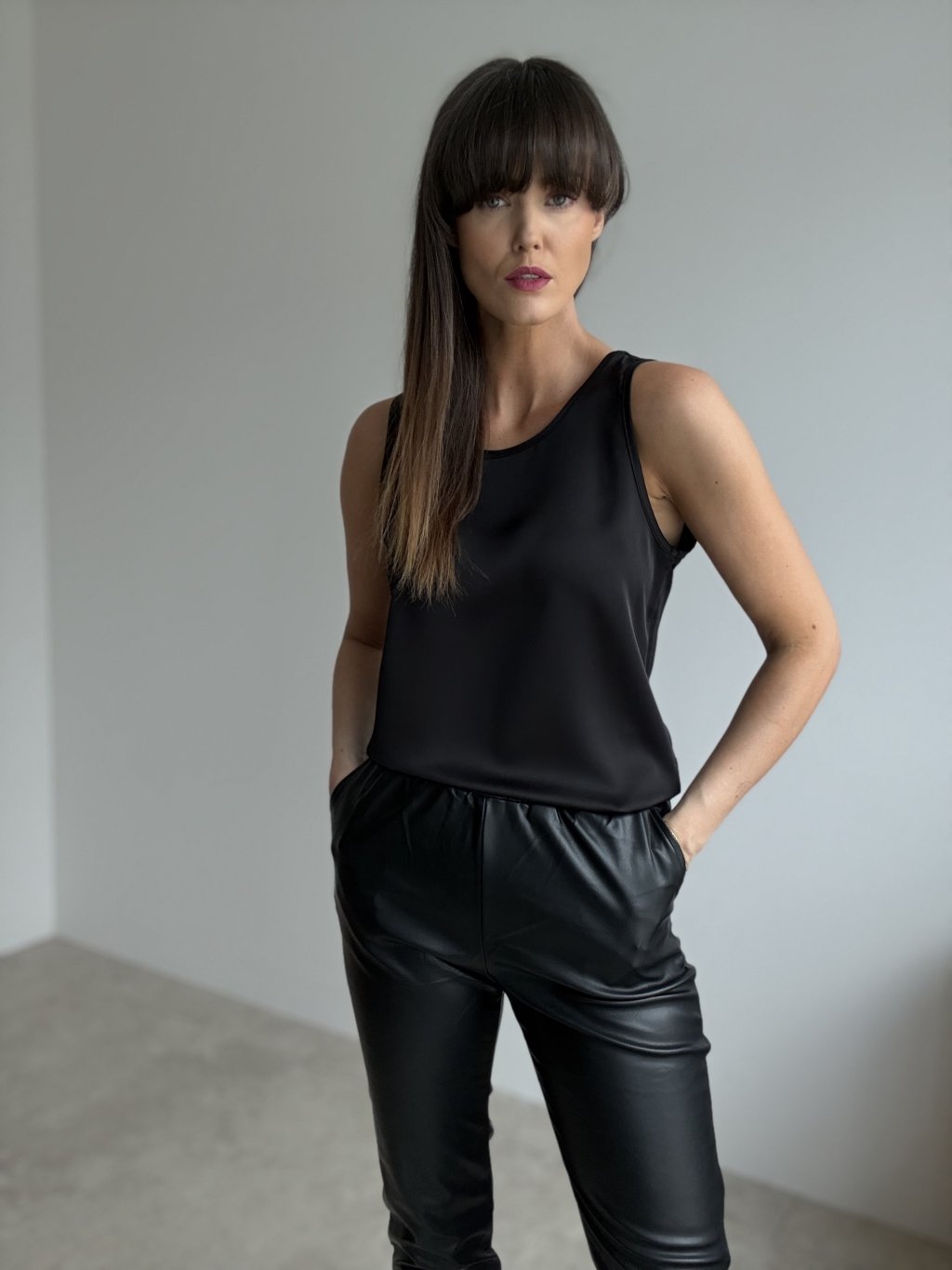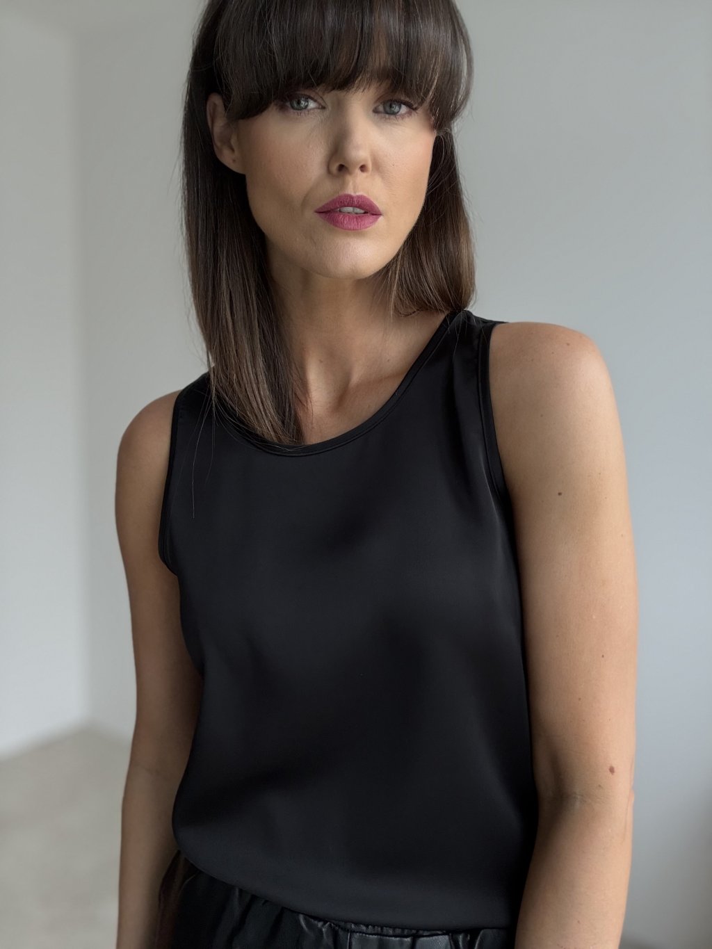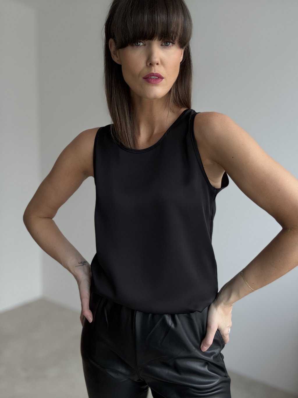 Saténový top bez rukávov s jemným leskom pôsobí čisto, elegantne a zároveň veľmi žensky. Hladký materiál krásne padá po postave, nelepí sa na telo a vytvára upravenú siluetu. Jednoduchý okrúhly výstrih a rovný strih z neho robia univerzálny kúsok, ktorý ľahko skombinujete s nohavicami, sukňou aj sakom. Je ideálny na bežný deň, do práce, na oslavy či večerné príležitosti – stačí zmeniť doplnky a top sa okamžite prispôsobí situácii.