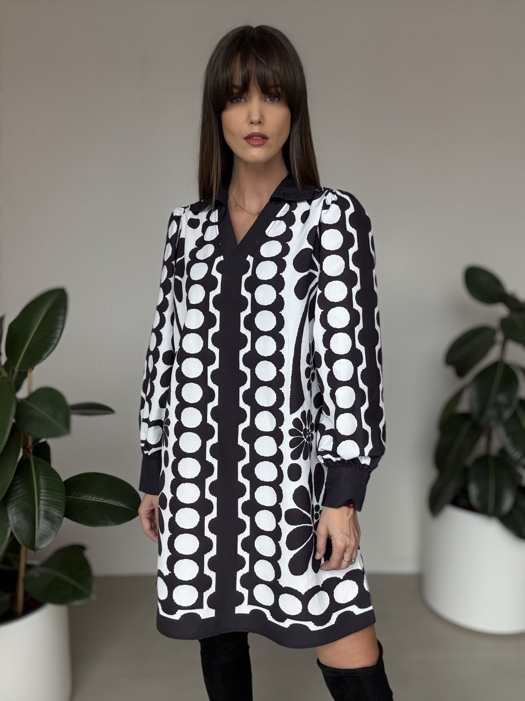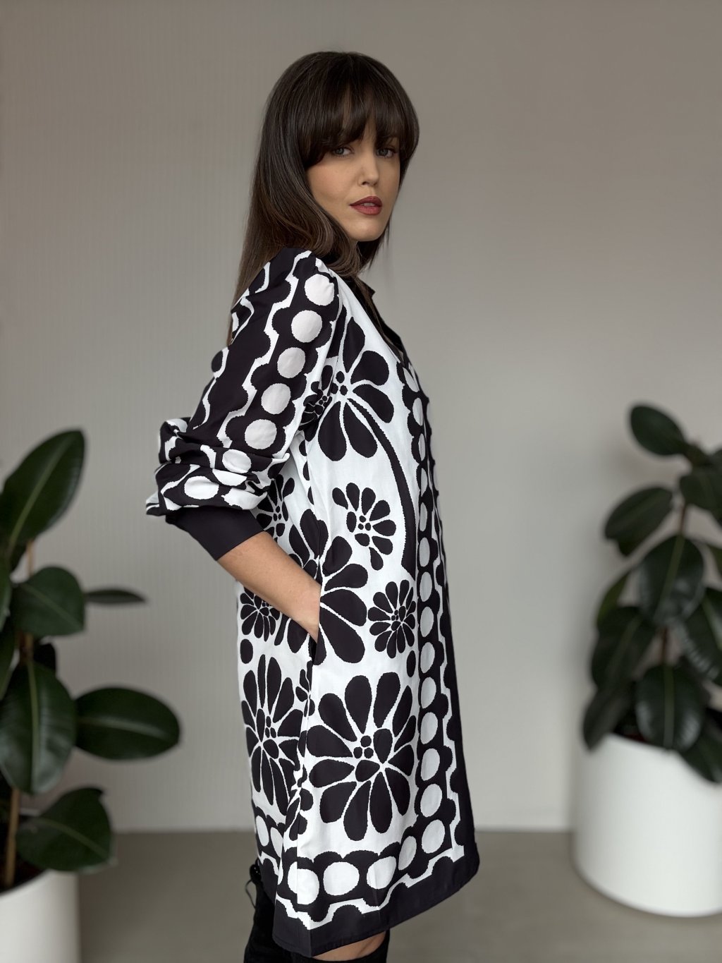 Šaty s praktickými vreckami spájajú eleganciu a pohodlie v jednom kúsku. Voľnejší strih je ideálny na každodenné nosenie a zároveň pôsobí žensky a štýlovo. Výrazný vzor dodáva šatám jedinečný charakter a vrecká zvyšujú komfort pri nosení. Odporúčame prať s použitím zachytávačov farieb, aby si šaty zachovali svoju pôvodnú farbu a kontrastný vzor.