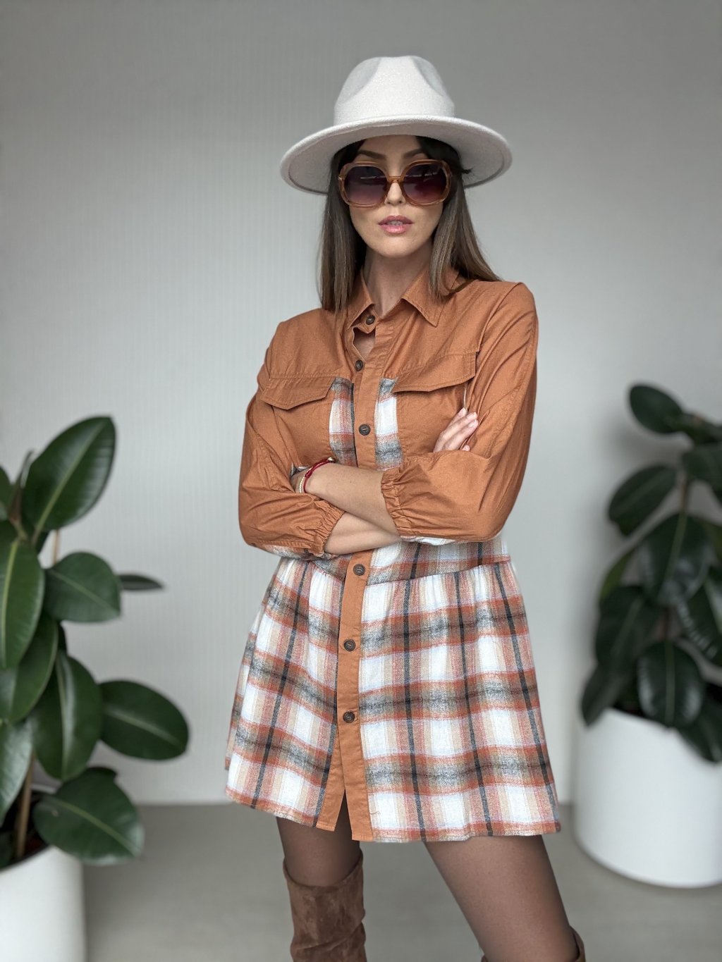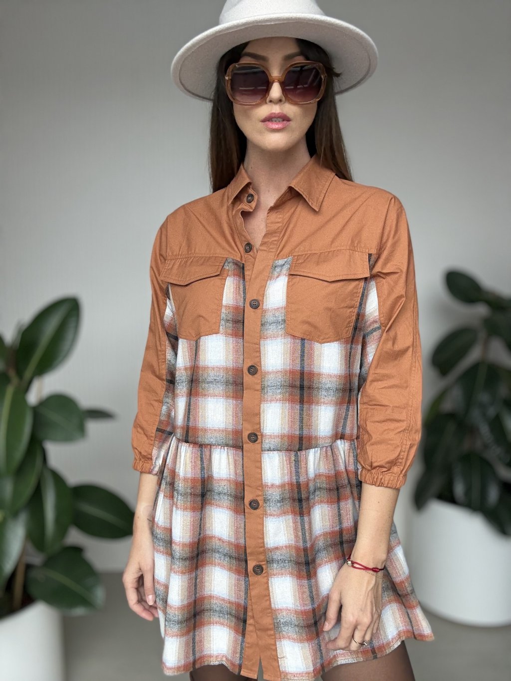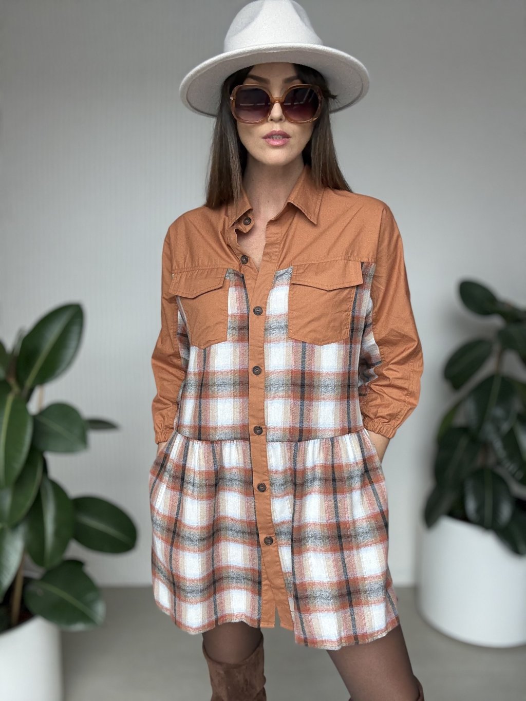 Šaty košeľového strihu s kombináciou jednofarebnej časti a károvaného vzoru pôsobia originálne a štýlovo. Praktické vrecká na bokoch dodávajú modelu funkčnosť a uvoľnený charakter. Predná časť je doplnená o gombíky a horné vrecká s chlopňami, ktoré zvýrazňujú ležérny vzhľad. Elastické ukončenie rukávov zabezpečuje pohodlie pri nosení. Ideálny model na každodenné nosenie, ktorý spája komfort s moderným štýlom.