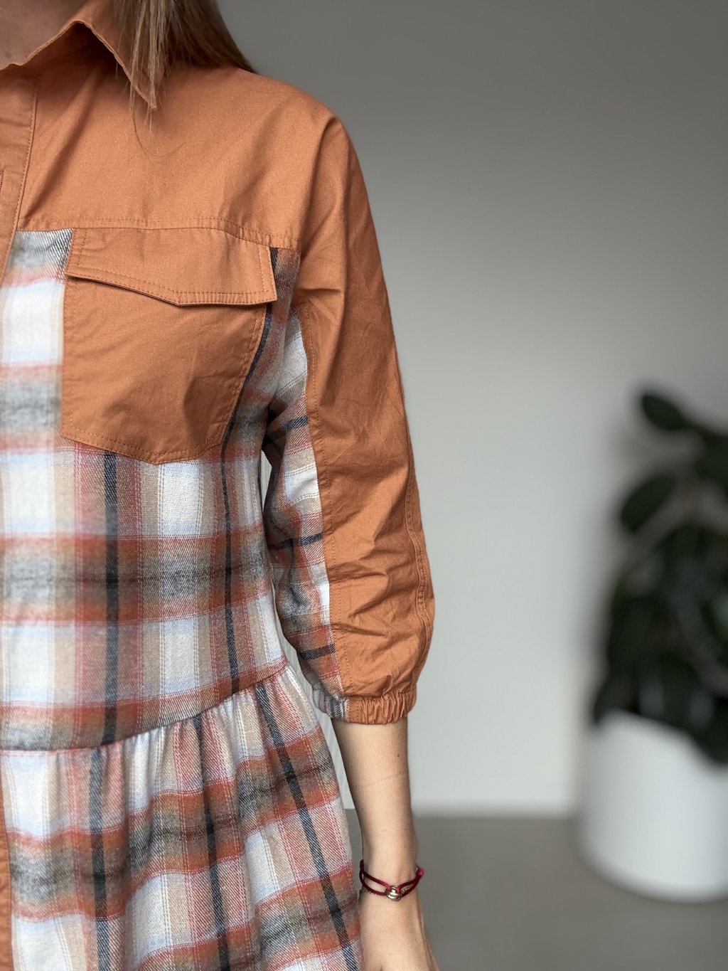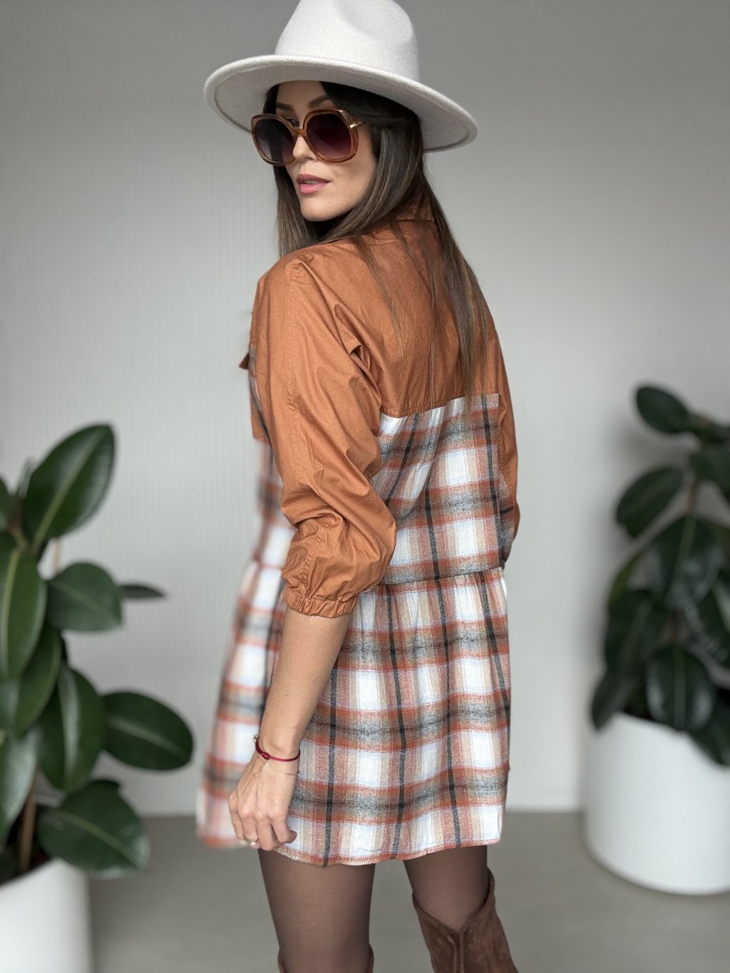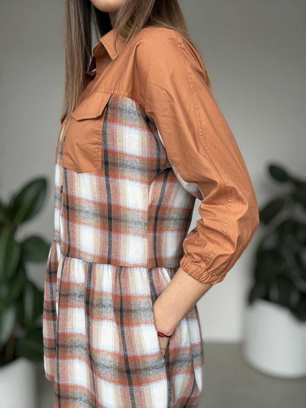 Šaty košeľového strihu s kombináciou jednofarebnej časti a károvaného vzoru pôsobia originálne a štýlovo. Praktické vrecká na bokoch dodávajú modelu funkčnosť a uvoľnený charakter. Predná časť je doplnená o gombíky a horné vrecká s chlopňami, ktoré zvýrazňujú ležérny vzhľad. Elastické ukončenie rukávov zabezpečuje pohodlie pri nosení. Ideálny model na každodenné nosenie, ktorý spája komfort s moderným štýlom.