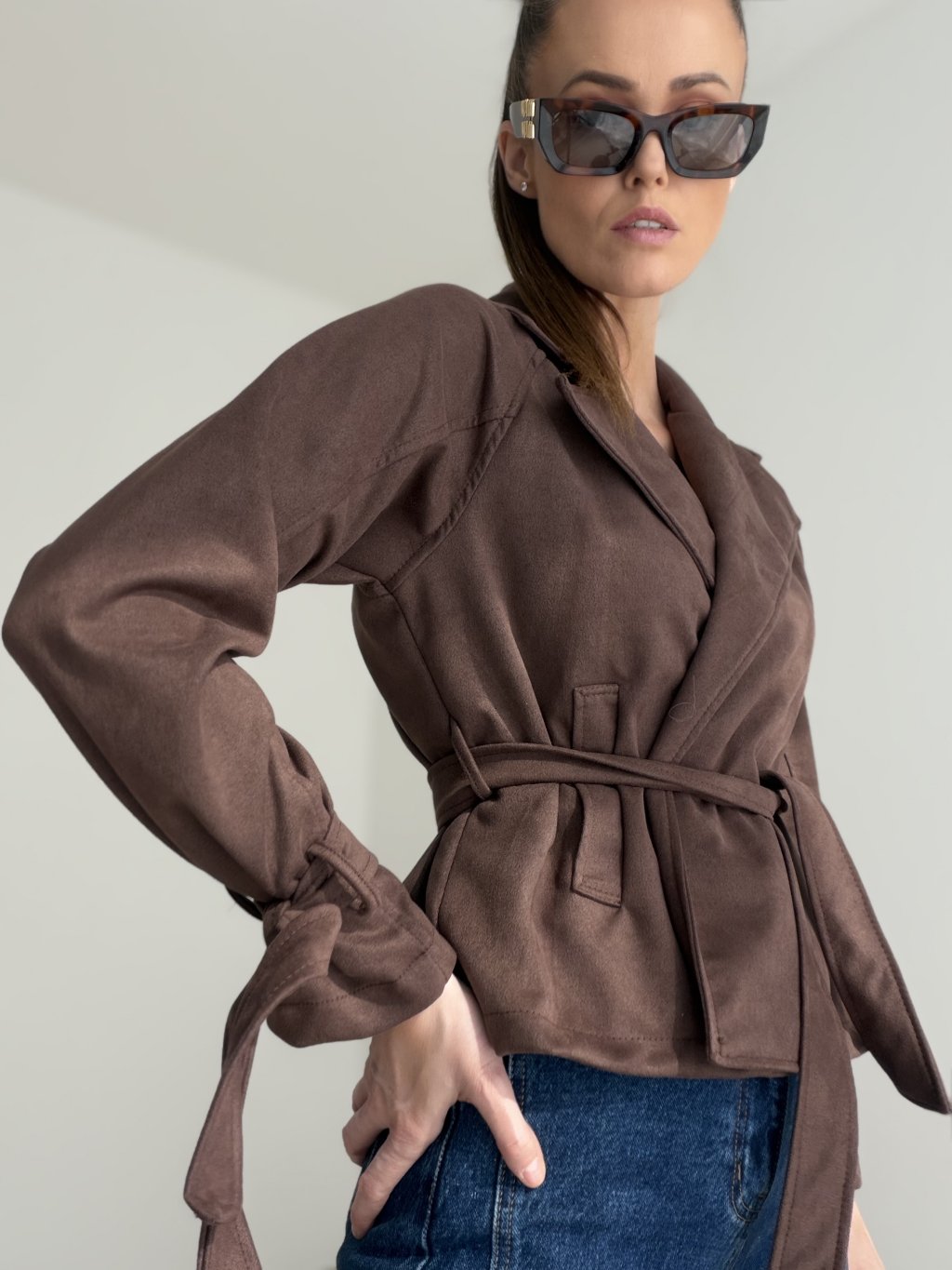Semišové sako je elegantný a ženský kúsok, ktorý dodá outfitu jemnosť aj štýlový charakter. Má príjemný mäkký povrch, moderný strih a viazanie v páse, vďaka ktorému si ho môžete krásne prispôsobiť postave. Výrazné fazóny a viazanie na rukávoch dodávajú modelu originálny detail, ktorý pôsobí sofistikovane a zároveň nenútene. Sako nie je podšité, preto je ľahšie, mäkšie a pohodlnejšie na nosenie.