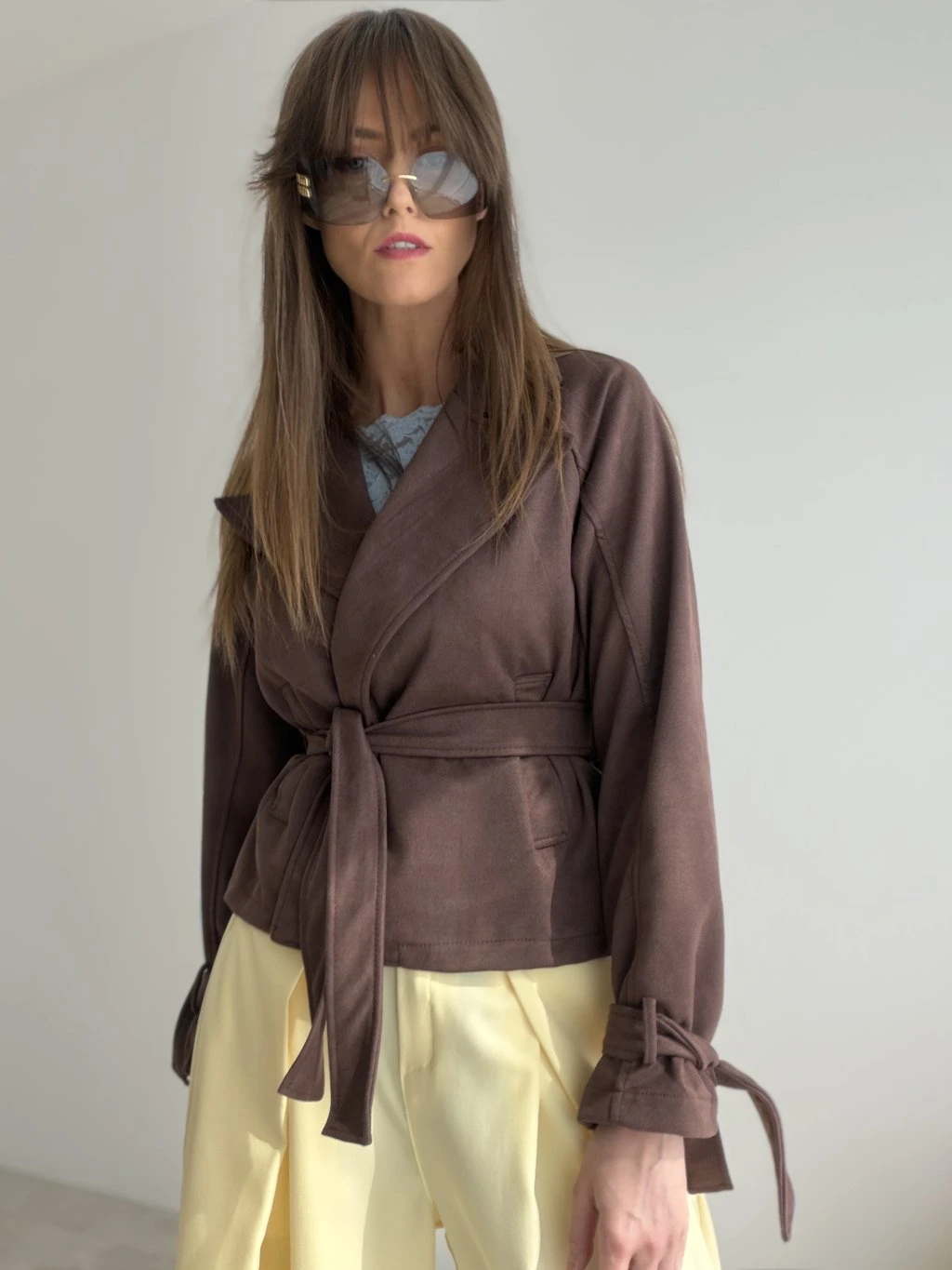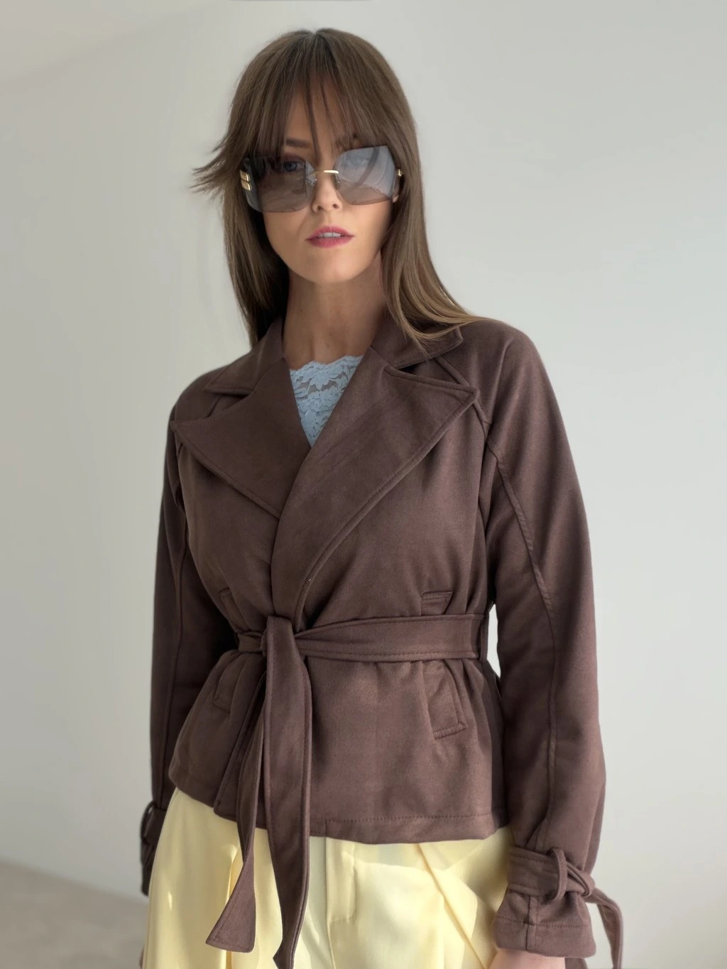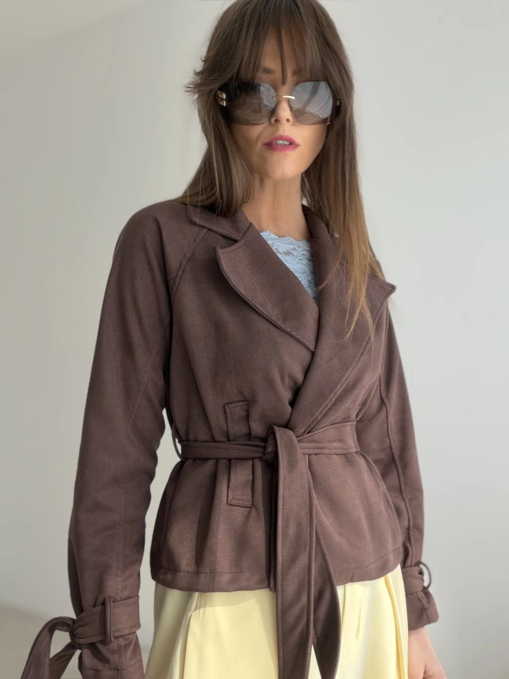 Semišové sako s viazaním v páse je elegantný a štýlový kúsok, ktorý krásne doplní každodenné aj ženské outfity. Nie je podšité, vďaka čomu je ľahké, mäkké a pohodlné na nosenie.