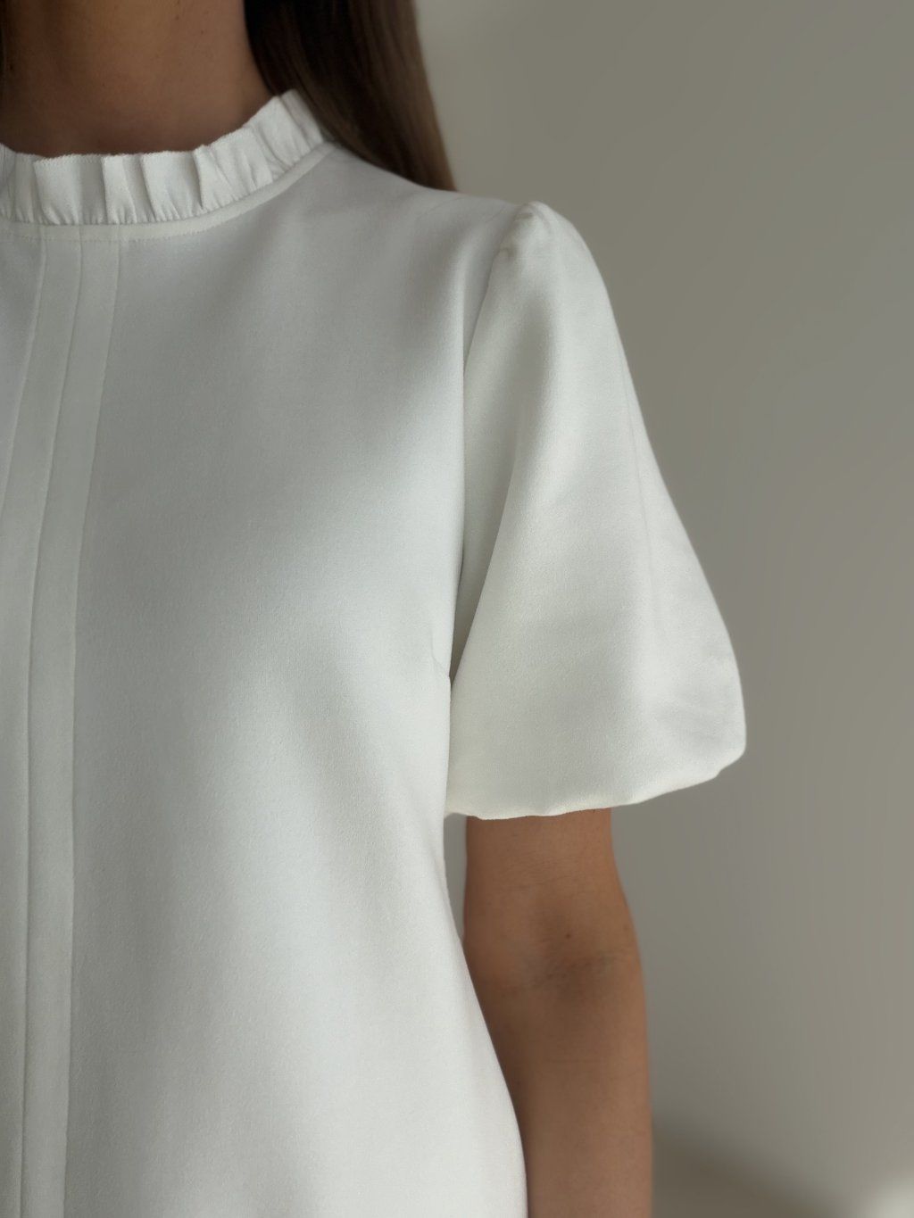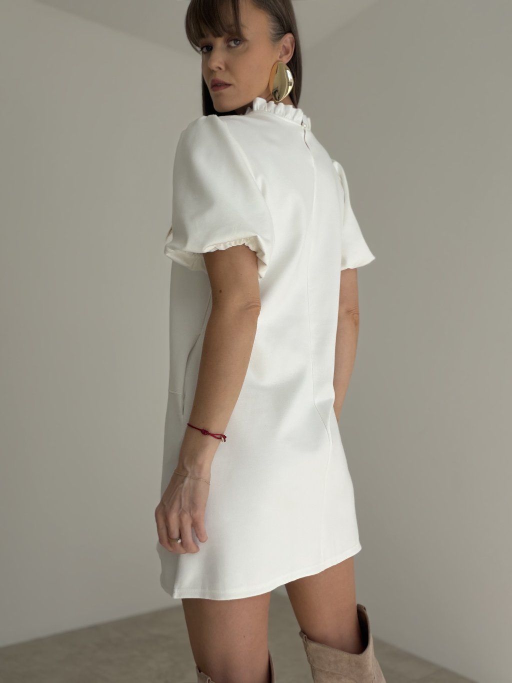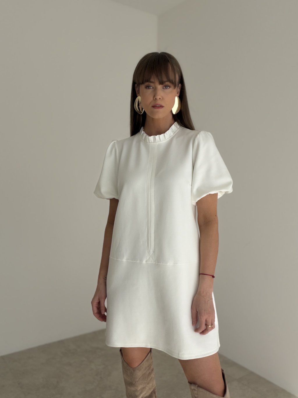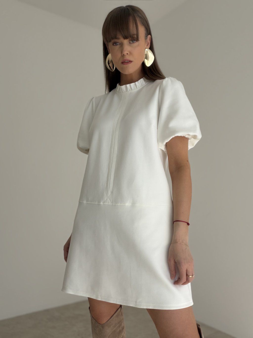 Semišové šaty s riaseným stojáčikom, krátkymi rukávmi s jemným objemom a praktickými bočnými vreckami. Elegantný, no pohodlný kúsok na každý deň.