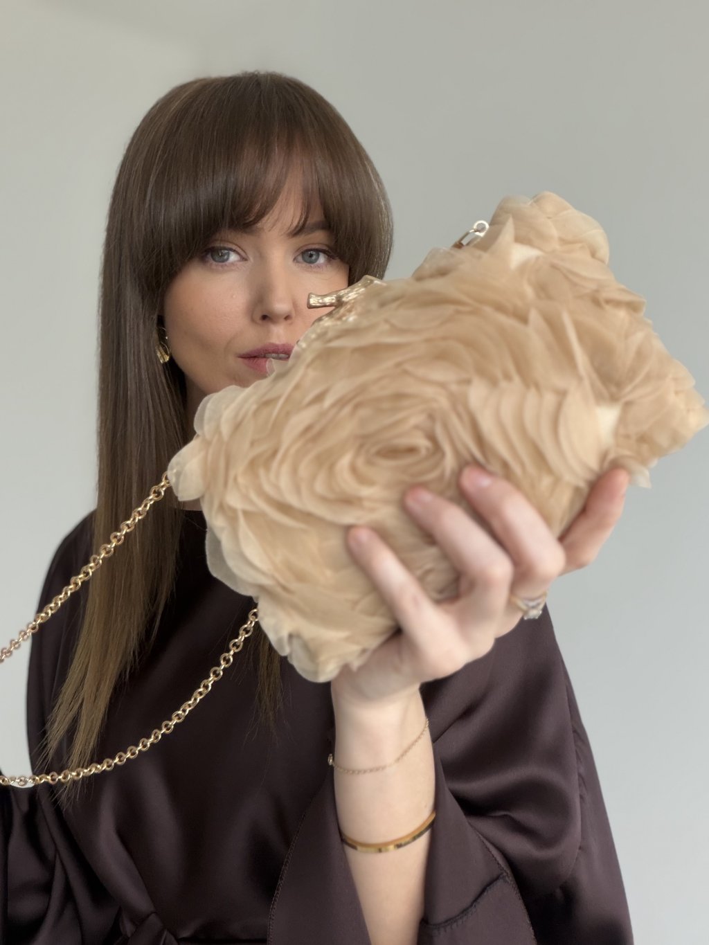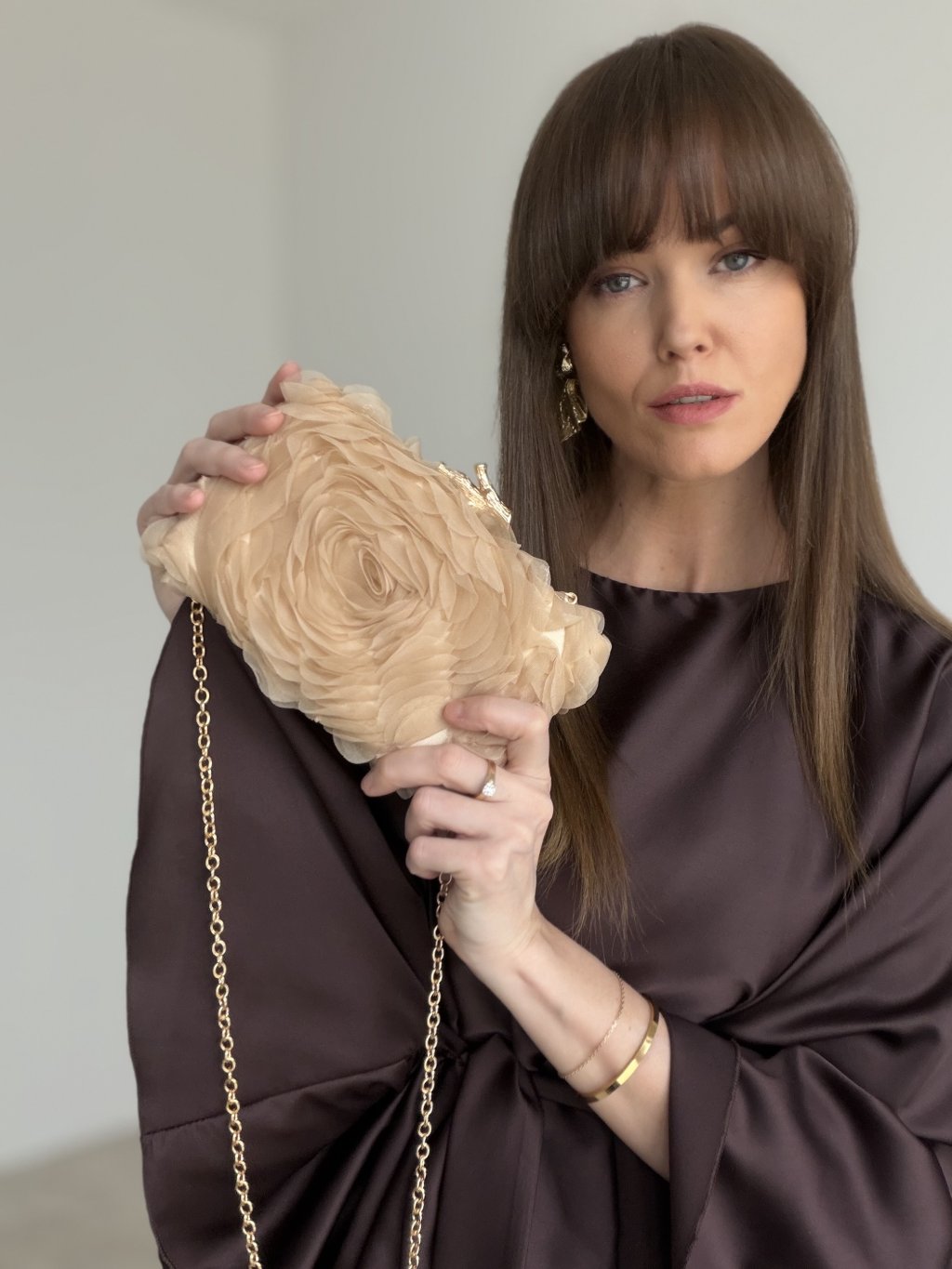Kabelka sa zapína na ozdobné kovové zapínanie a vďaka retiazke ju môžeš nosiť v ruke alebo cez plece, podľa toho, čo sa ti hodí viac. Je ideálna na svadby, oslavy, plesy, večere či eventy a krásne doplní saténové šaty, kostým aj jednoduché spoločenské kombinácie.