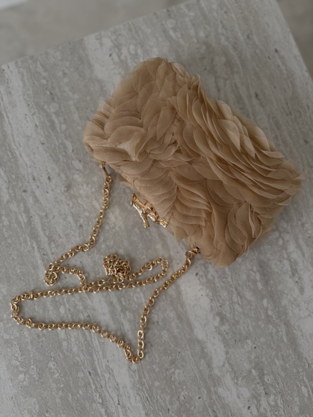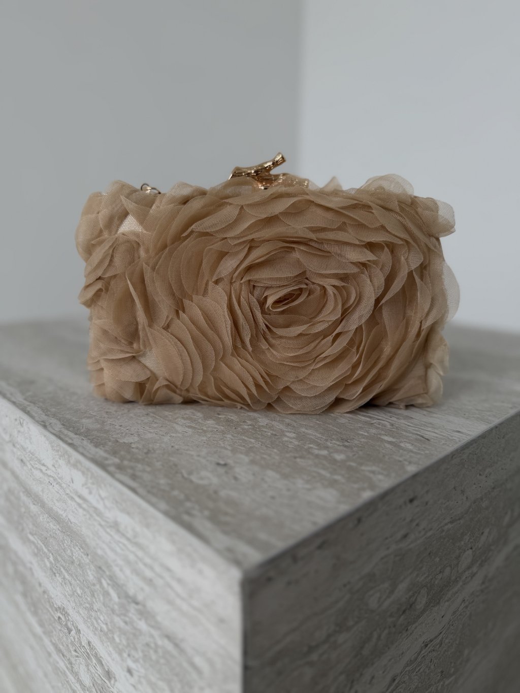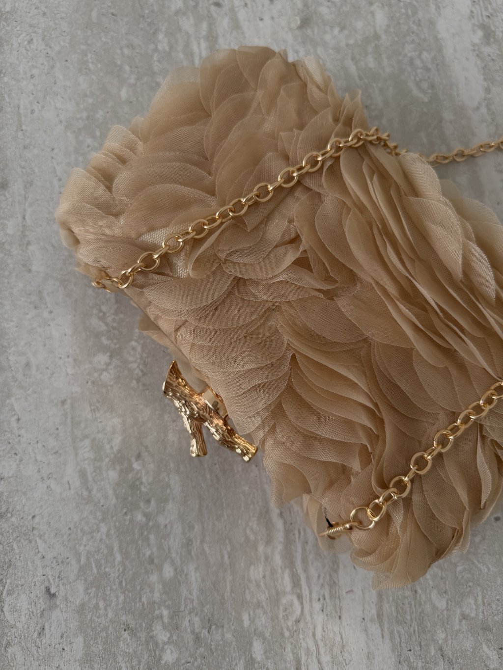 Táto spoločenská kabelka je výrazný doplnok, ktorý okamžite dodá outfitu slávnostný a elegantný charakter. Povrch tvorí jemná vrstvená textúra s efektom kvetinových aplikácií, vďaka čomu pôsobí kabelka luxusne a originálne aj bez ďalších výrazných doplnkov. Pevná konštrukcia s kovovým rámom drží tvar, takže všetko potrebné máš uložené bezpečne a upravene.