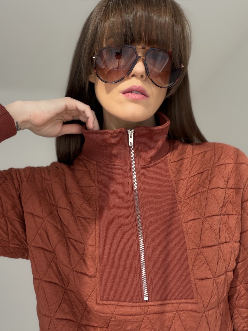 Štruktúrovaná mikina s prešívaným efektom, vyšším golierom a zipsom. Pohodlný voľnejší strih s patentmi na rukávoch a spodnom leme.