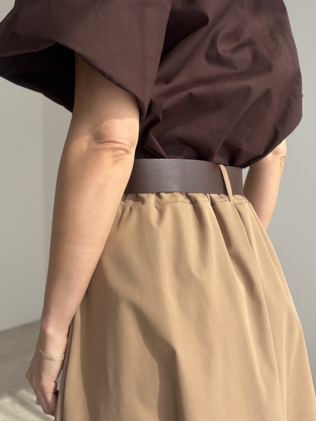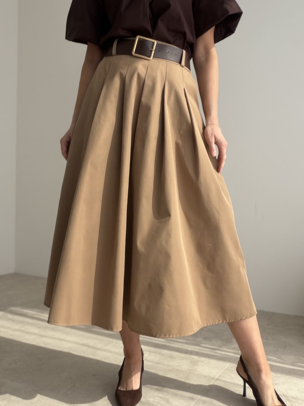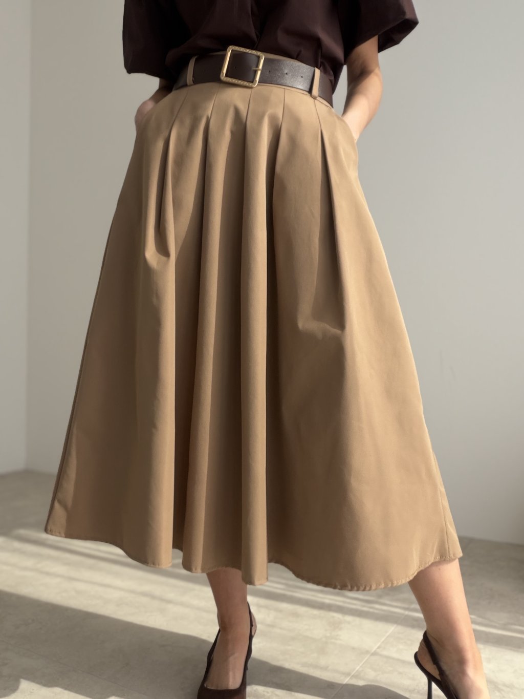 Elegantná sukňa s opaskom, splývavým strihom a pohodlnou gumou v páse, ktorá sa krásne prispôsobí postave. Ženský a univerzálny kúsok na bežné aj elegantnejšie príležitosti.