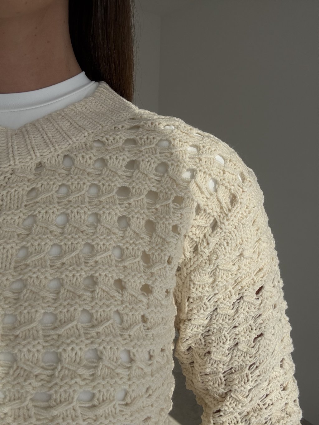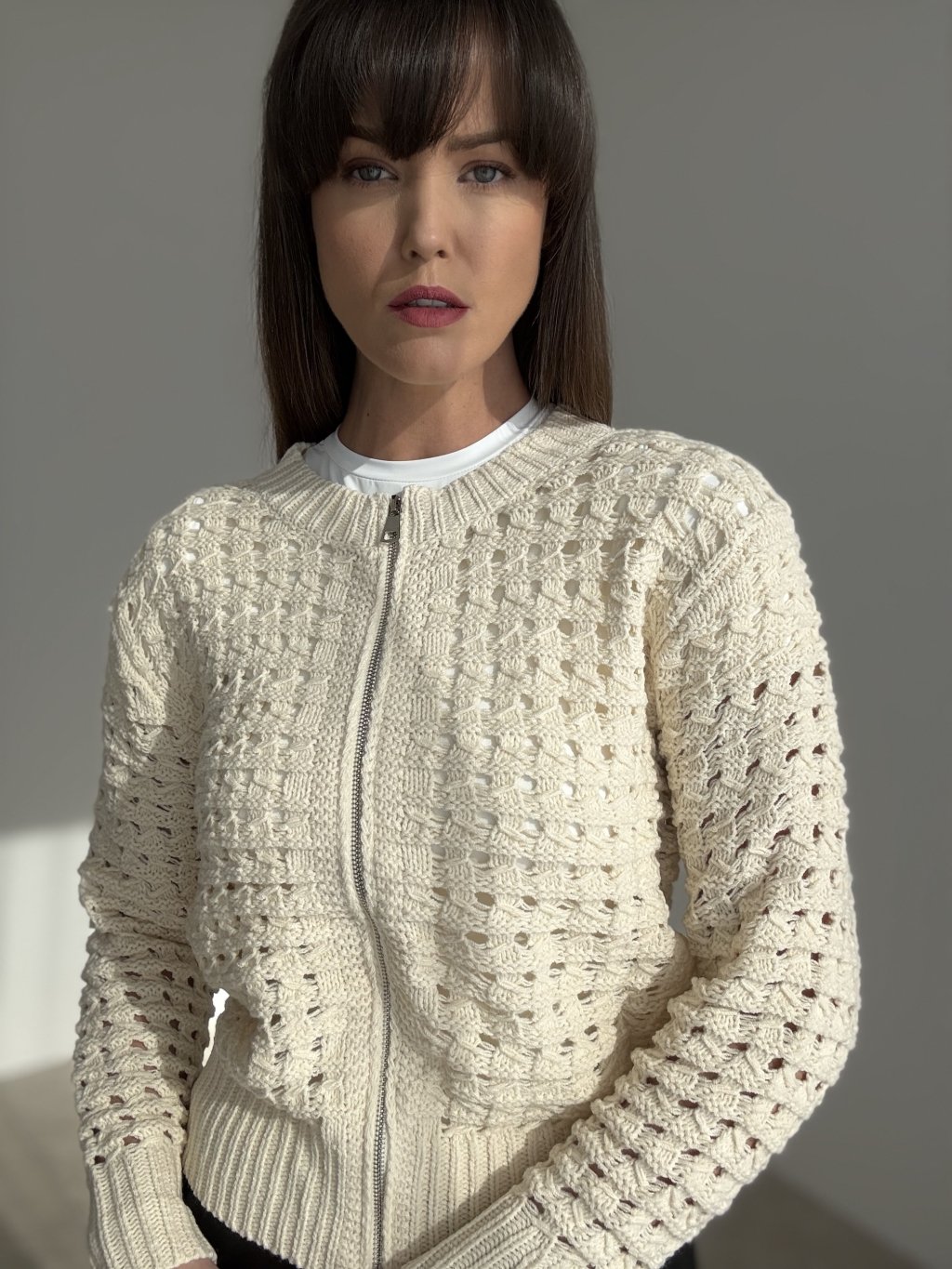 Krátky pletený sveter s jemným ažurovým vzorom a zapínaním na zips. Rovnejší pohodlný strih so spadnutým ramenom pôsobí moderne a ľahko sa vrství cez top či šaty. Okrúhly výstrih, výrazné rebrované lemy na rukávoch a v páse pekne držia tvar. Vzdušná pletenina je príjemná na každý deň a dodá outfitu štruktúru.