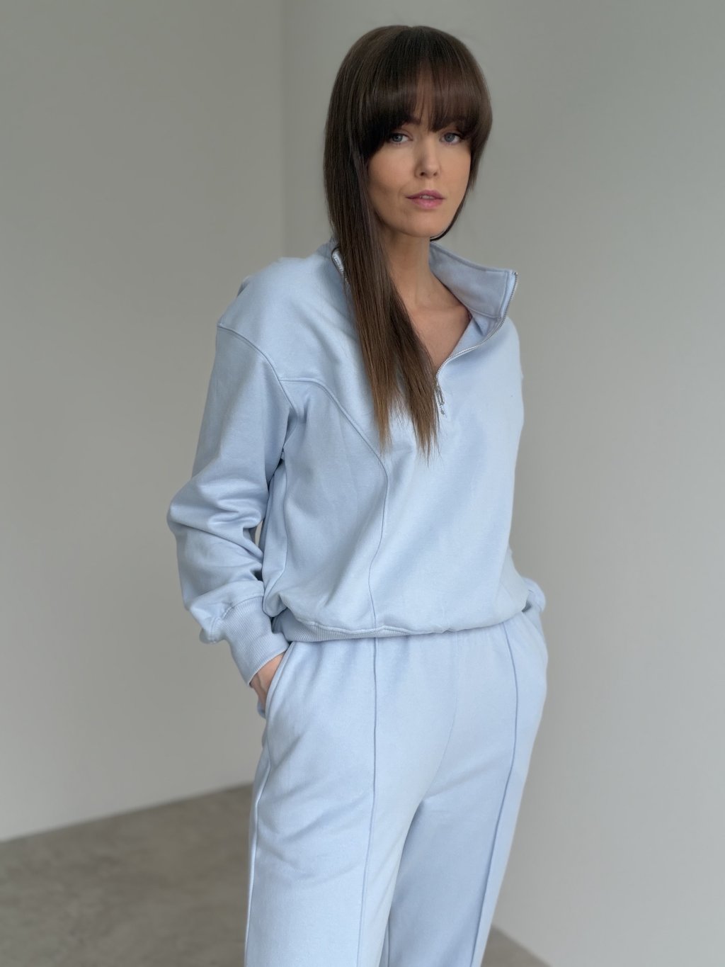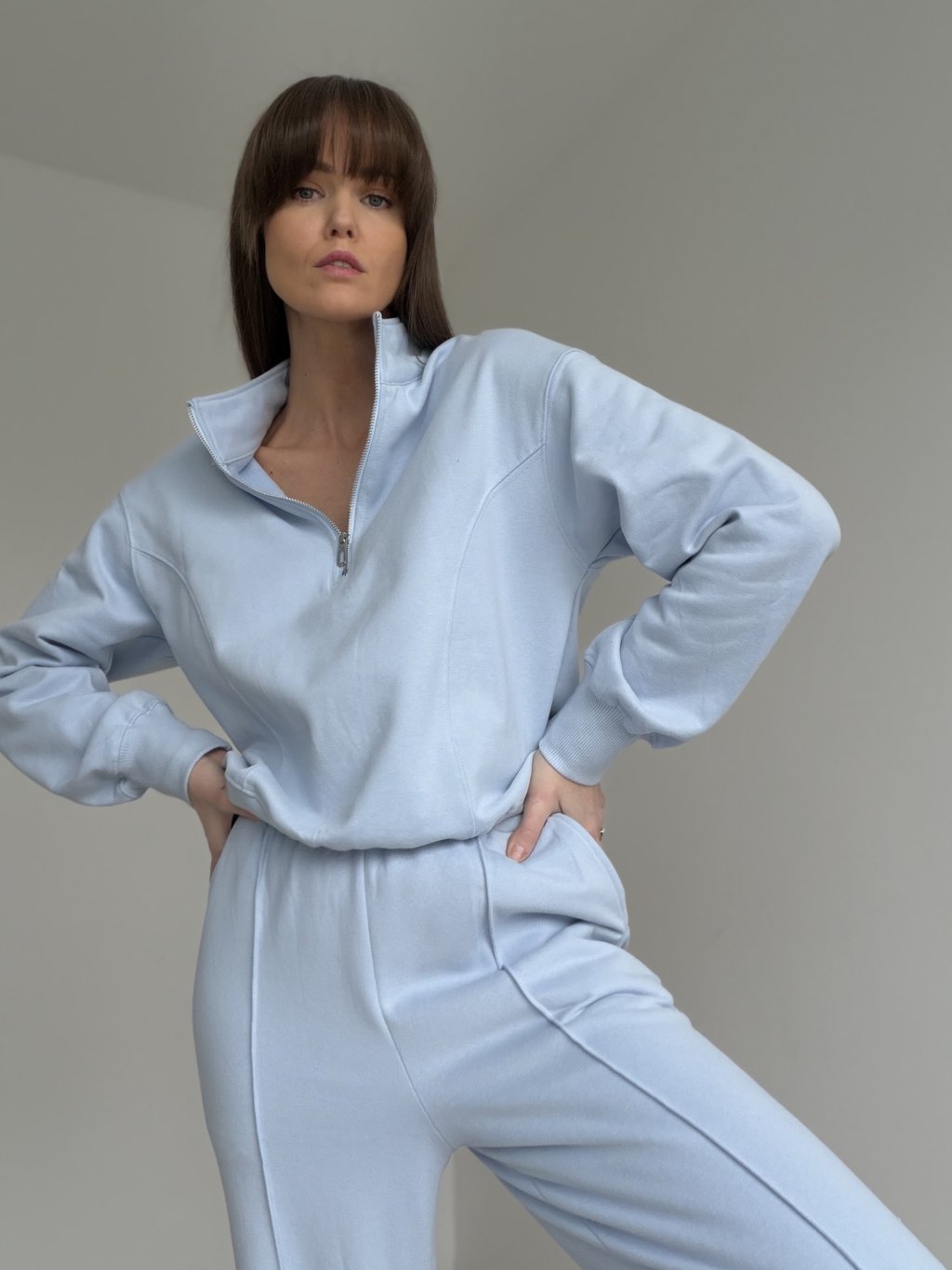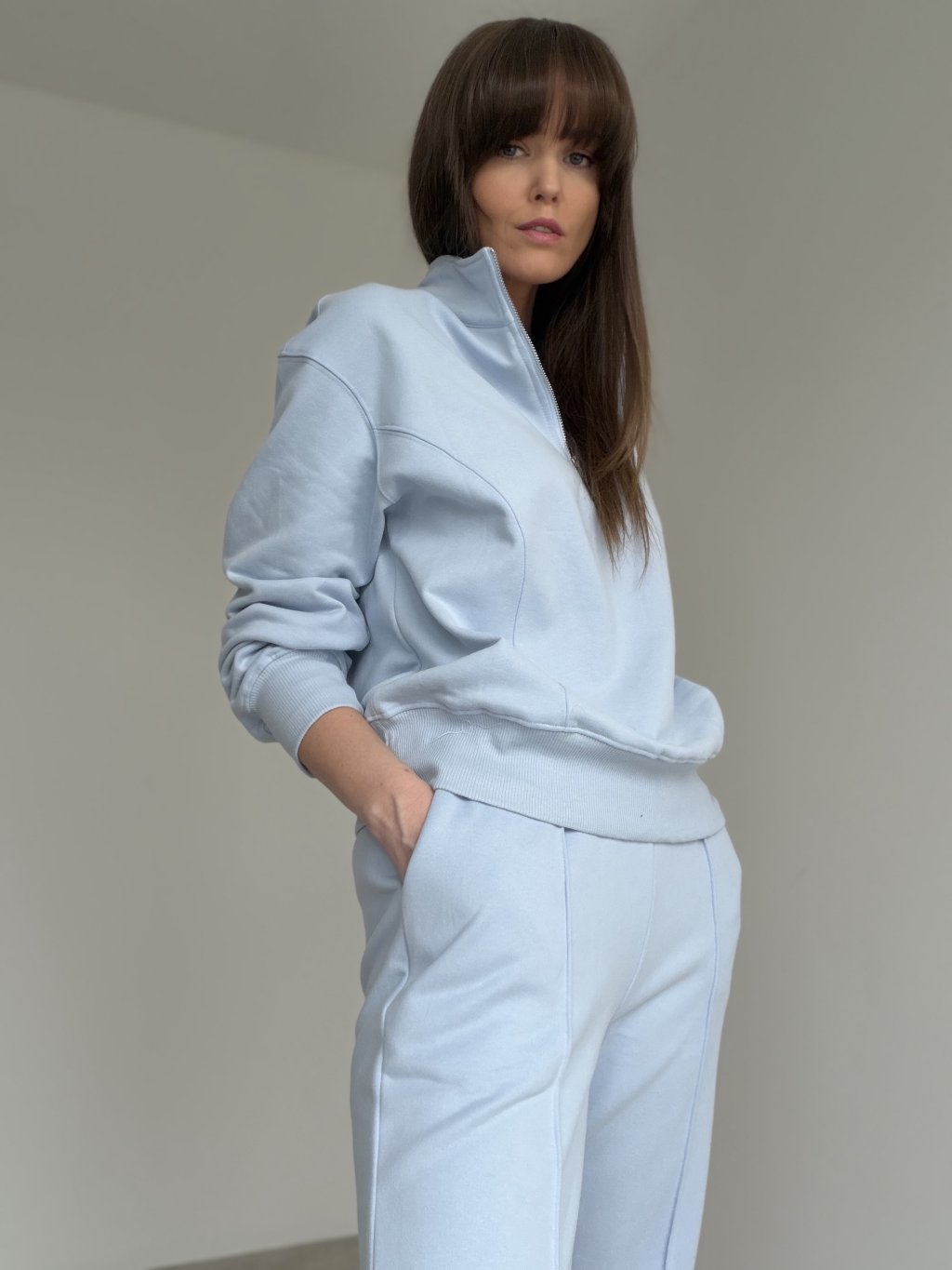 Tepláková súprava v modernom, čistom prevedení, ktorá spája pohodlie s upraveným vzhľadom. Mikina má vyšší stojačik a zips pri krku, vďaka čomu sa dá nosiť otvorená aj zapnutá podľa toho, aký efekt chceš dosiahnuť. Strih je uvoľnený, no pôsobí žensky vďaka prepracovaným líniám a detailom. Tepláky majú elastický pás, praktické vrecká a zúžené zakončenie, ktoré drží tvar a pekne sadne na obuv. Celok je ideálny na voľný deň, cestovanie aj pohodlný mestský outfit, ktorý vyzerá štýlovo bez námahy.