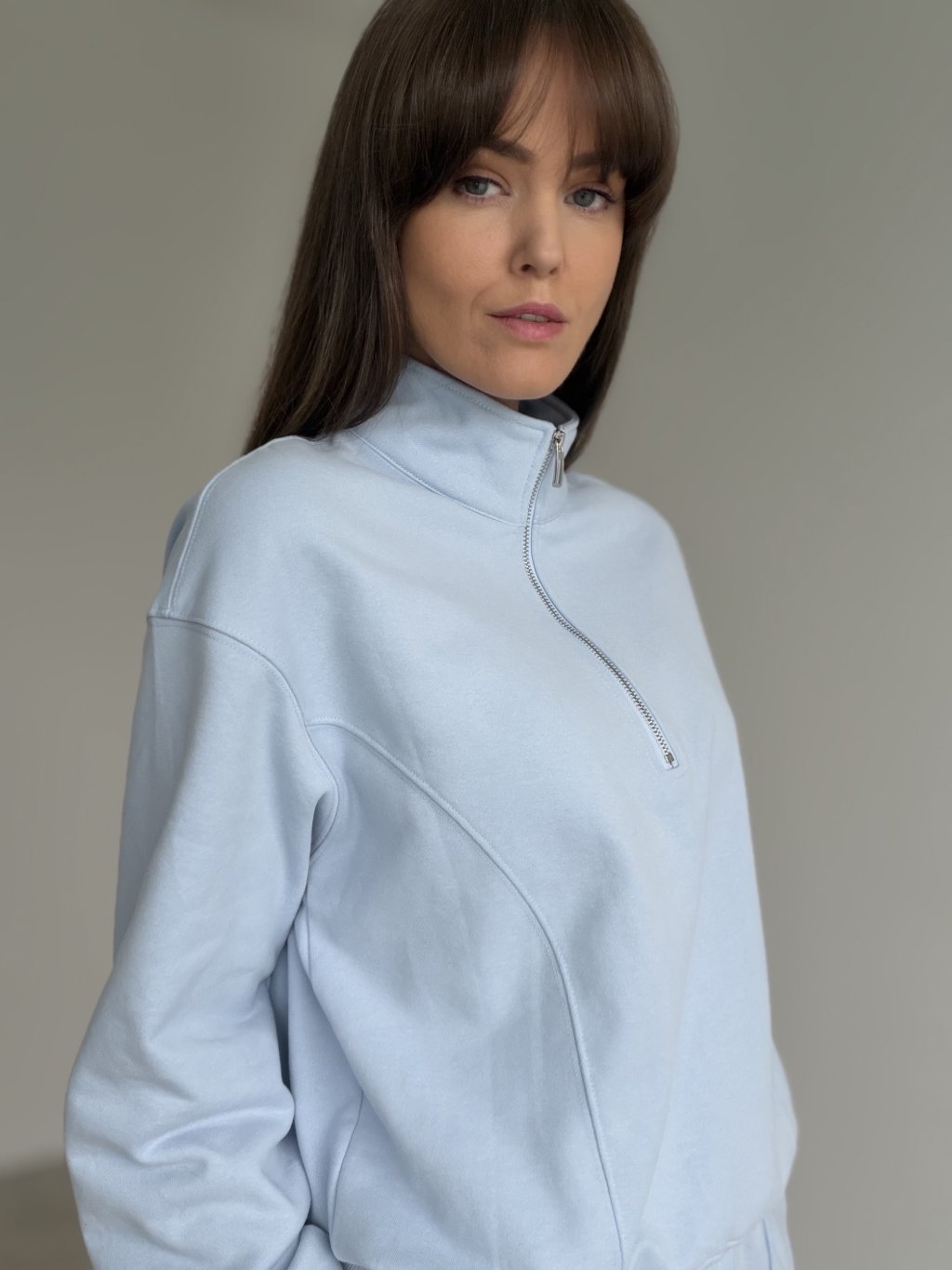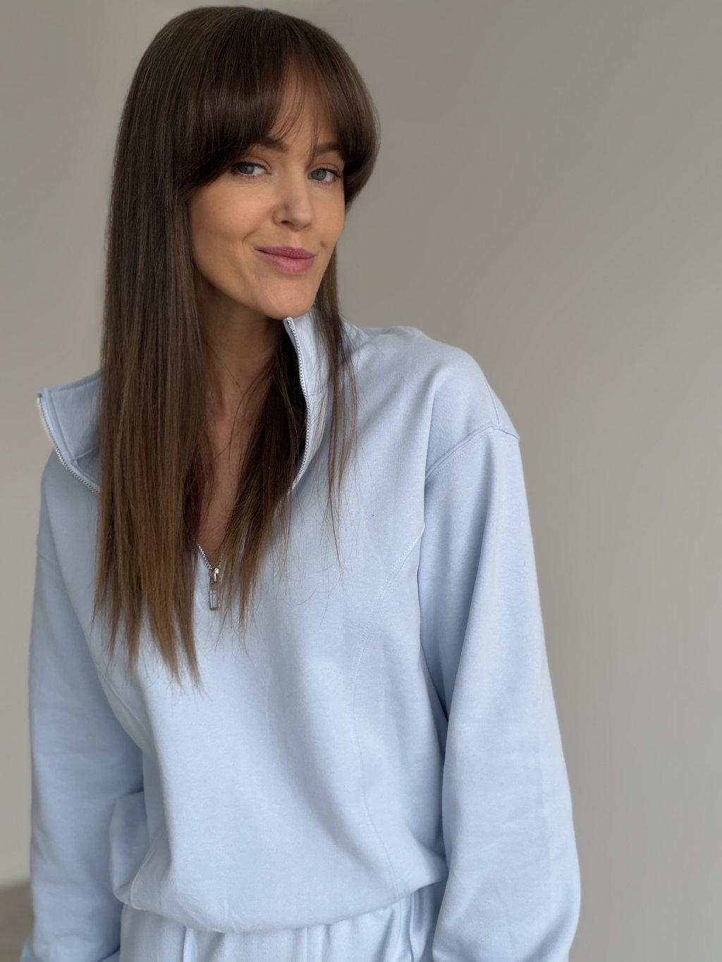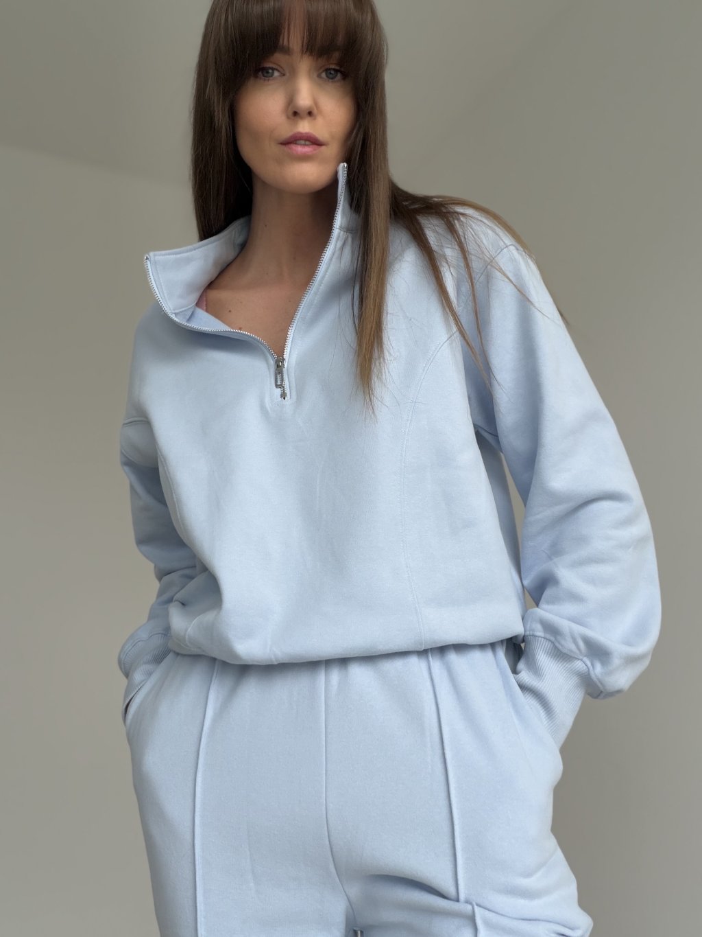 Tepláková súprava v modernom, čistom prevedení, ktorá spája pohodlie s upraveným vzhľadom. Mikina má vyšší stojačik a zips pri krku, vďaka čomu sa dá nosiť otvorená aj zapnutá podľa toho, aký efekt chceš dosiahnuť. Strih je uvoľnený, no pôsobí žensky vďaka prepracovaným líniám a detailom. Tepláky majú elastický pás, praktické vrecká a zúžené zakončenie, ktoré drží tvar a pekne sadne na obuv. Celok je ideálny na voľný deň, cestovanie aj pohodlný mestský outfit, ktorý vyzerá štýlovo bez námahy.