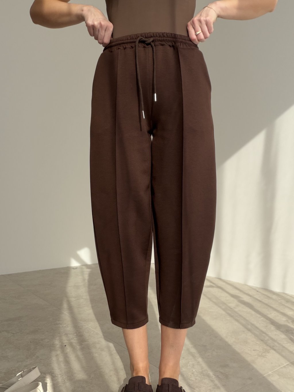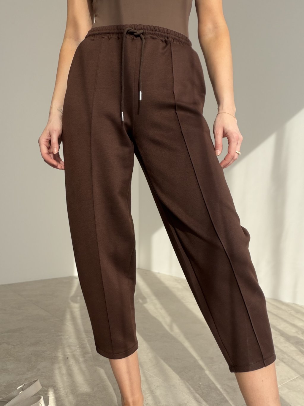 Pohodlné tepláky s čistým, elegantným vzhľadom sú presne ten kúsok, ktorý využiješ na bežný deň aj na cestovanie. Majú pružný pás so šnúrkou na stiahnutie, takže sa pekne prispôsobia postave a držia tam, kde majú. Strih je voľnejší, no vďaka prepracovaným líniám pôsobí upravene a moderne – nie „domácky“. Dĺžka nad členky a jemne zúžené nohavice robia peknú siluetu a skvele sa kombinujú s teniskami aj s mestskou obuvou.
