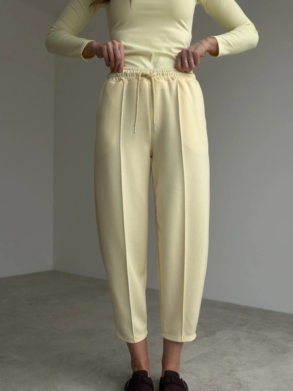 Pohodlné tepláky s čistým, elegantným vzhľadom sú presne ten kúsok, ktorý využiješ na bežný deň aj na cestovanie. Majú pružný pás so šnúrkou na stiahnutie, takže sa pekne prispôsobia postave a držia tam, kde majú. Strih je voľnejší, no vďaka prepracovaným líniám pôsobí upravene a moderne – nie „domácky“. Dĺžka nad členky a jemne zúžené nohavice robia peknú siluetu a skvele sa kombinujú s teniskami aj s mestskou obuvou.