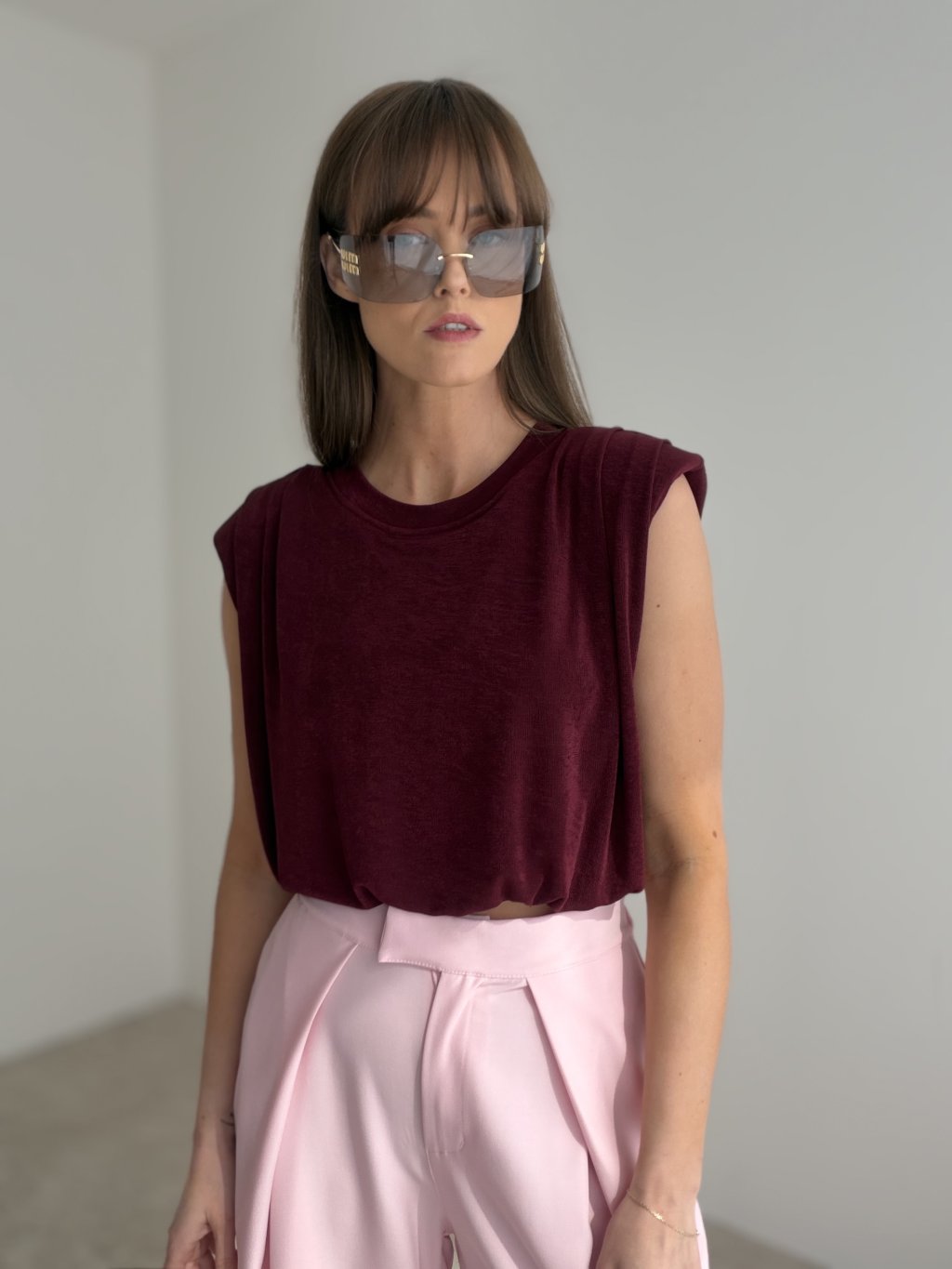 Štýlový top s vypchávkami, ktorý pôsobí moderne, žensky a zároveň veľmi pohodlne. Tento model zaujme na prvý pohľad jednoduchým strihom doplneným o výraznejšie ramená, ktoré krásne formujú siluetu a dodávajú outfitu sebavedomý módny charakter. Vďaka príjemnému materiálu a voľnejšiemu padnutiu je ideálny na každodenné nosenie aj na vytvorenie premyslenejšieho mestského looku.