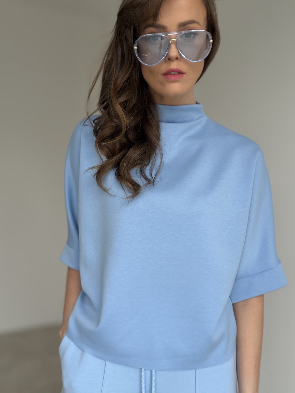 Top so stojačikom s voľnejším strihom a širšími rukávmi s manžetovým zakončením. Elegantný, pohodlný a ľahko kombinovateľný.