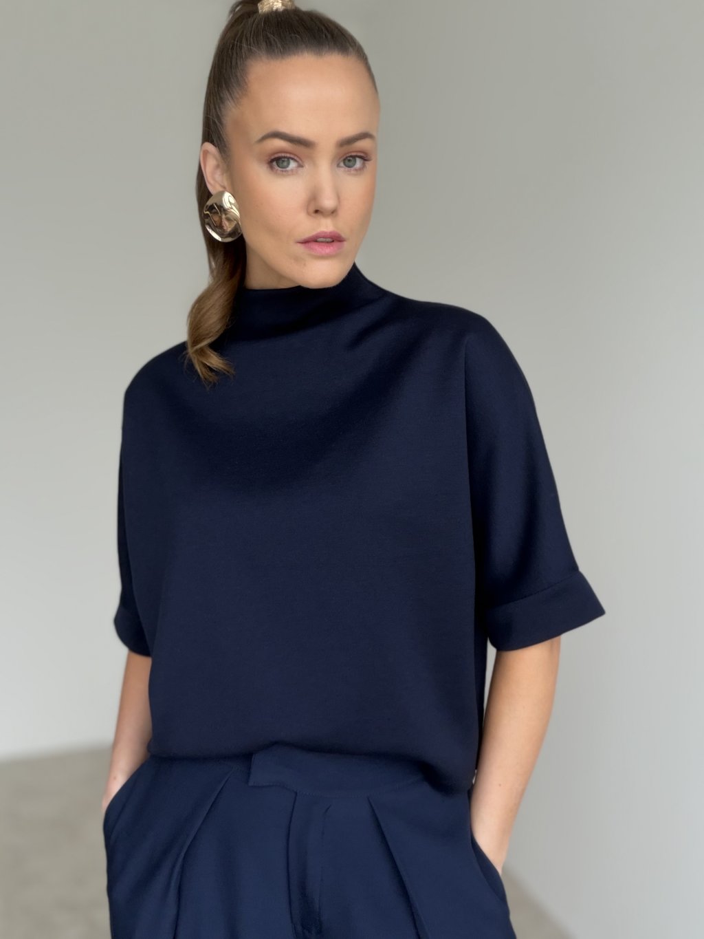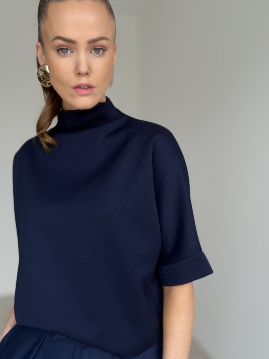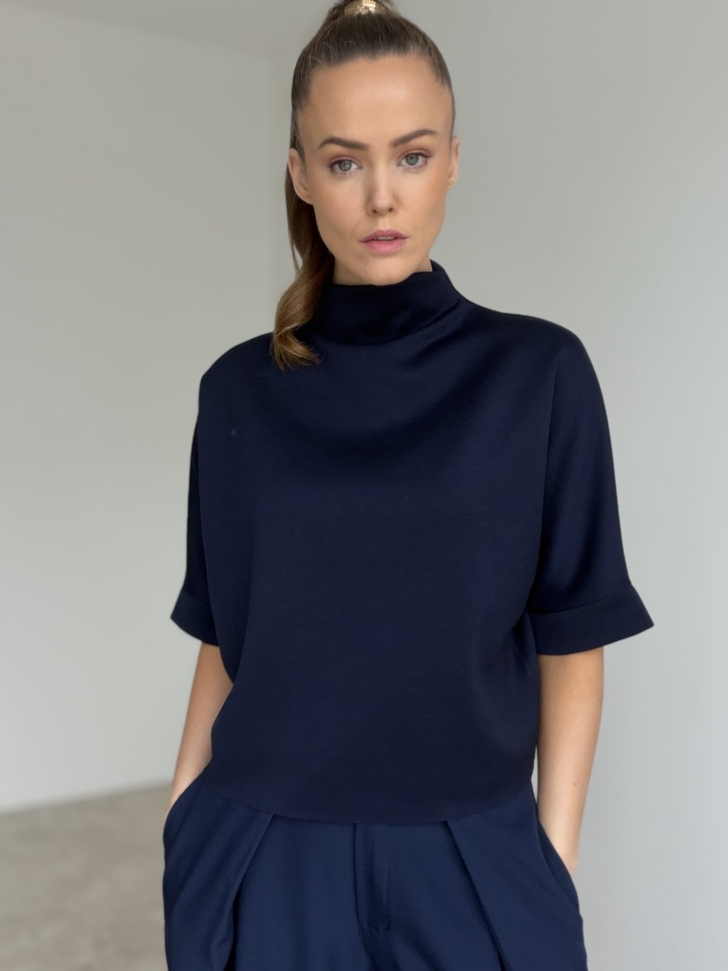 Top so stojačikom s voľnejším strihom a širšími rukávmi s manžetovým zakončením. Elegantný, pohodlný a ľahko kombinovateľný.