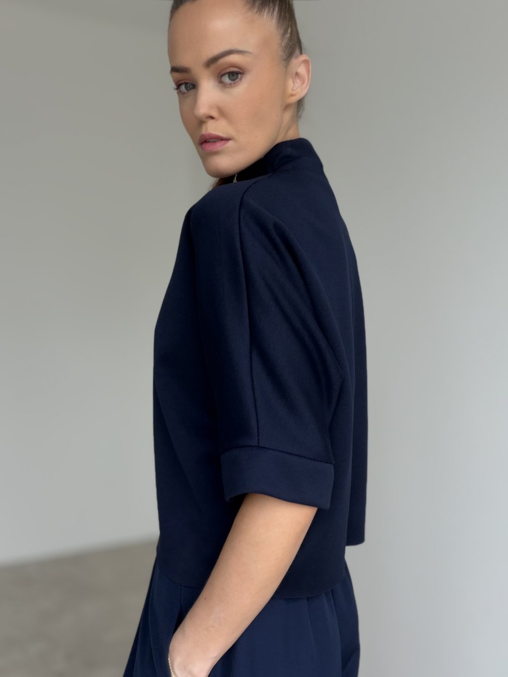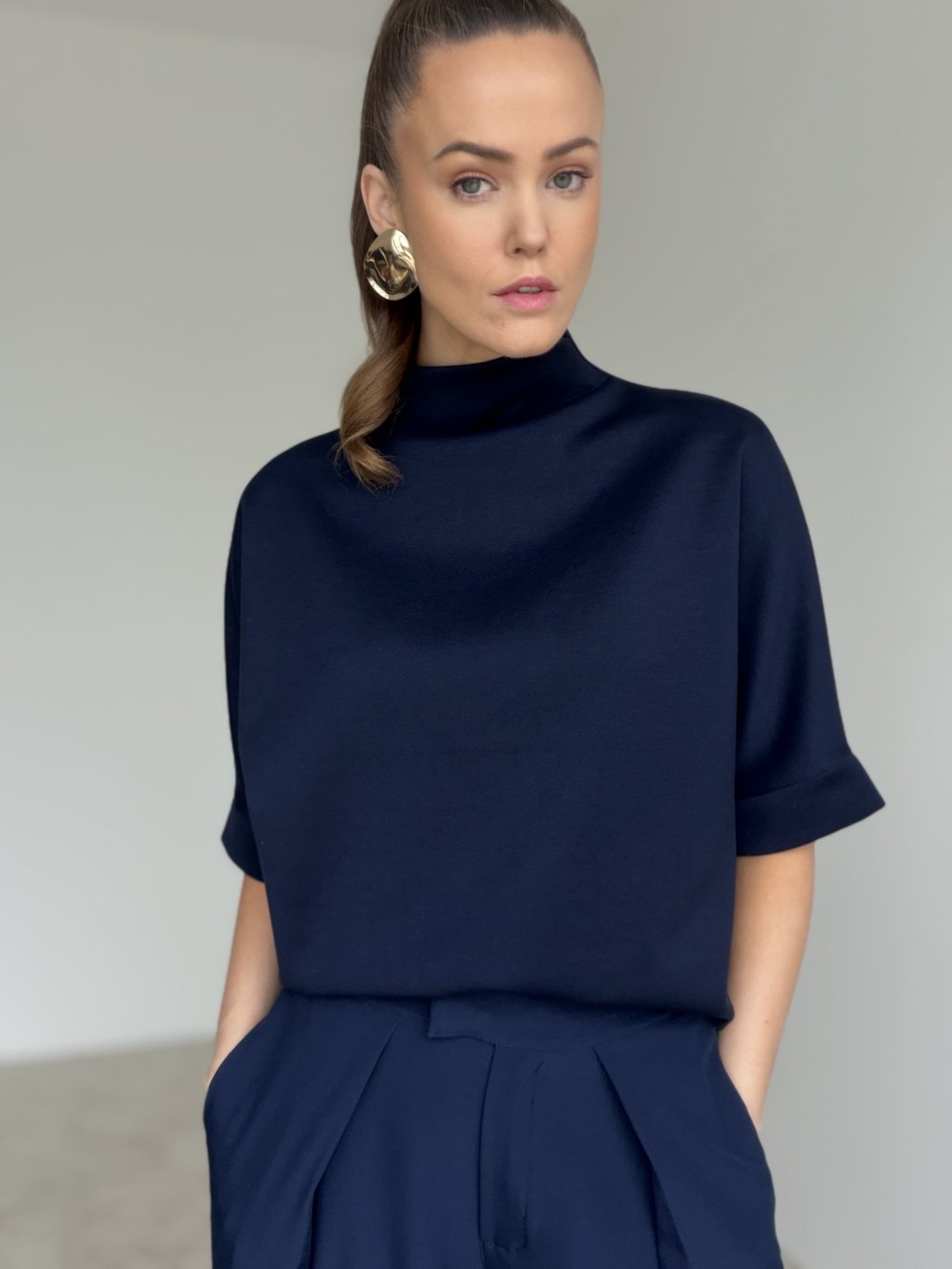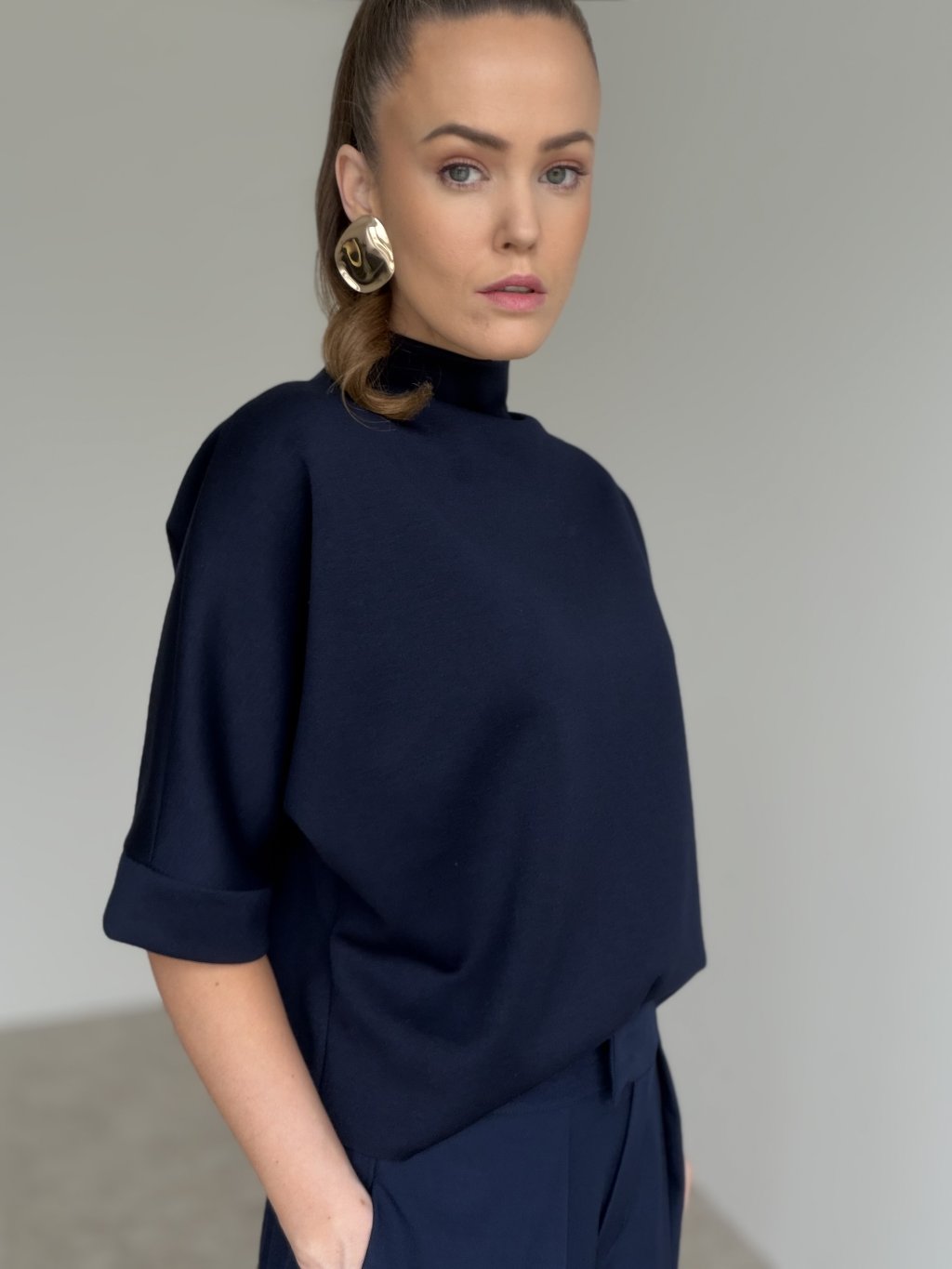 Top so stojačikom s voľnejším strihom a širšími rukávmi s manžetovým zakončením. Elegantný, pohodlný a ľahko kombinovateľný.