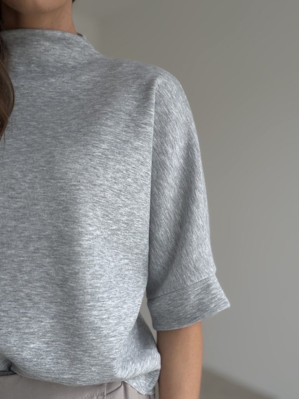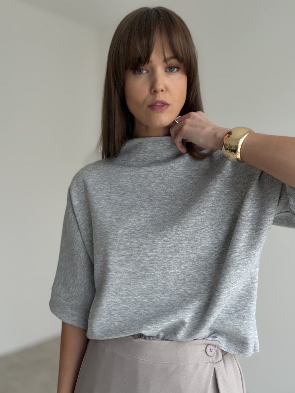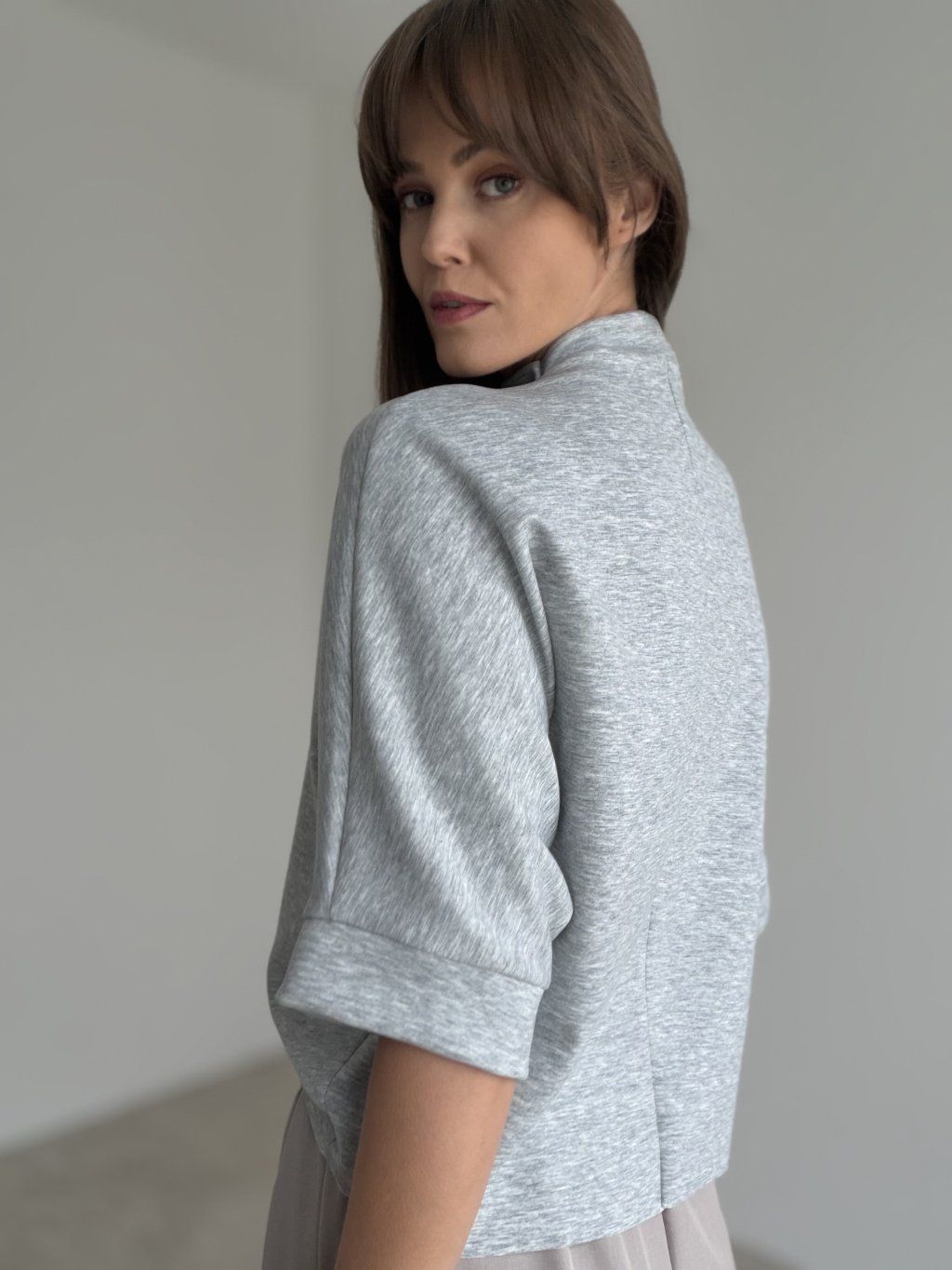 Top so stojačikom s voľnejším strihom a širšími rukávmi s manžetovým zakončením. Elegantný, pohodlný a ľahko kombinovateľný.