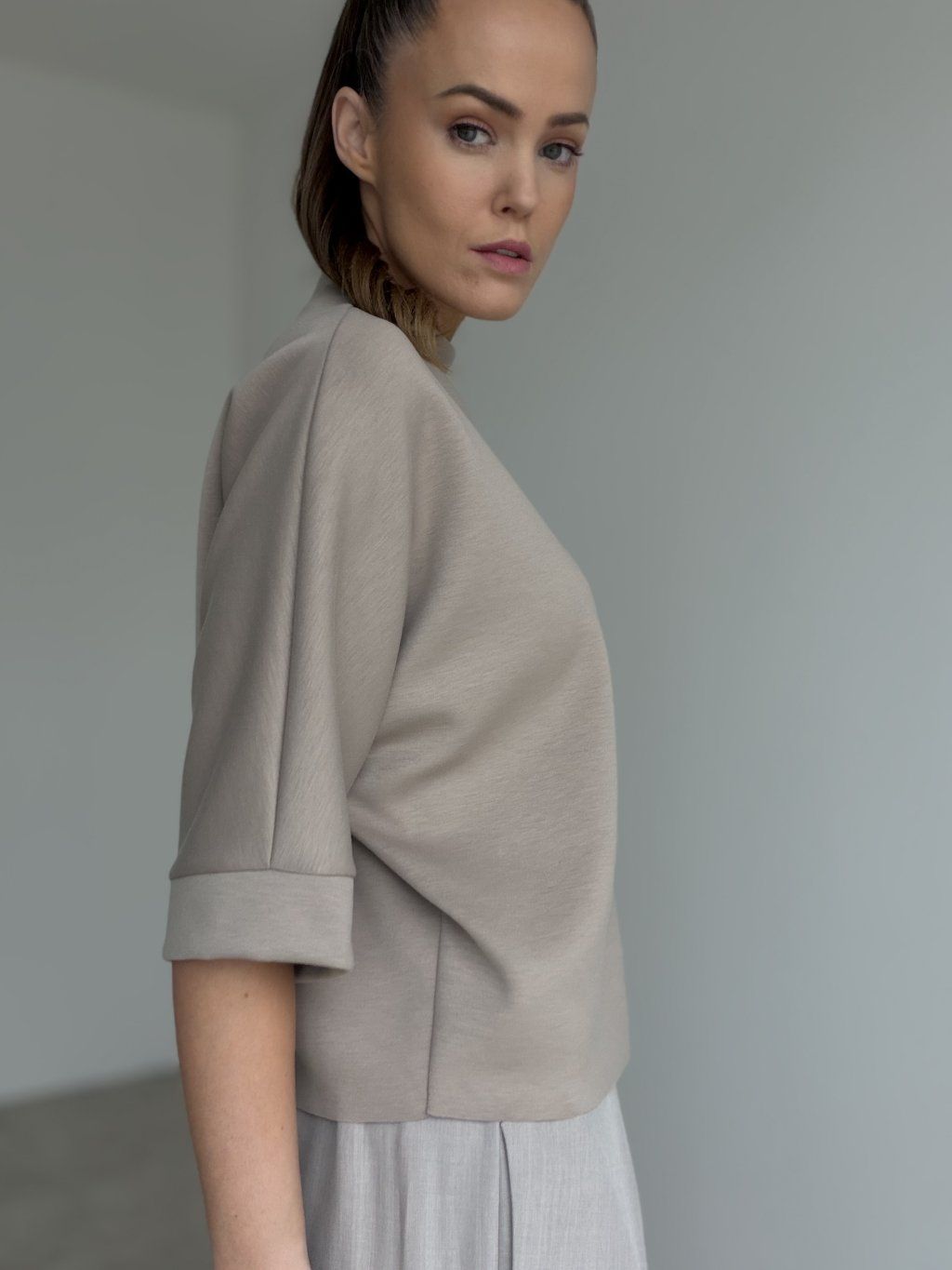 Top so stojačikom s voľnejším strihom a širšími rukávmi s manžetovým zakončením. Elegantný, pohodlný a ľahko kombinovateľný.
