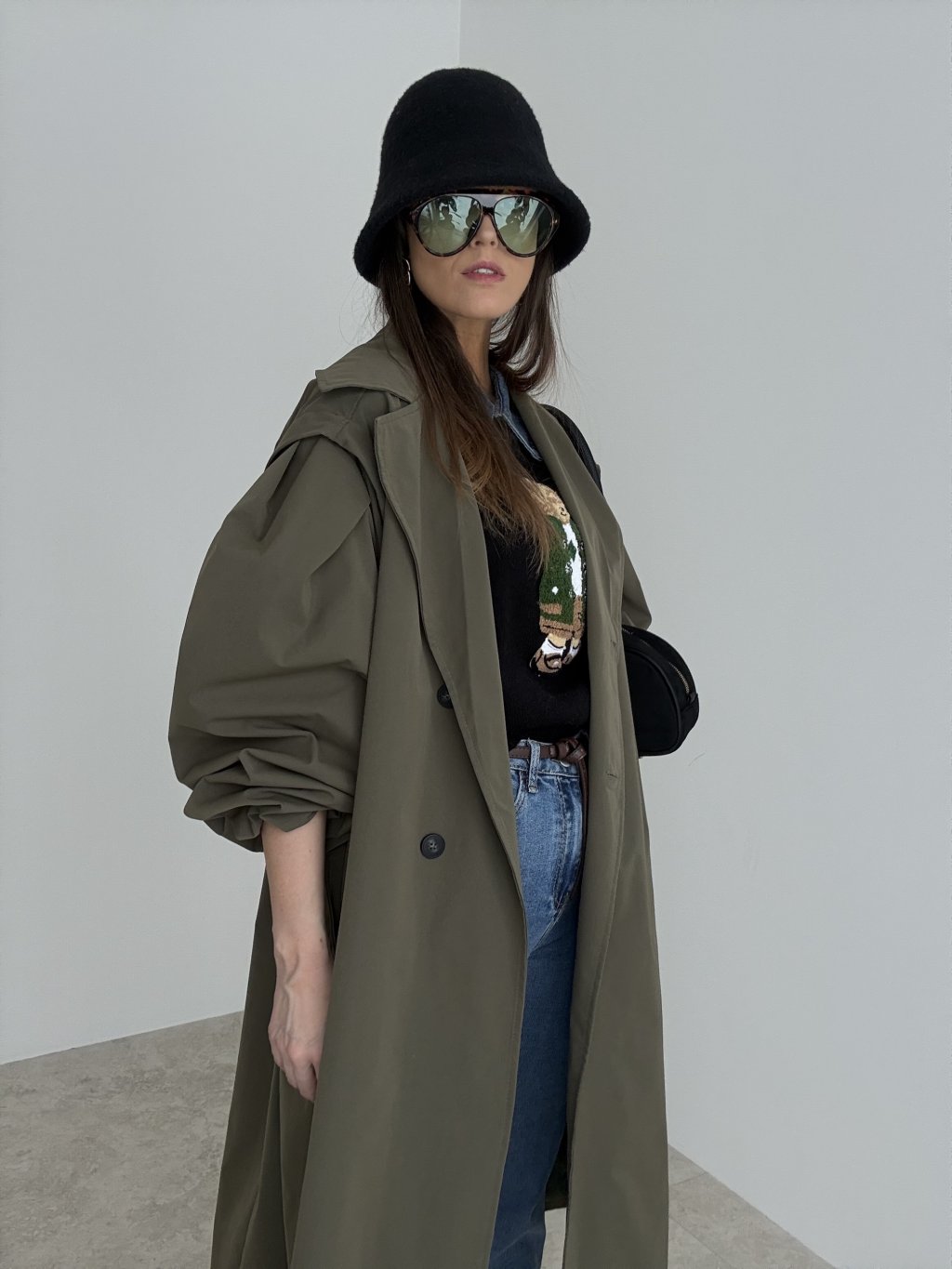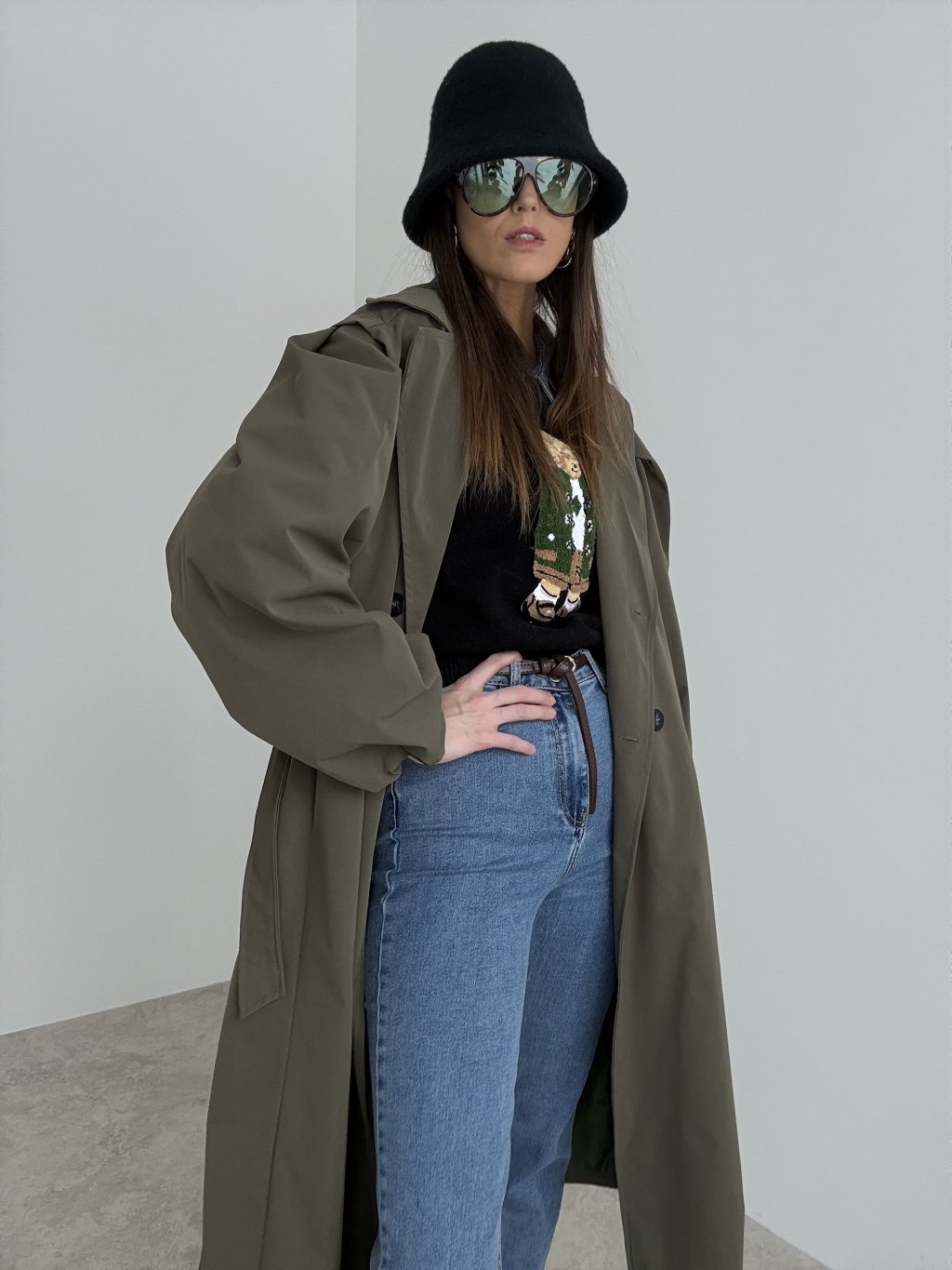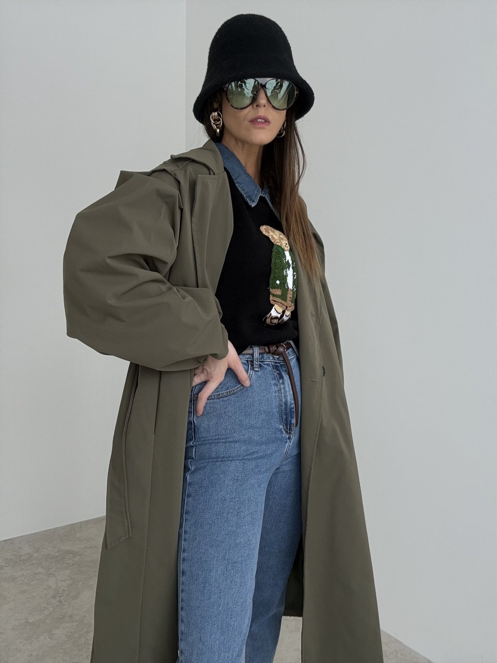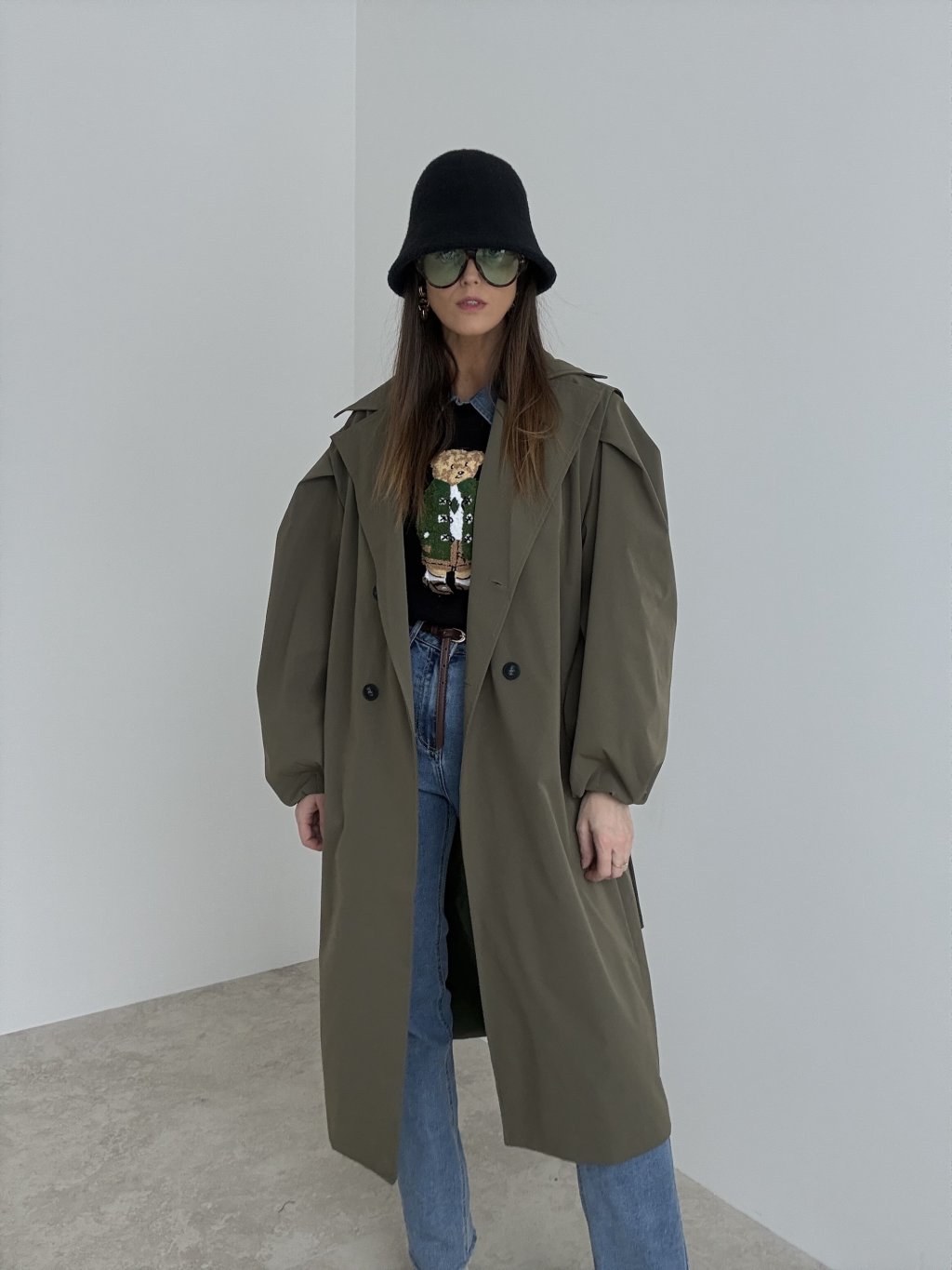 Dlhší trenčkot s výraznými klopami, voľnejším strihom a efektnými rukávmi. S opaskom na zvýraznenie pásu alebo nosenie na voľno.
