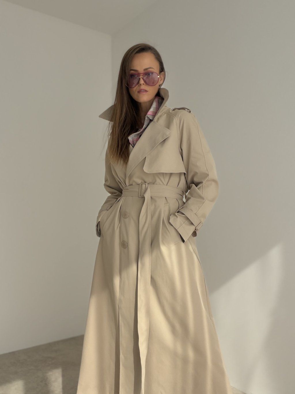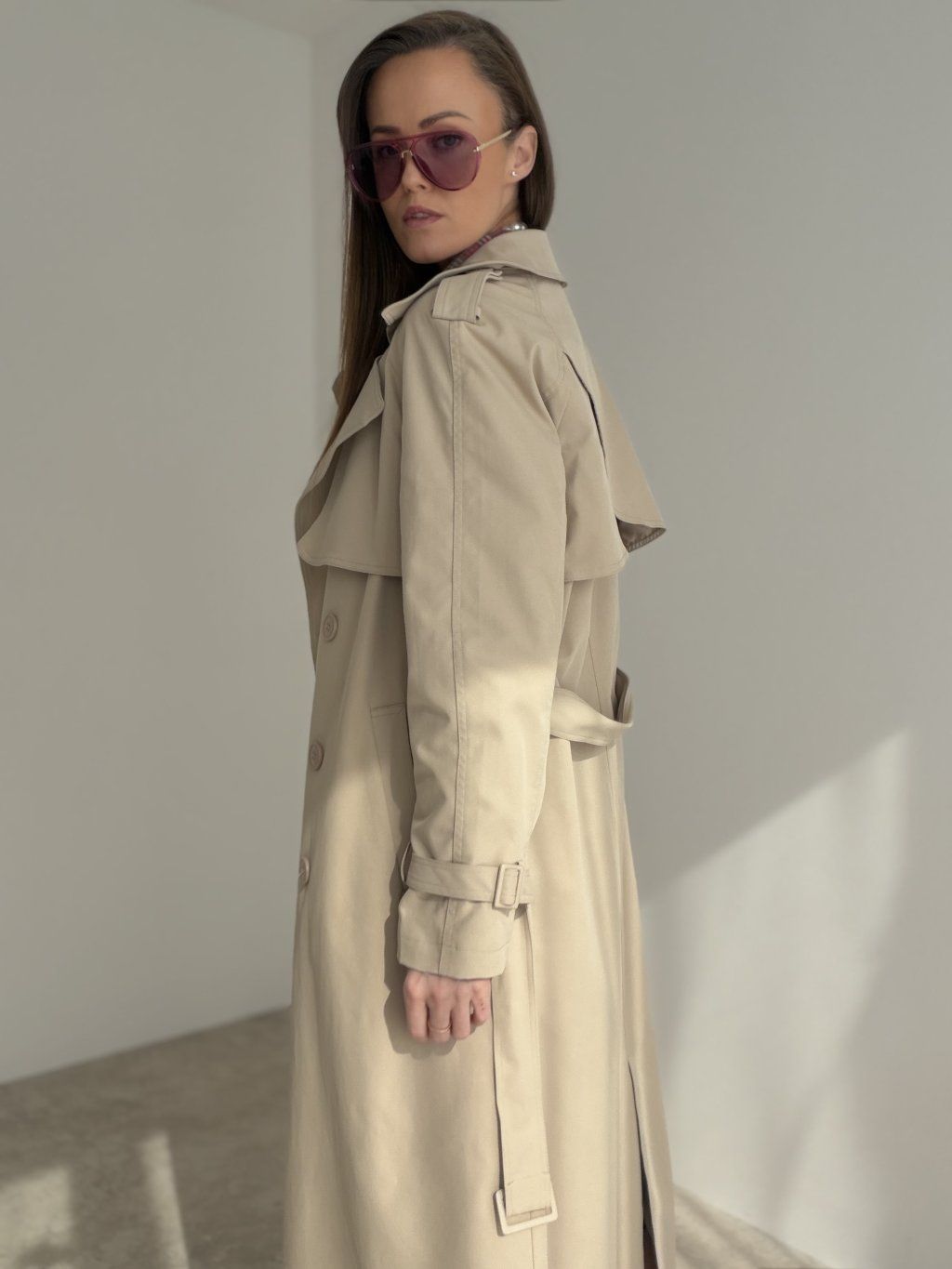 Dlhý trenčkot s dvojradovým zapínaním, klopami a detailmi na ramenách aj rukávoch. Nadčasový kabát do mesta aj do práce.