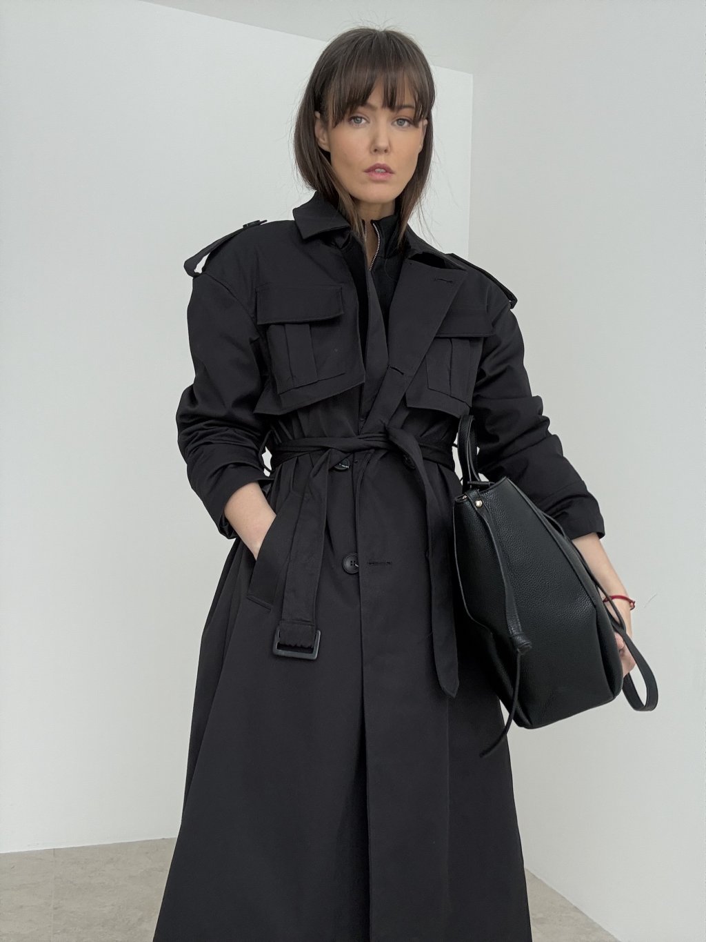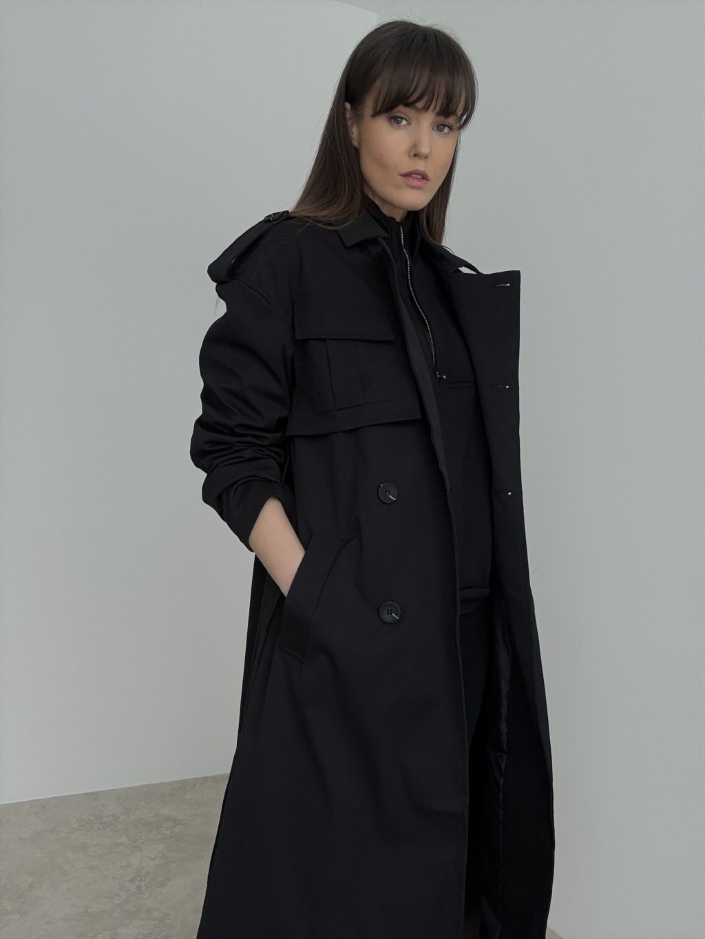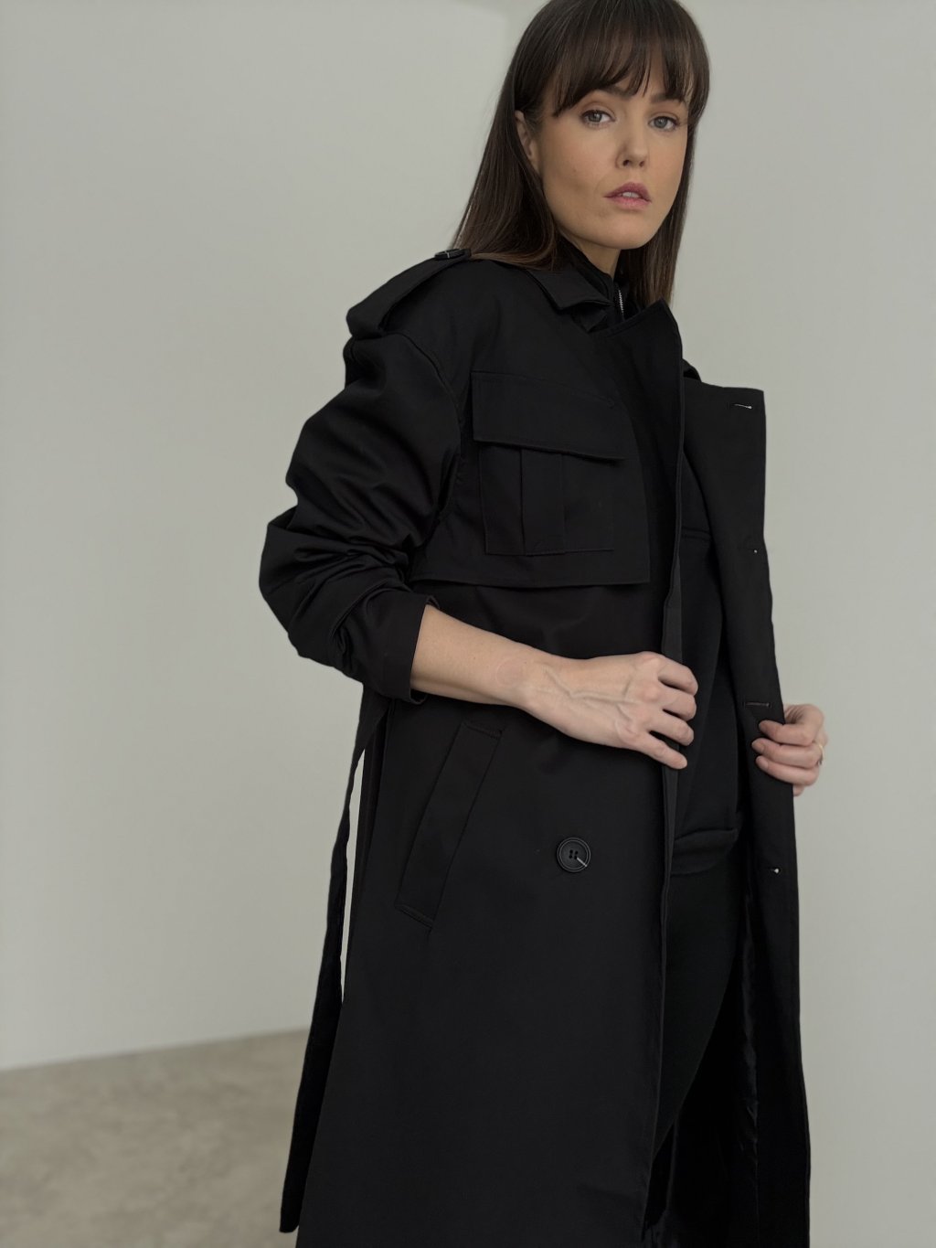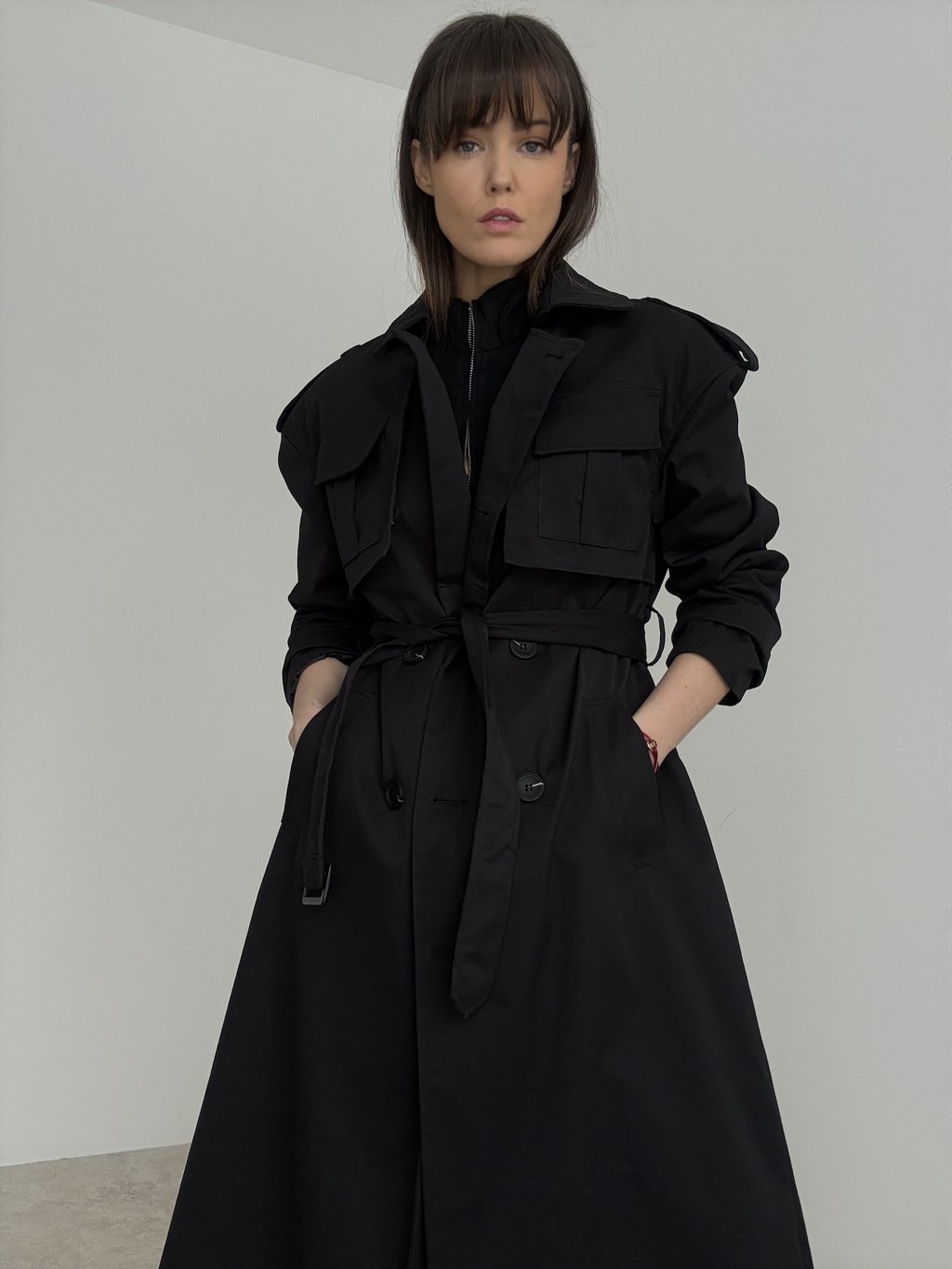 Tento trenčkot je výrazný, nadčasový kúsok, ktorý okamžite dodá outfitu mestský a upravený vzhľad. Má dlhší strih s prepracovanými detailmi, ktoré pôsobia moderne a zároveň prakticky. Zapínanie dopĺňa viazanie v páse, vďaka čomu si vieš siluetu krásne prispôsobiť – môžeš ho nosiť voľne otvorený pre ležérny efekt alebo stiahnutý pre zvýraznenie postavy. Nechýbajú ani funkčné vrecká a detailné spracovanie ramien, ktoré dodáva kabátu štruktúru a charakter. Je to ideálny doplnok na prechodné obdobie, keď chceš vyzerať elegantne, no stále sa cítiť pohodlne. Skvelo vyzerá s rifľami, šatami aj s kompletom v minimalistickom štýle.