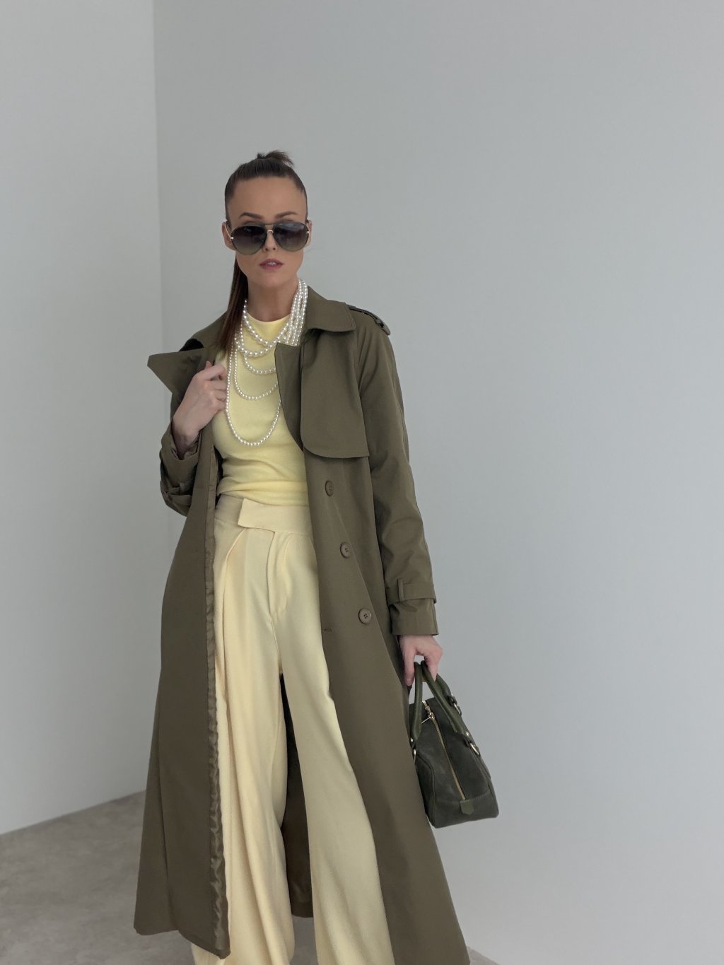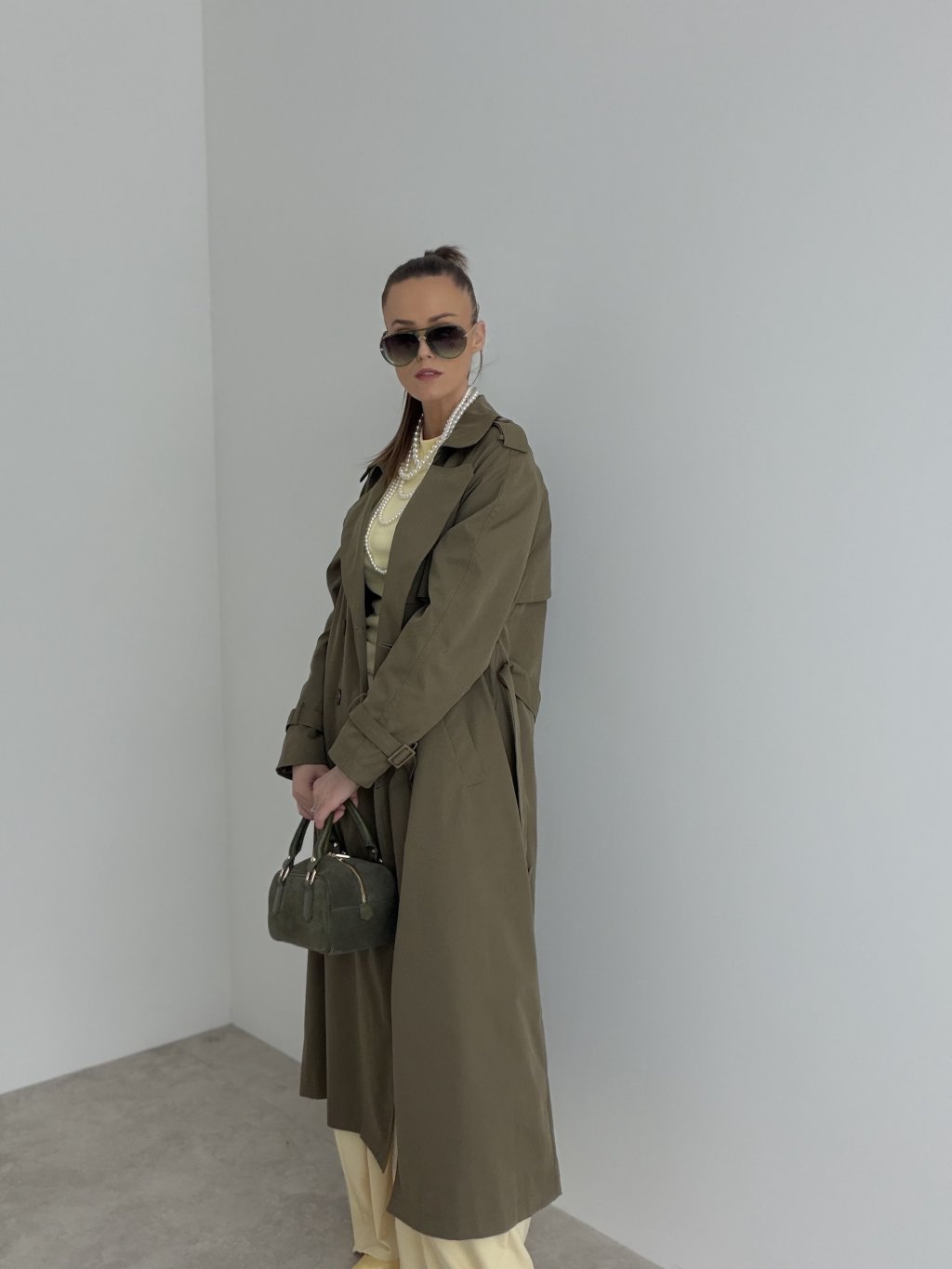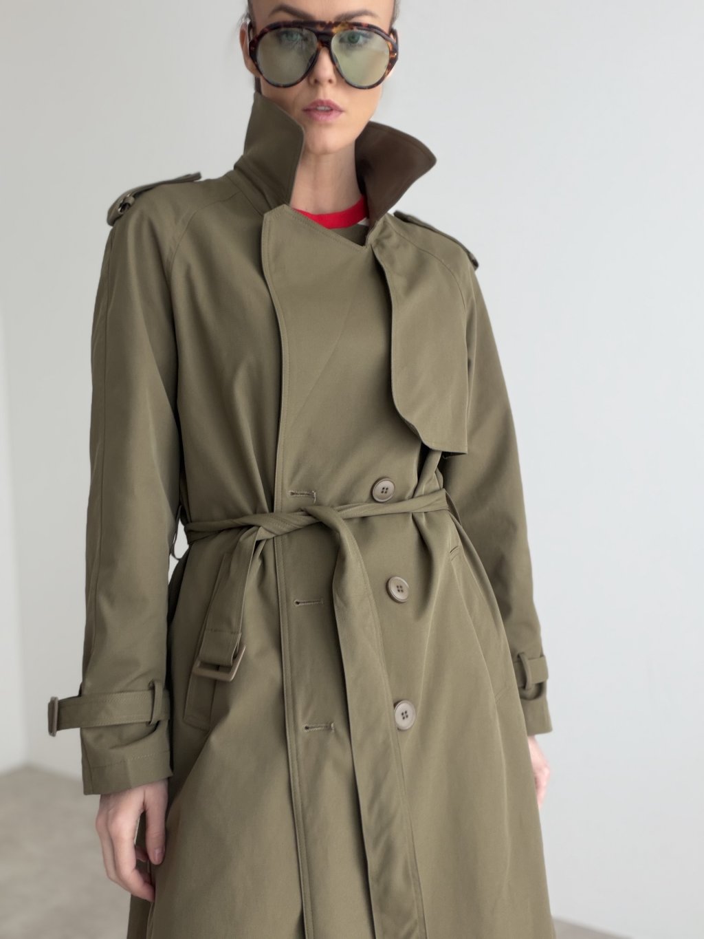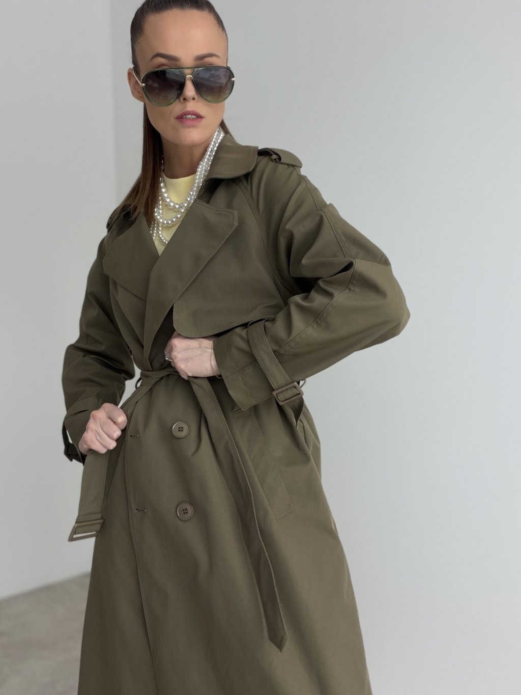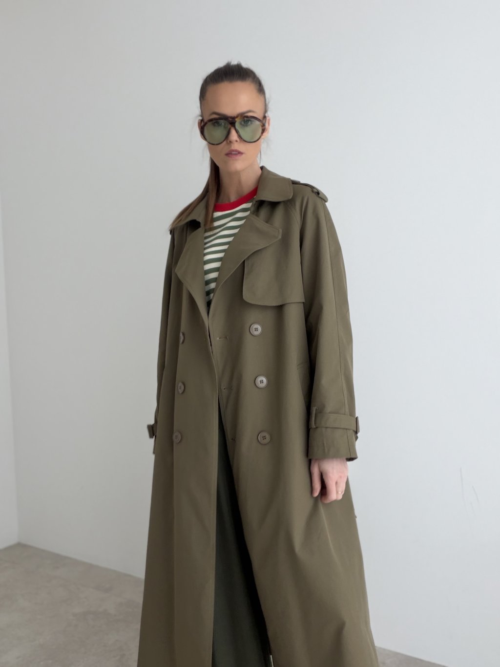 Dlhý trenčkot s dvojradovým zapínaním, klopami a detailmi na ramenách aj rukávoch. Nadčasový kabát do mesta aj do práce.