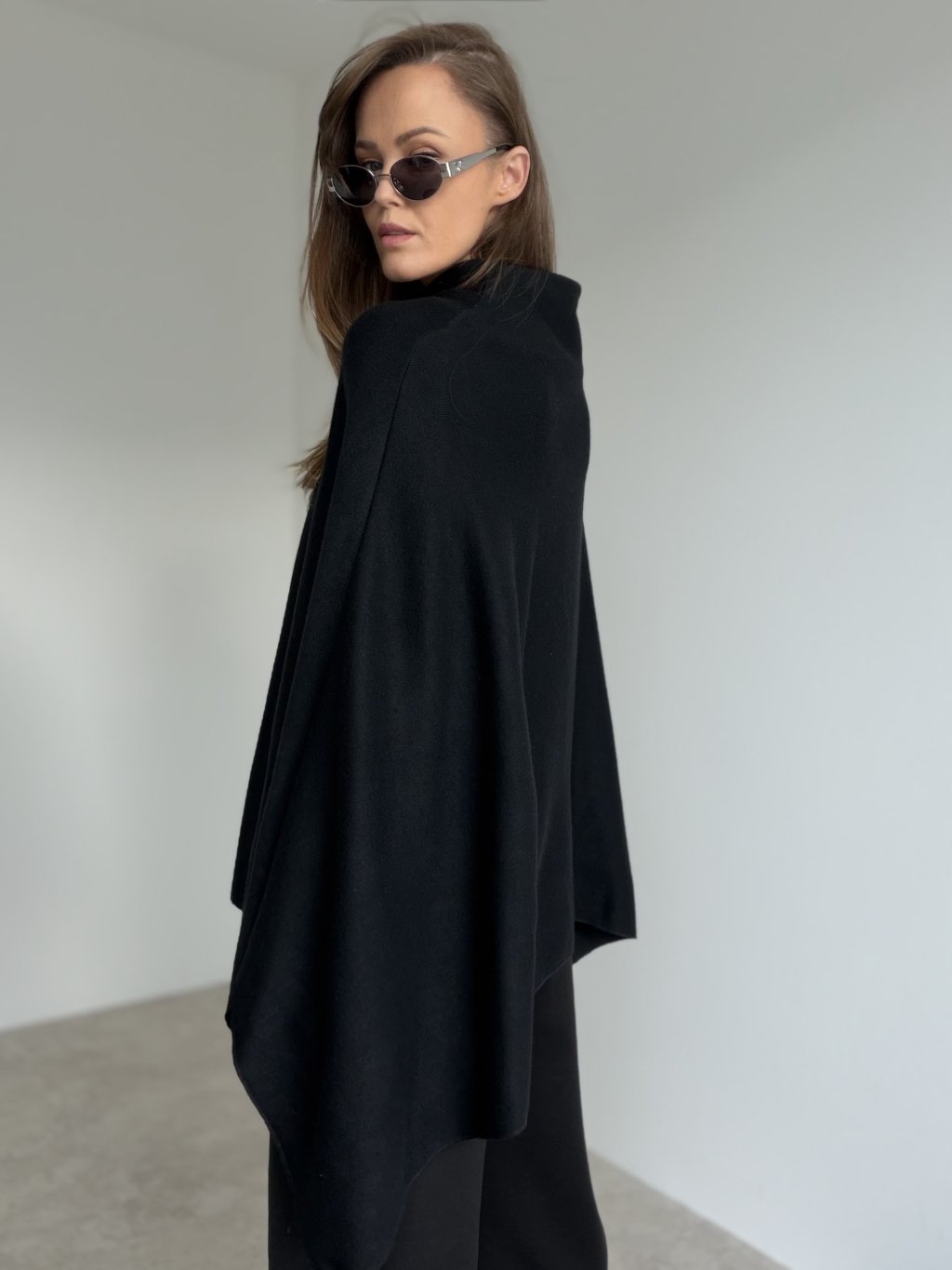 Splývavé úpletové pončo s vyšším golierom a pohodlným voľným strihom, ideálne na vrstvenie.
