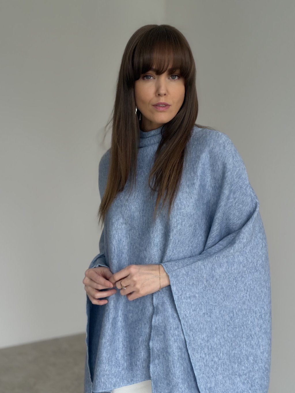 Úpletové pončo s voľnou siluetou, ktoré vytvára elegantný, splývavý efekt a zároveň poskytuje príjemné teplo. Vyšší golier pôsobí čisto a moderne, zatiaľ čo široké prevedenie necháva vyniknúť vrstveniu a pohybu materiálu. Strih je komfortný, neobmedzuje a krásne zjemní celkový outfit – či už ho skombinuješ s nohavicami, sukňou alebo šatami. Pončo je ideálne na prechodné obdobie aj chladnejšie dni, keď chceš vyzerať upravene a zároveň sa cítiť pohodlne.